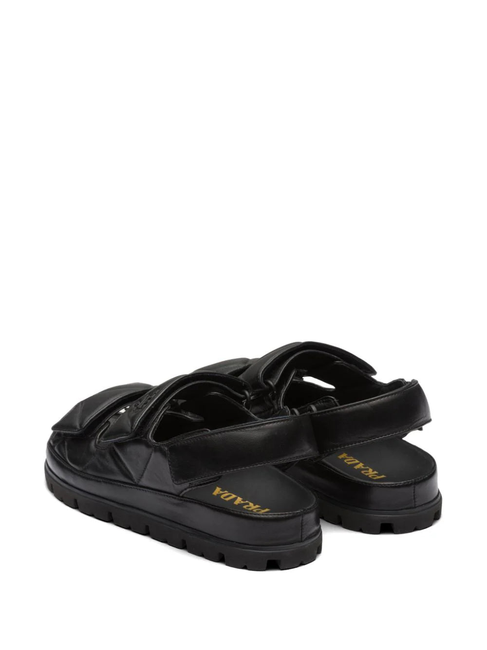 Prada's signature triangle logo is reworked into stitched quilting on the straps of these leather sandals. A ridged rubber sole adds traction and comfort to the design.