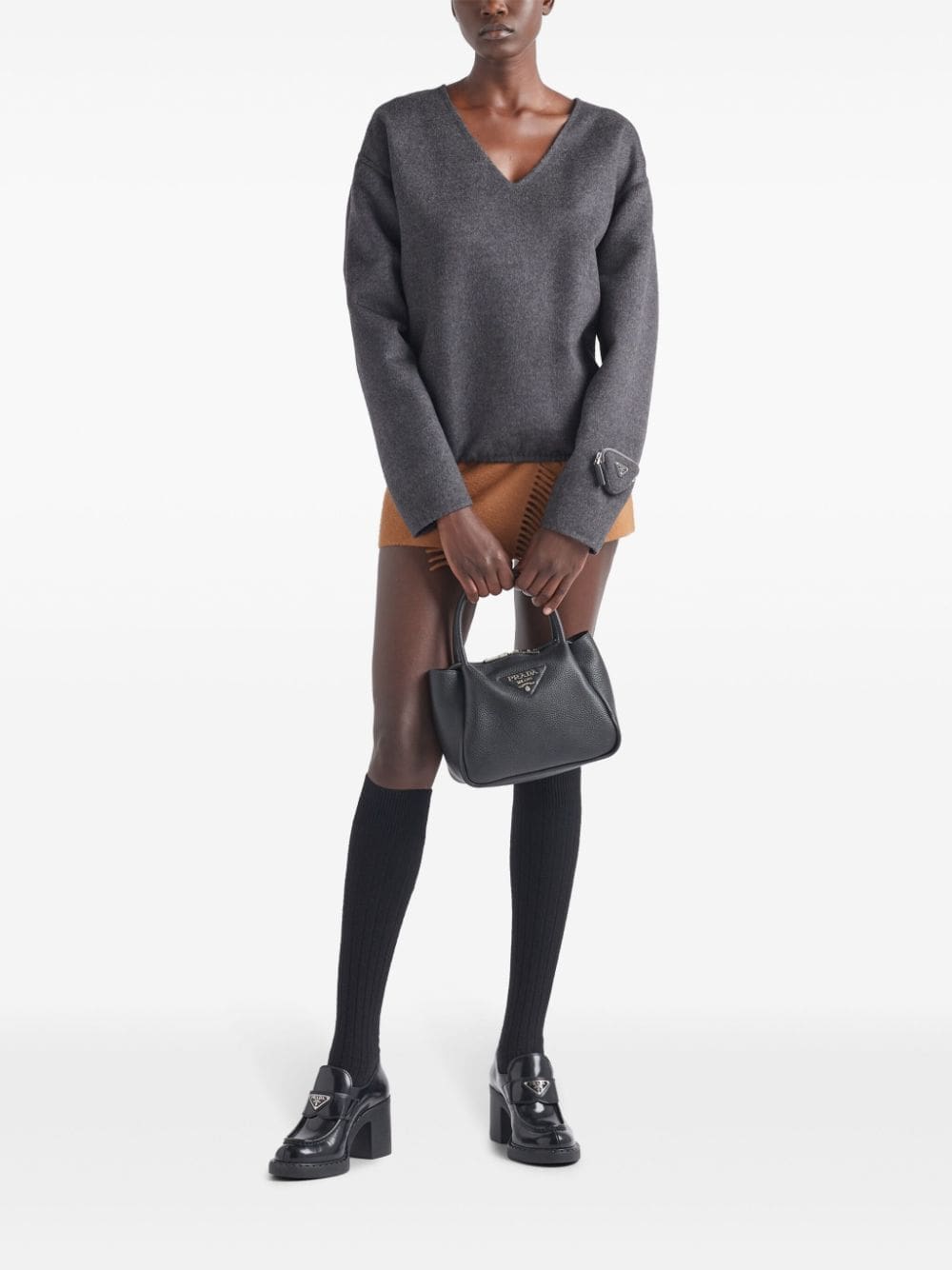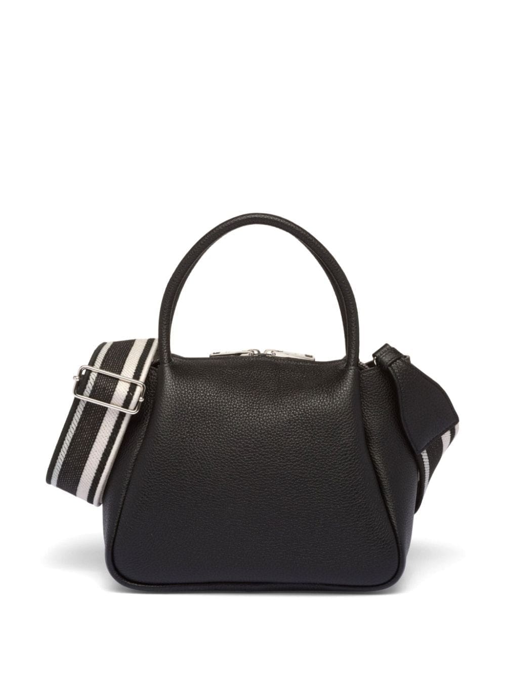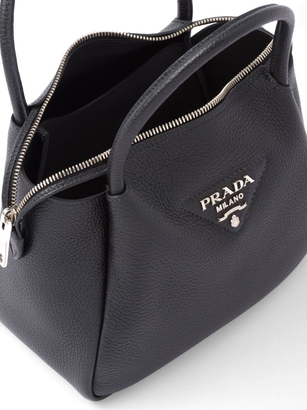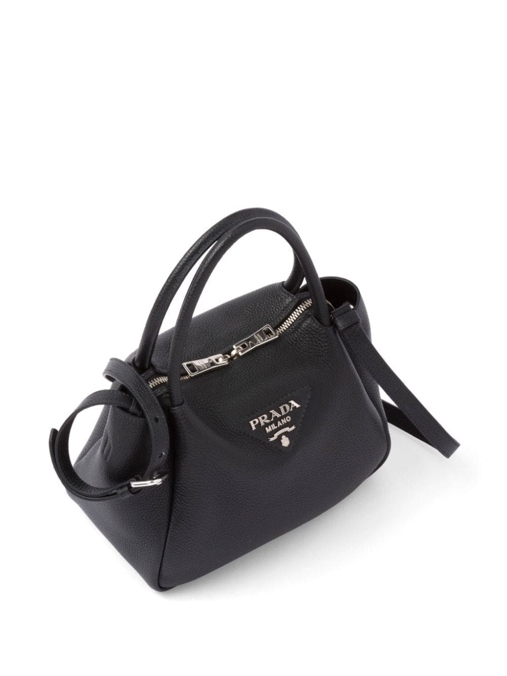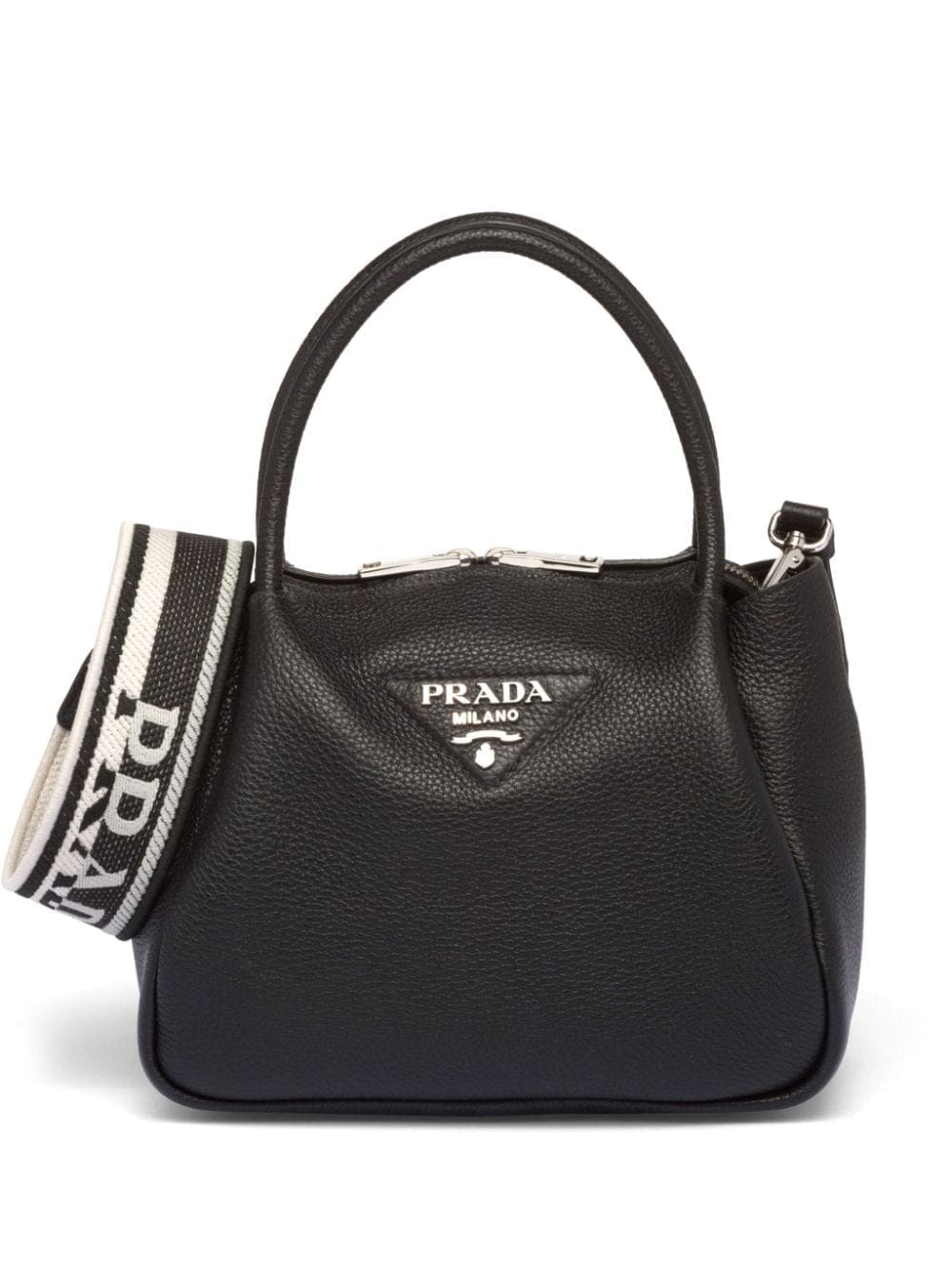 Focusing on versatility, Prada's SS23 bag line includes expertly crafted pieces with multiple styling options. A fine example is this black top-handle bag: crafted from grained leather, the accessory features a thin leather shoulder strap and a fabric-made logo-jacquard option.