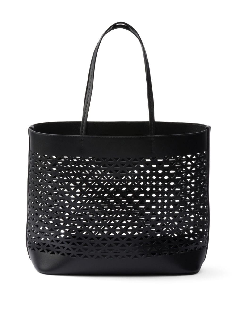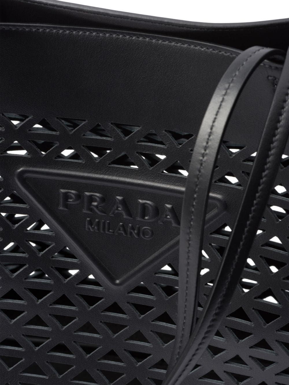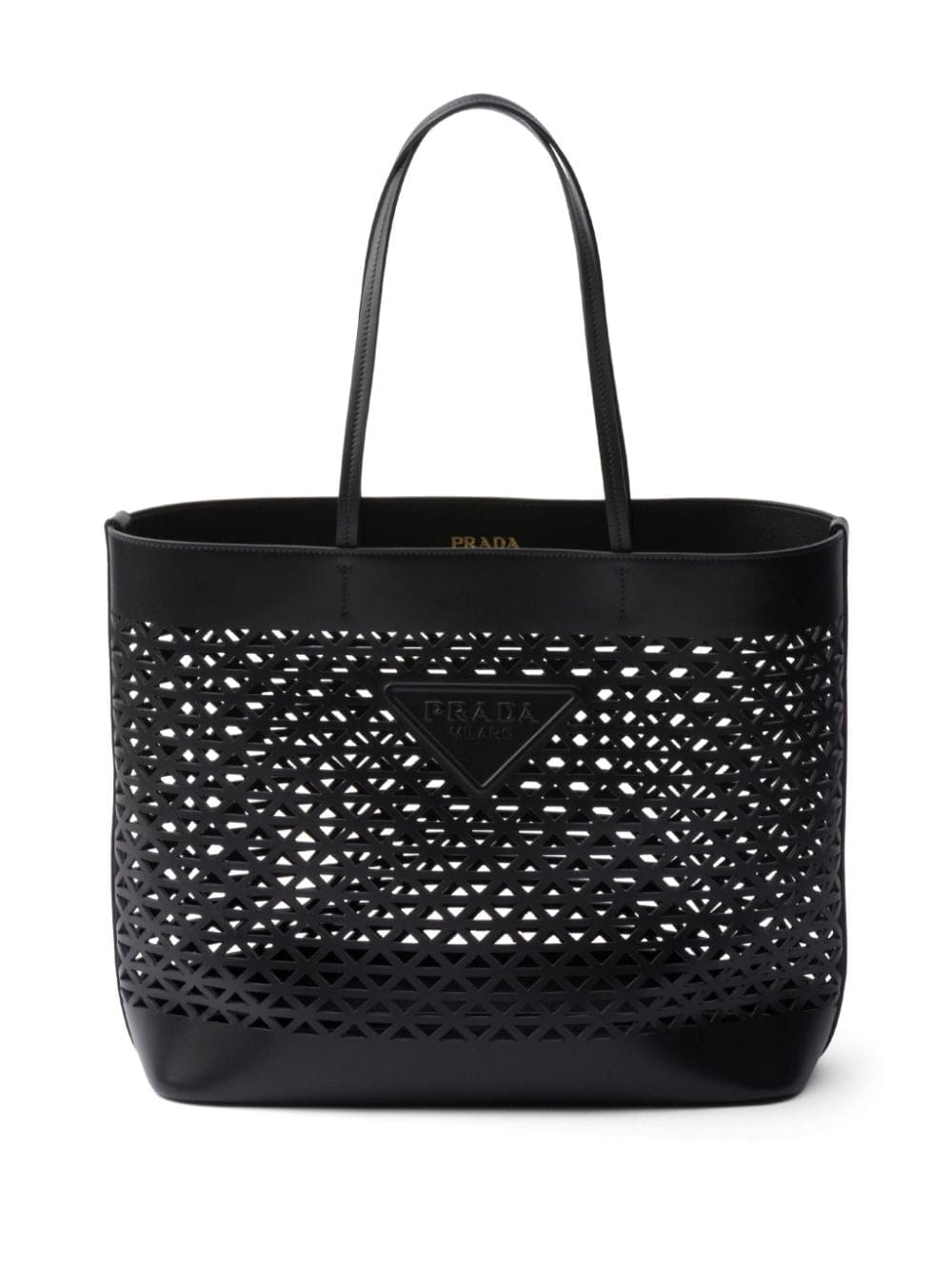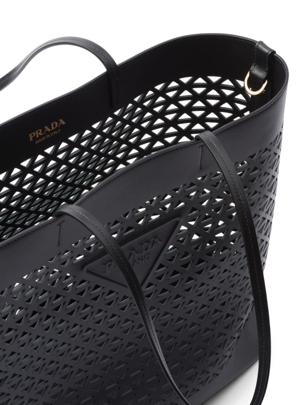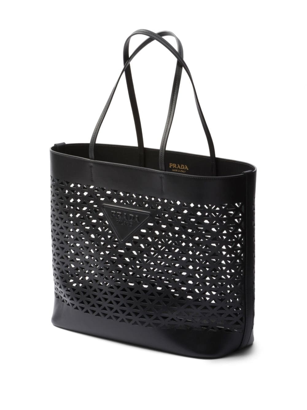A symbol of quality, craft and luxury, the unmistakable triangle logo was created by Mario Prada in 1913 at a time when the maison was the official supplier of the Italian Royal Household. Today, the element adorns many of Prada's creations, such as this leather tote bag: it is placed on the front of the silhouette as an appliqué and also repeated in a perforated pattern.