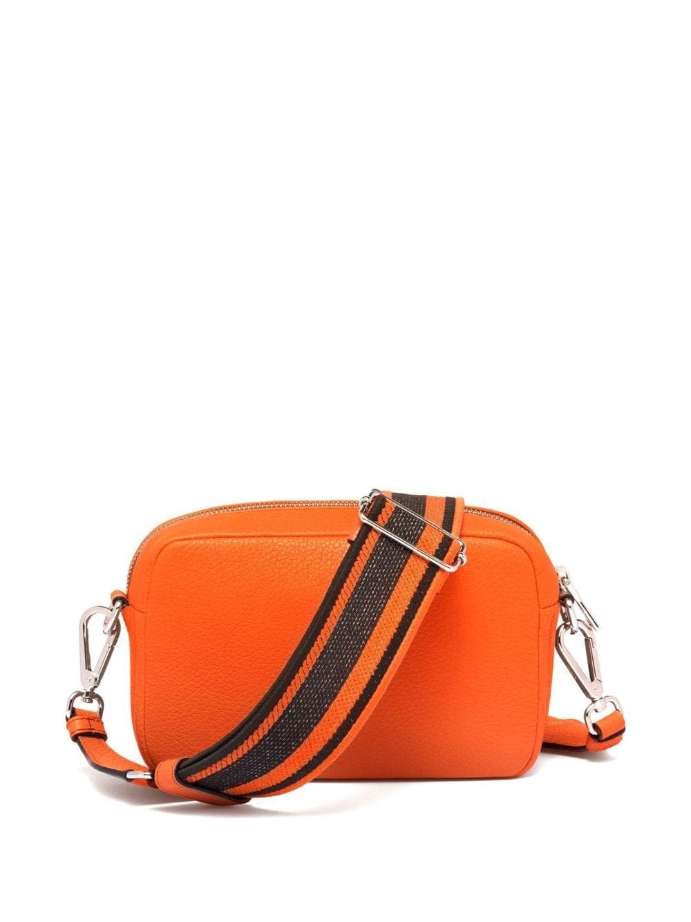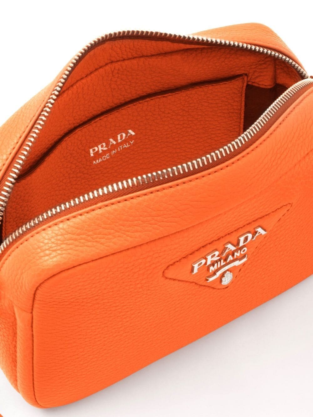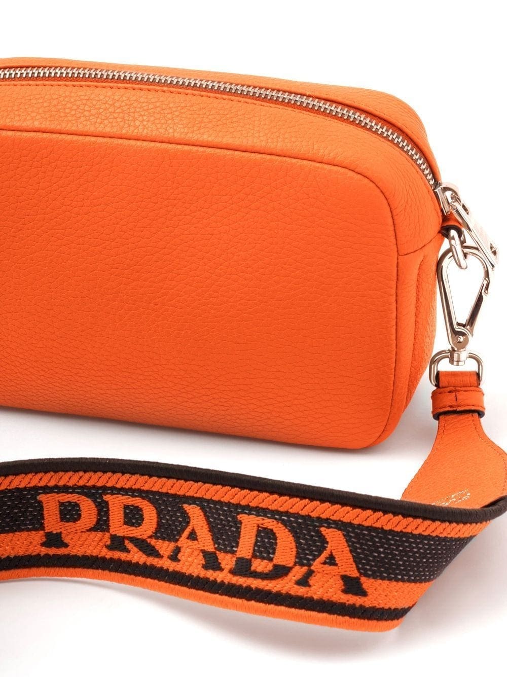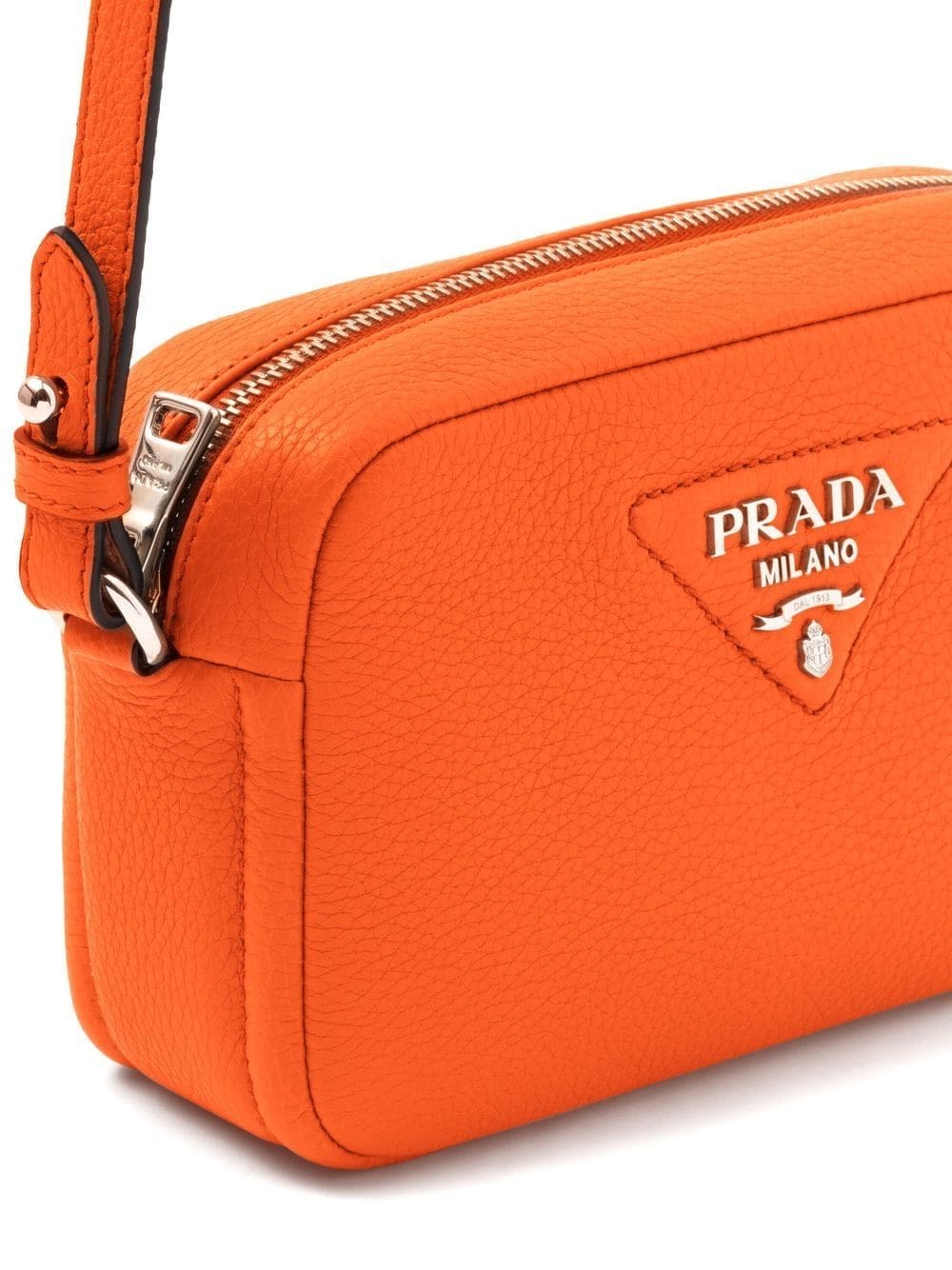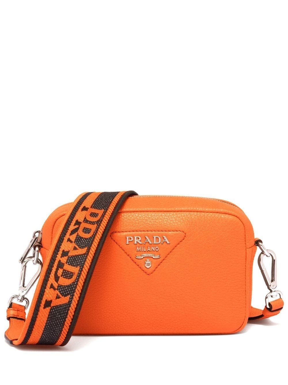 orange calf leather grained texture triangle logo silver-tone hardware top zip fastening adjustable detachable shoulder strap