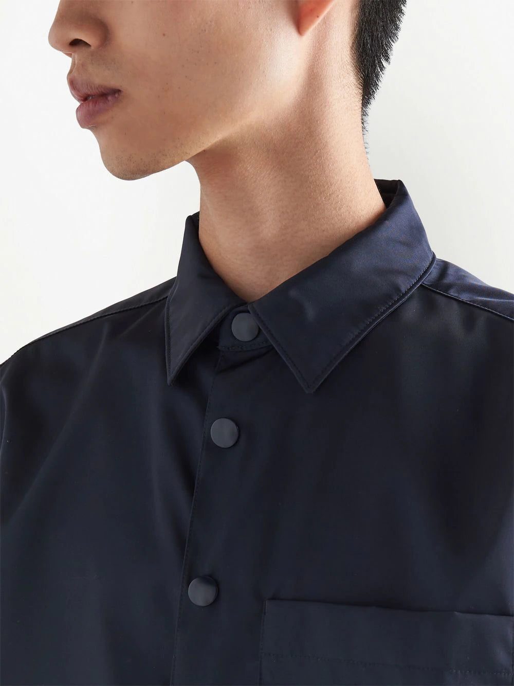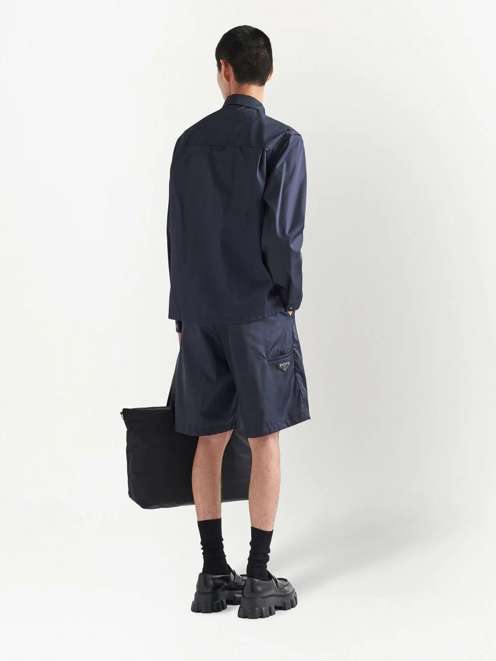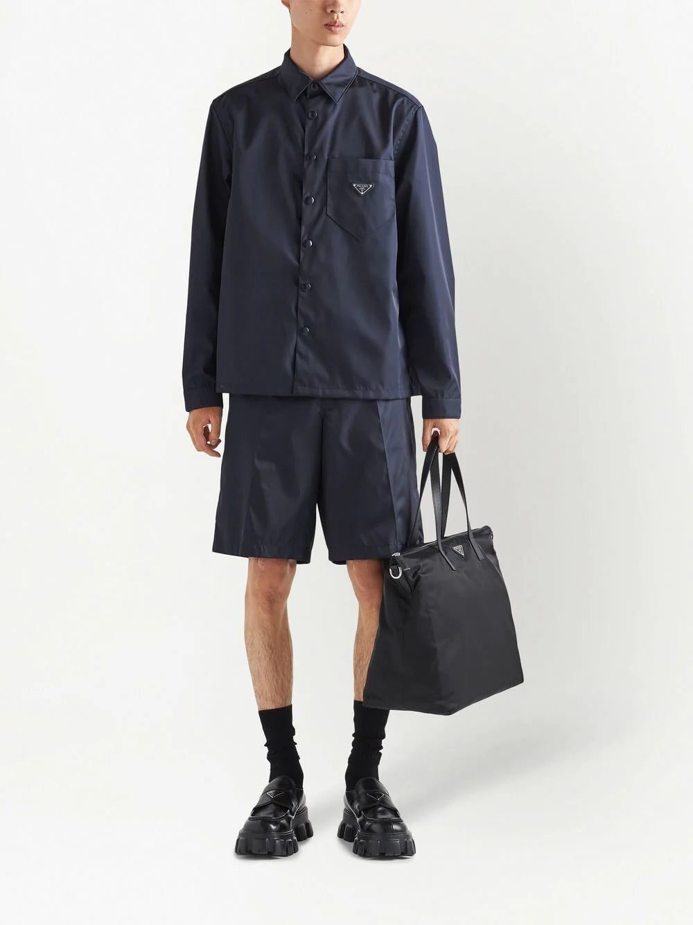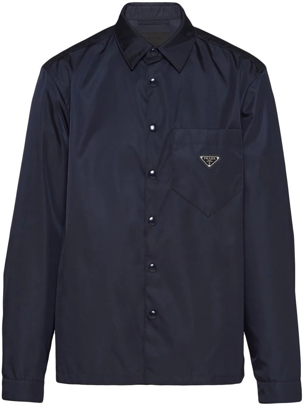 Prada's iconic triangle logo plaque was first used within the brand in 1913 and takes centre stage against this blue shirt for AW22.