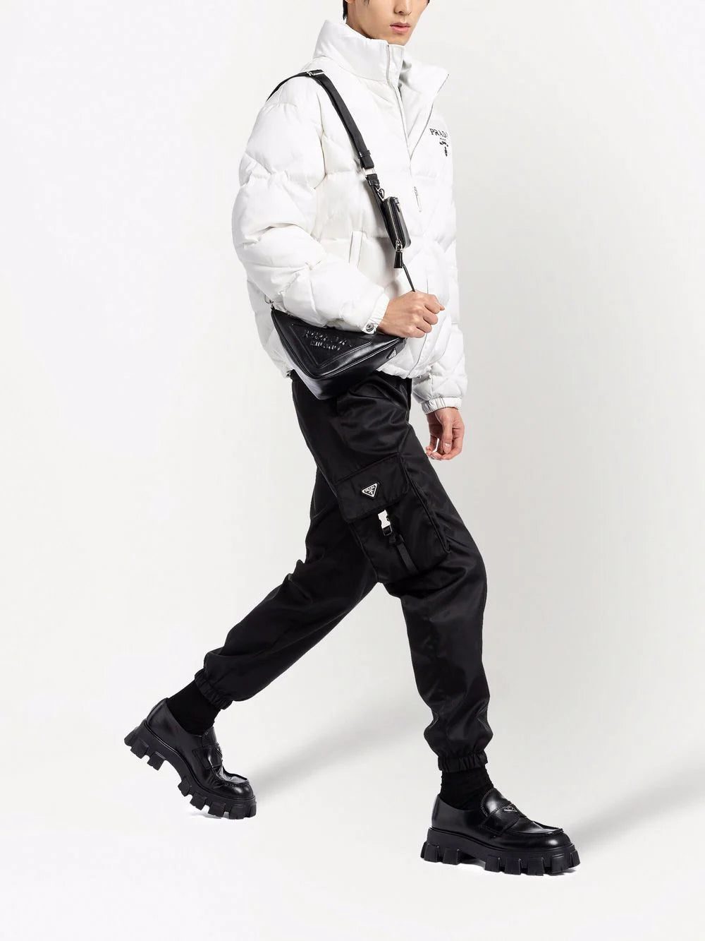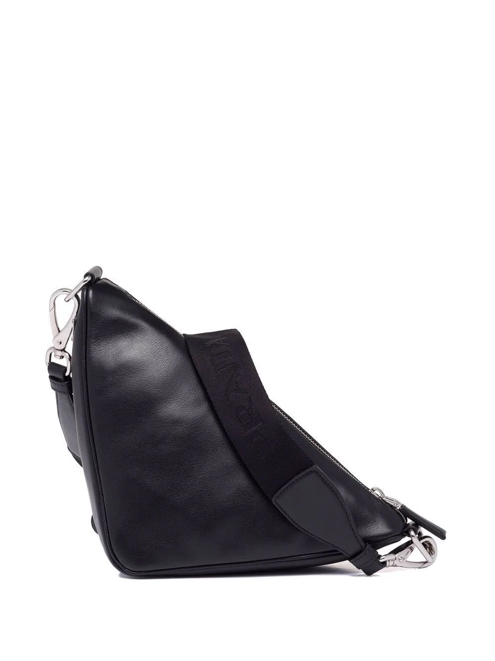 The triangular shape of this Prada shoulder bag demonstrates the geometric slant the label incorporates into its SS22 accessories collection. Minimal branding in the form of a tonal debossed logo and plaque further enhances the sleek lines of this piece.