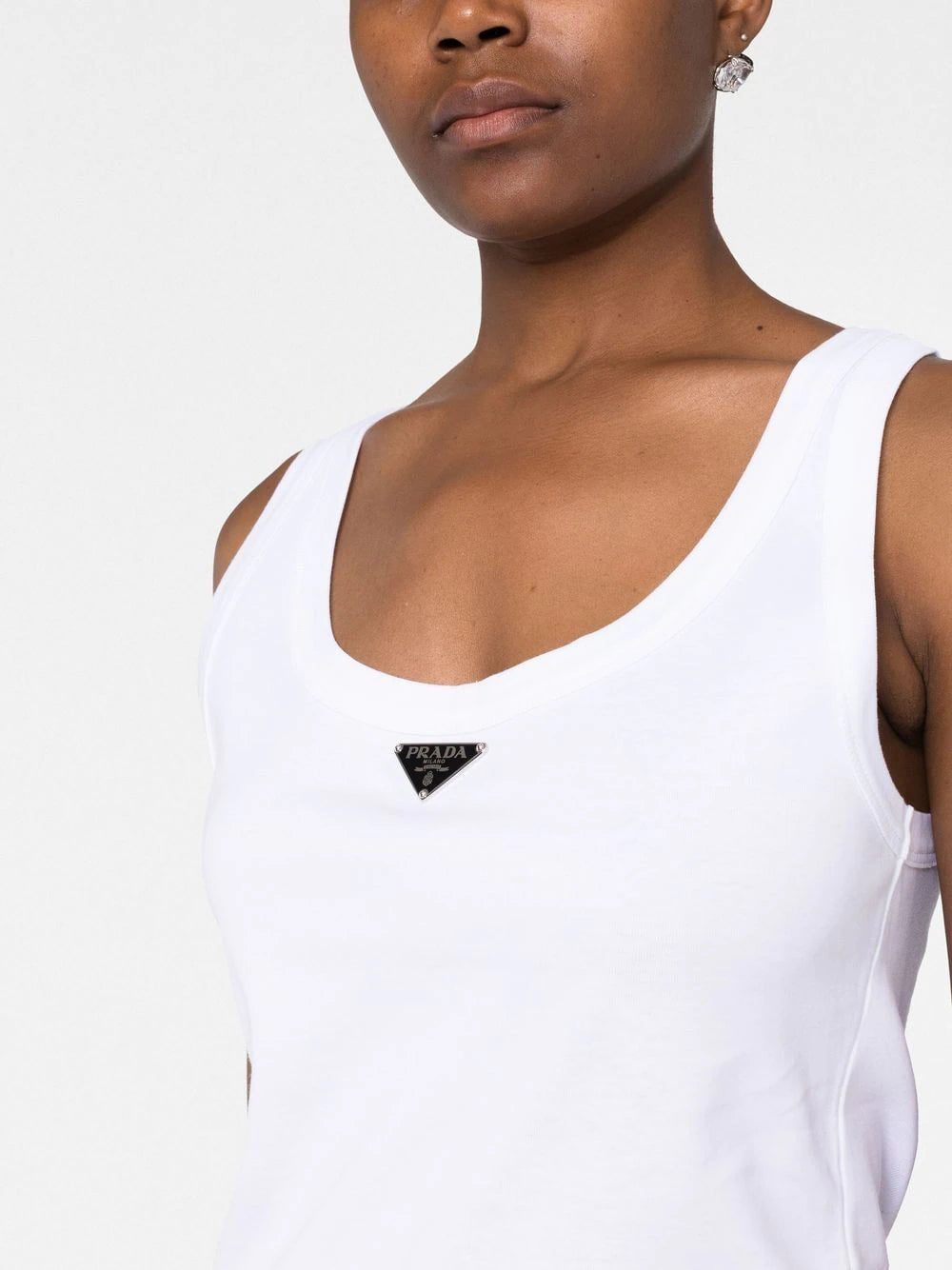 logo-plaque sleeveless vest top from PRADA featuring white, cotton, enamel triangle logo, square neck, sleeveless and straight hem.