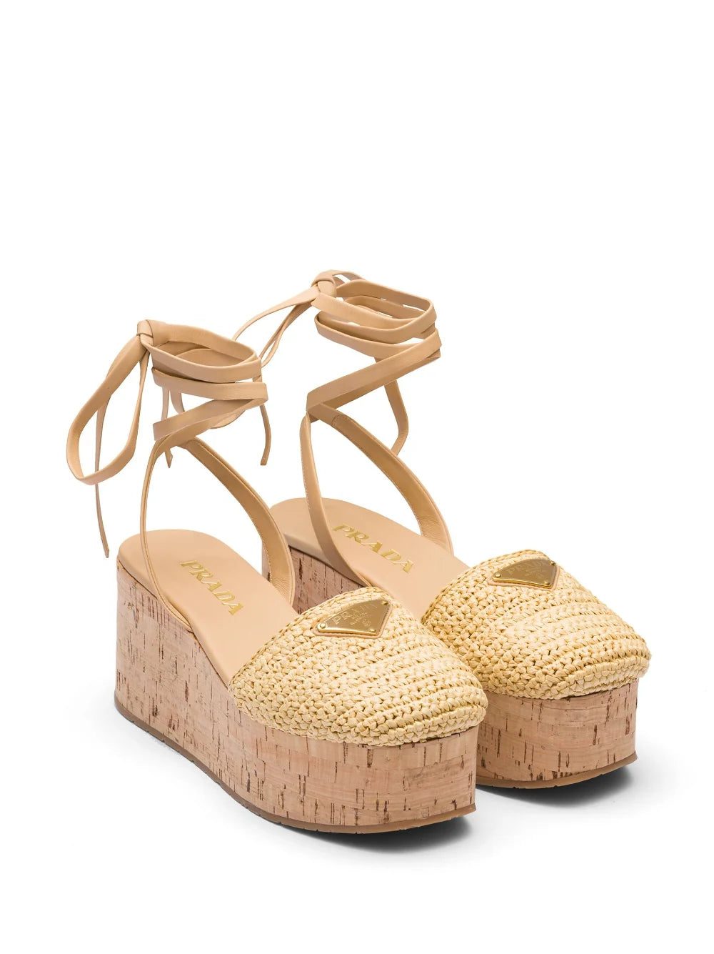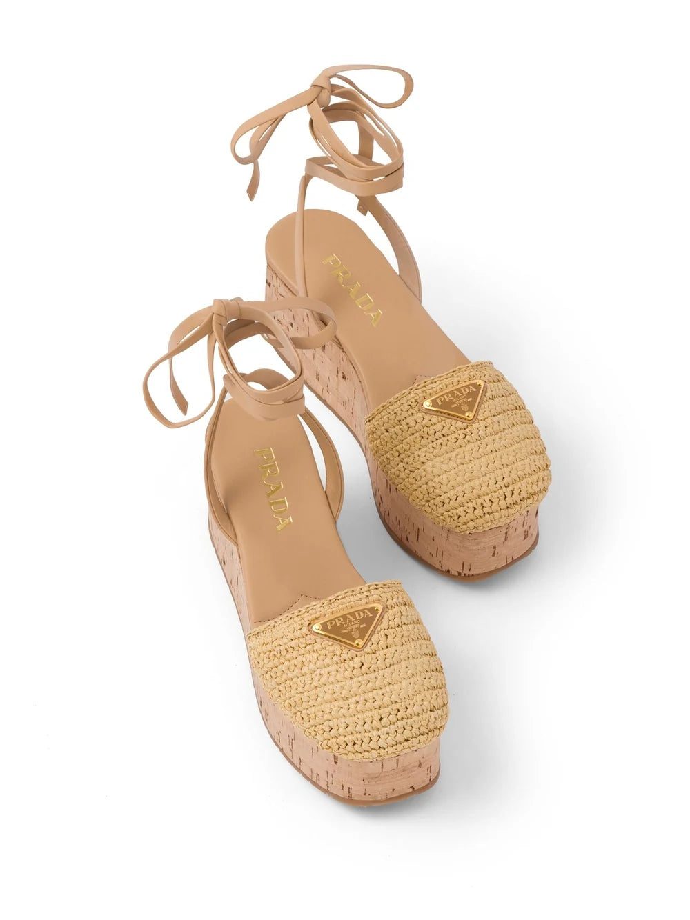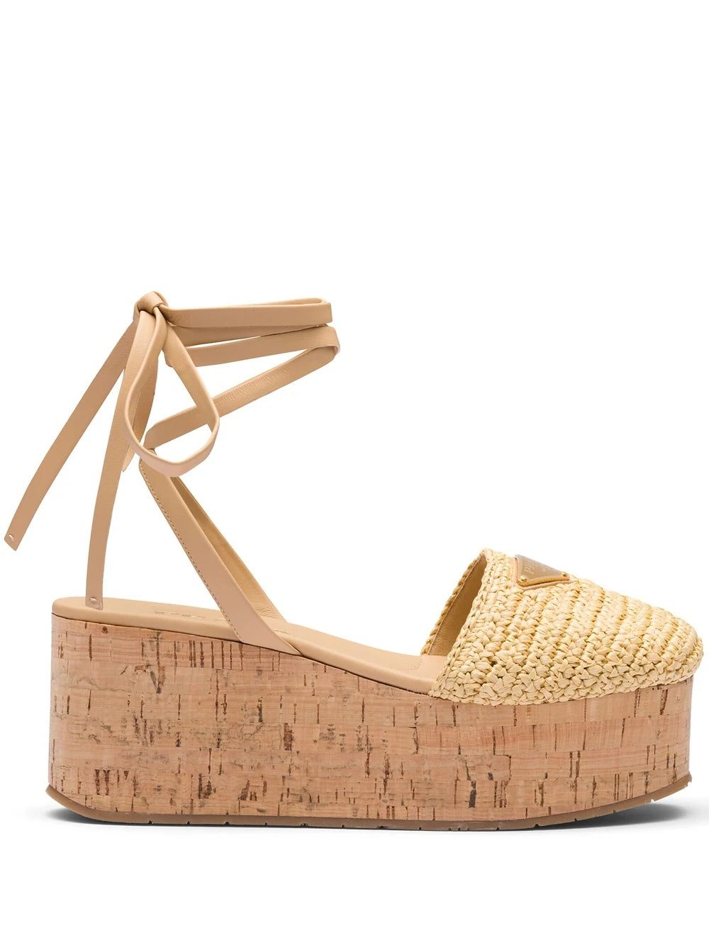 Prada's update on a beloved noughties silhouette, these wedge sandals are crafted with a woven raffia upper that's punctuated by a gold-tone logo plaque. The cork platform heel and lace-up fastening stay true to original designs.