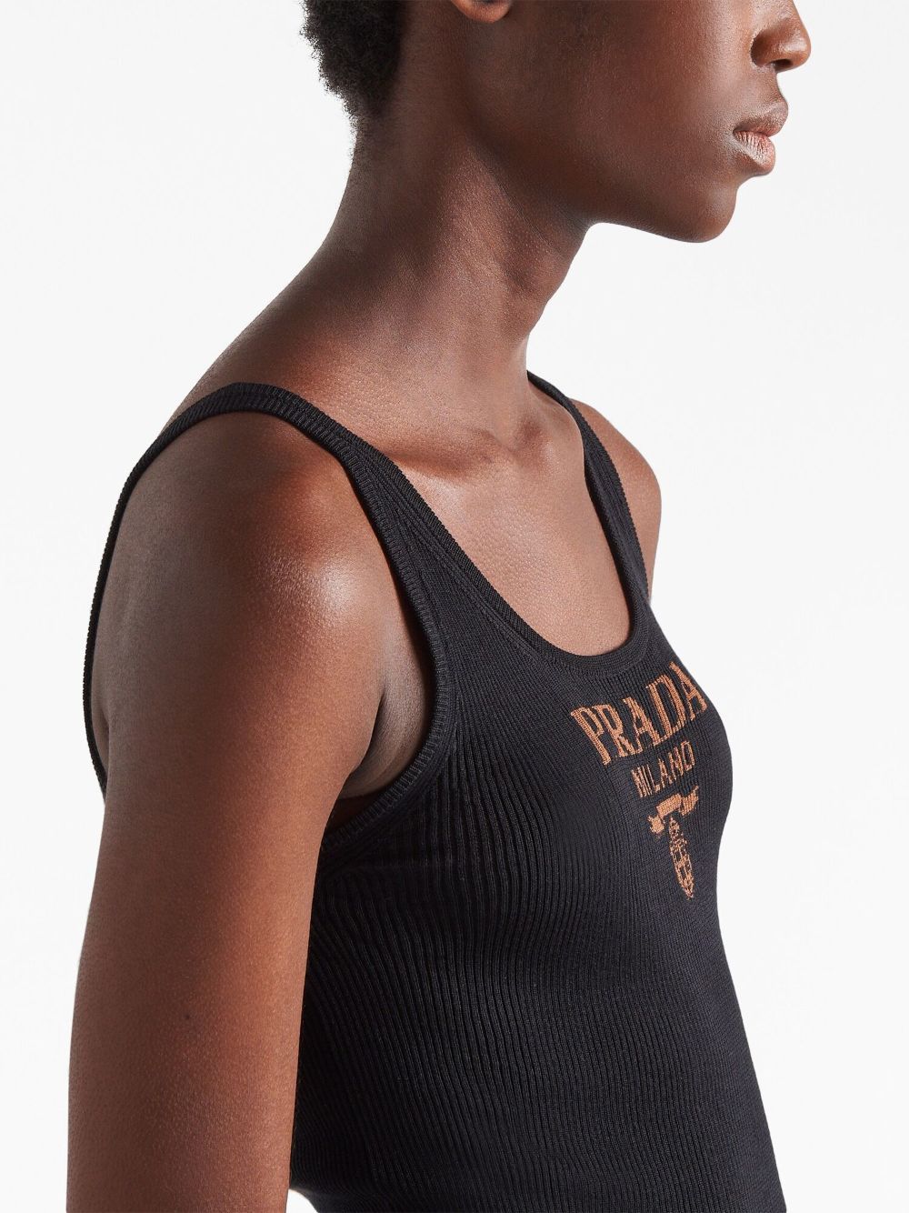 Prada features the wordmark first used in 1919 at the front of this top, in a contrasting colourway. Paired with a round neck and sleeveless silhouette, it highlights the minimalist and modern style of the brand, whilst referencing its heritage.