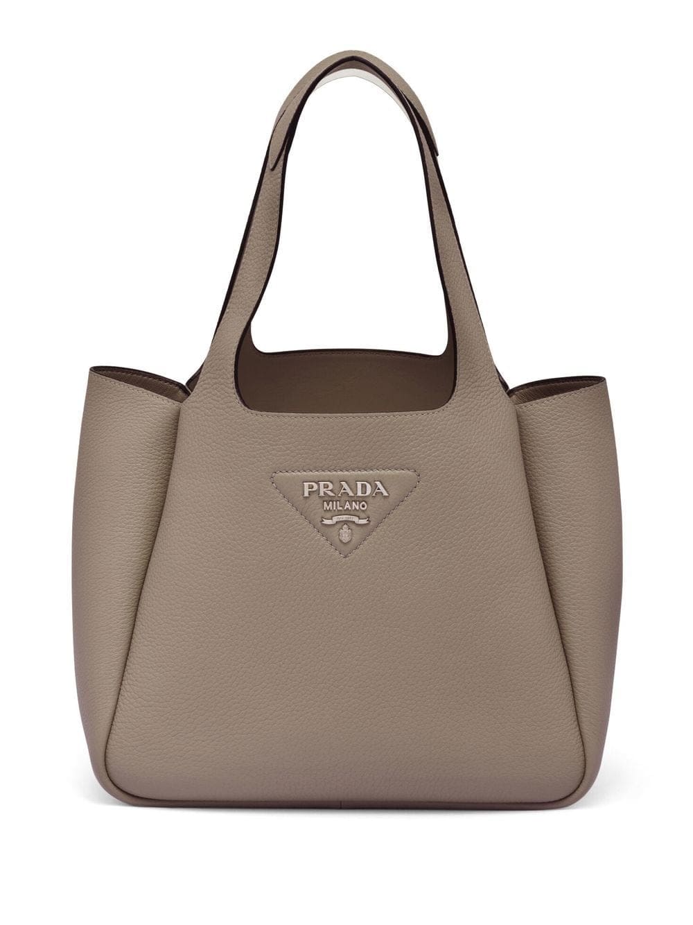 clay brown leather triangle logo silver-tone logo lettering cut-out top handle open top