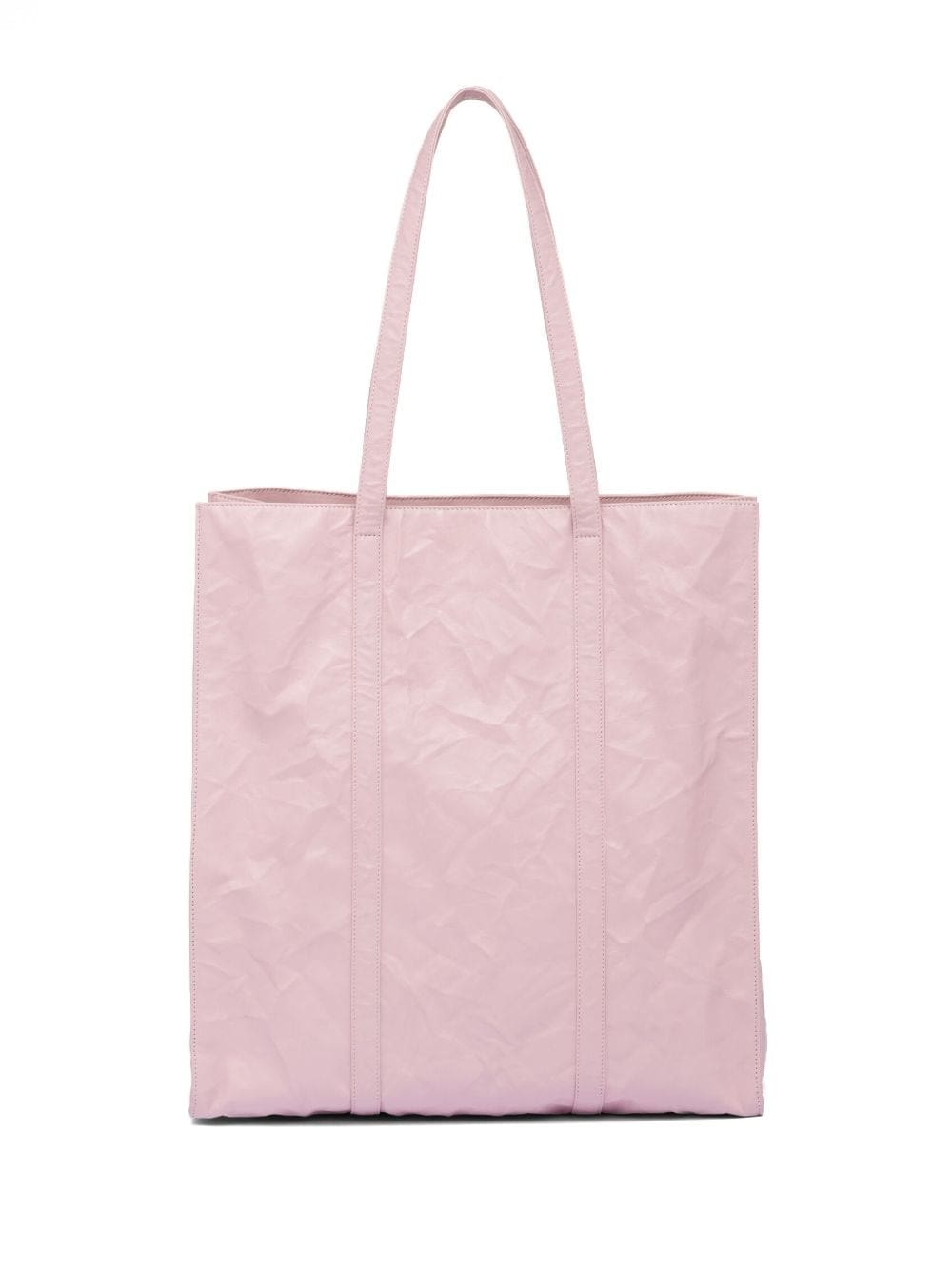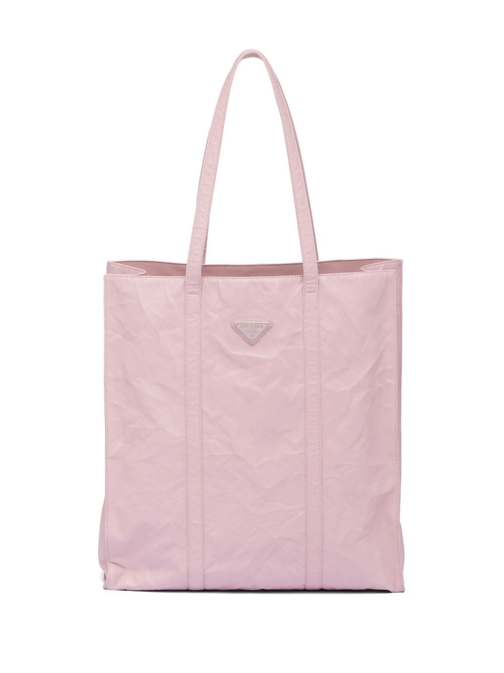 medium crinkled tote bag from PRADA featuring light pink, nappa leather, crinkled finish, flat top handles, silver-tone hardware, enamel triangle logo, open top and internal zip-fastening pocket.