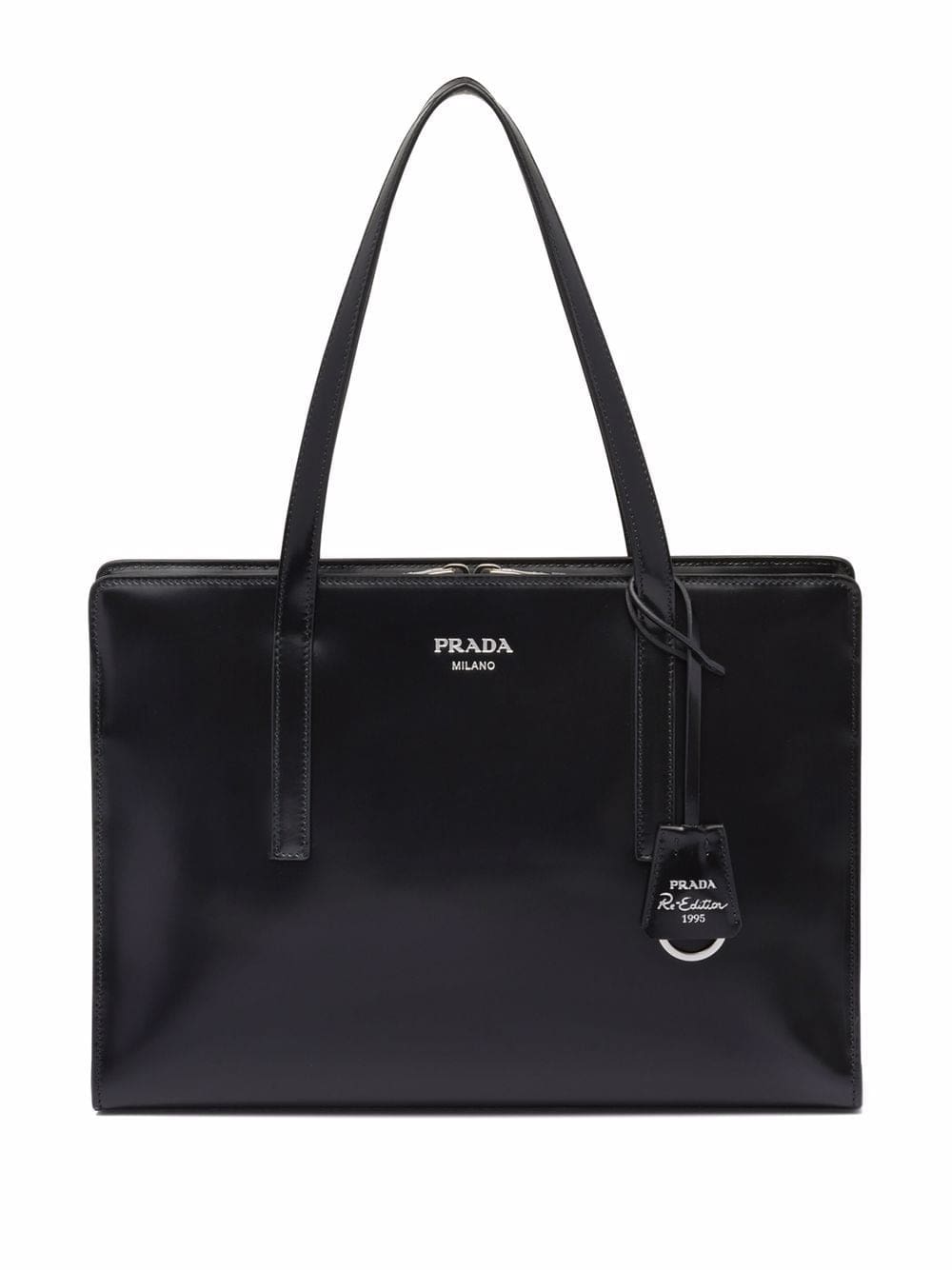 A structured silhouette creates a refined look for this Re-Edition 1995 tote bag from Prada. Understated logo detailing speaks to the brand's focus on construction over bold branding.