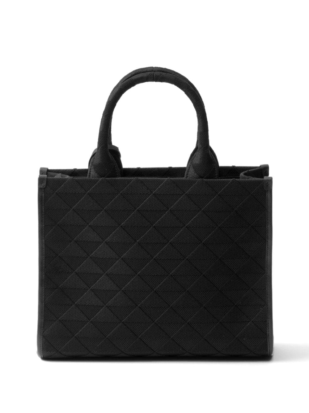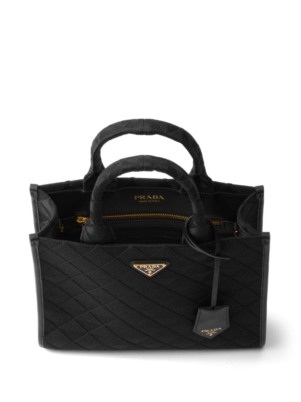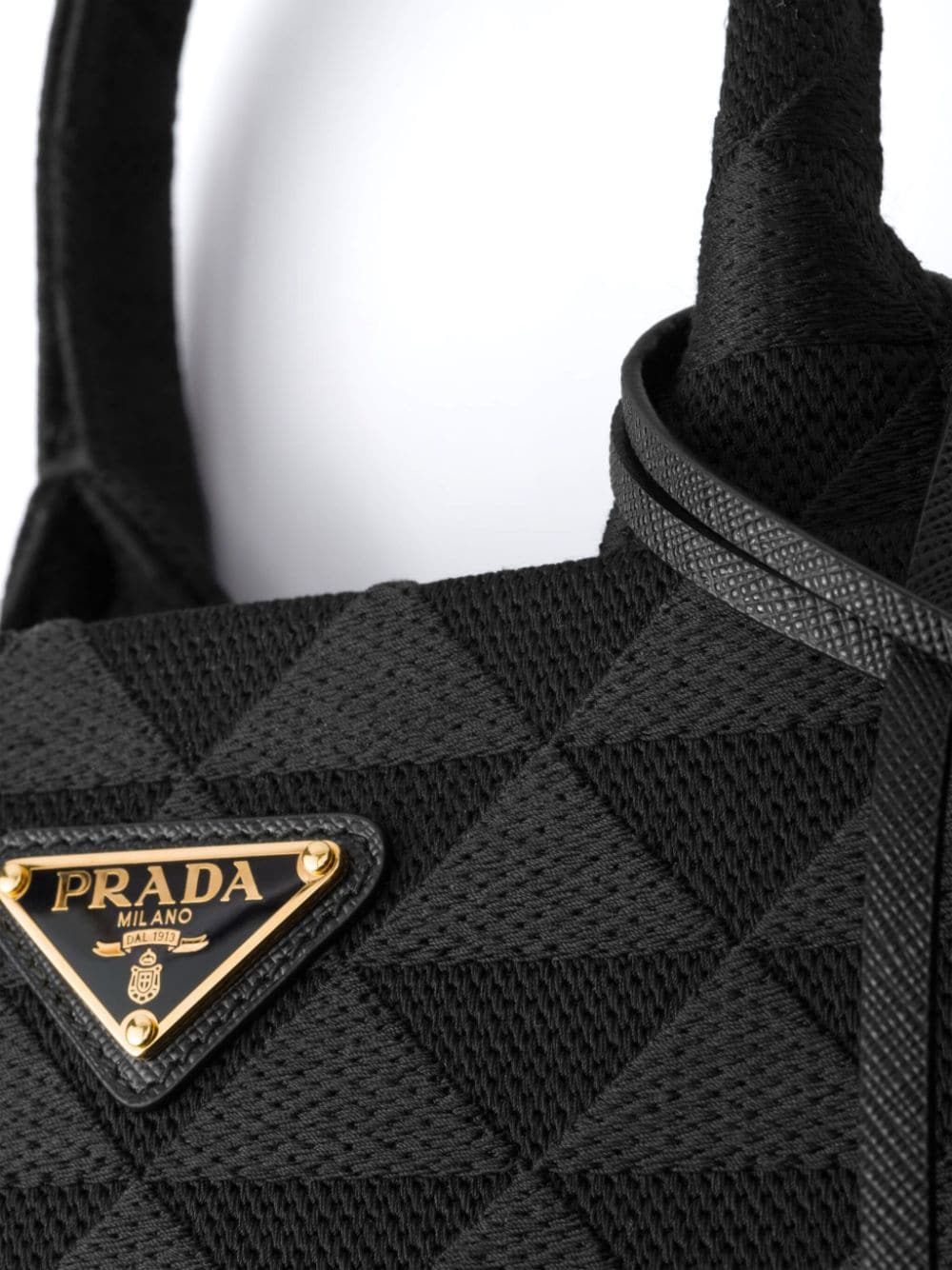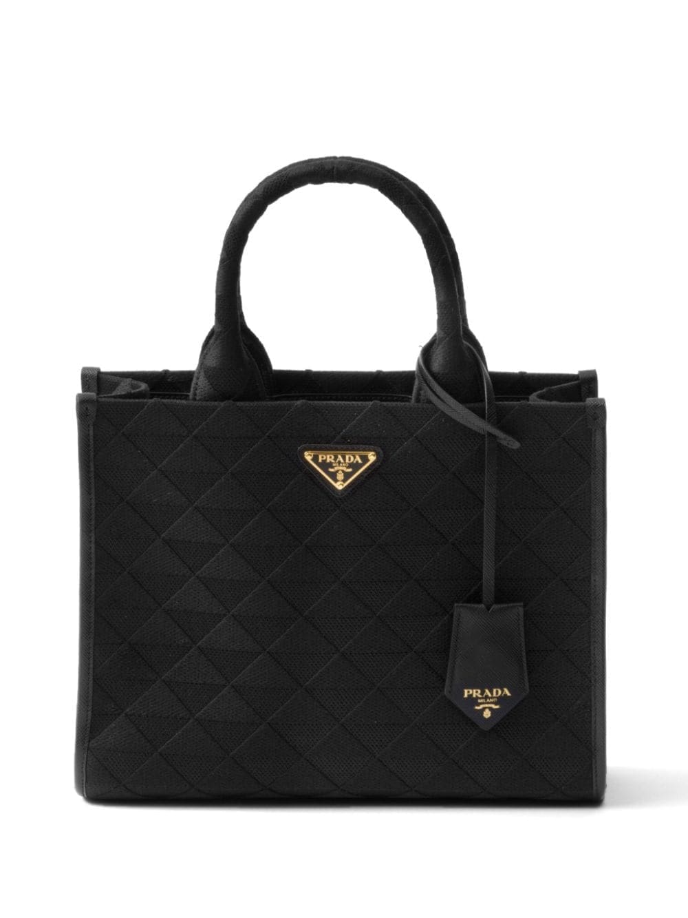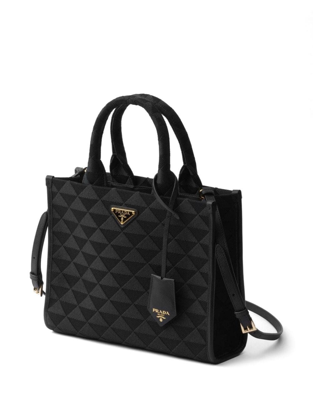 A symbol of quality, craft and luxury, the unmistakable triangle logo was created by Mario Prada in 1913 at a time when the maison was the official supplier of the Italian Royal Household. Today, the element adorns many of Prada's creations, such as this leather tote bag: it is placed on the front of the silhouette in its enamelled version and also repeated in a jacquard pattern.