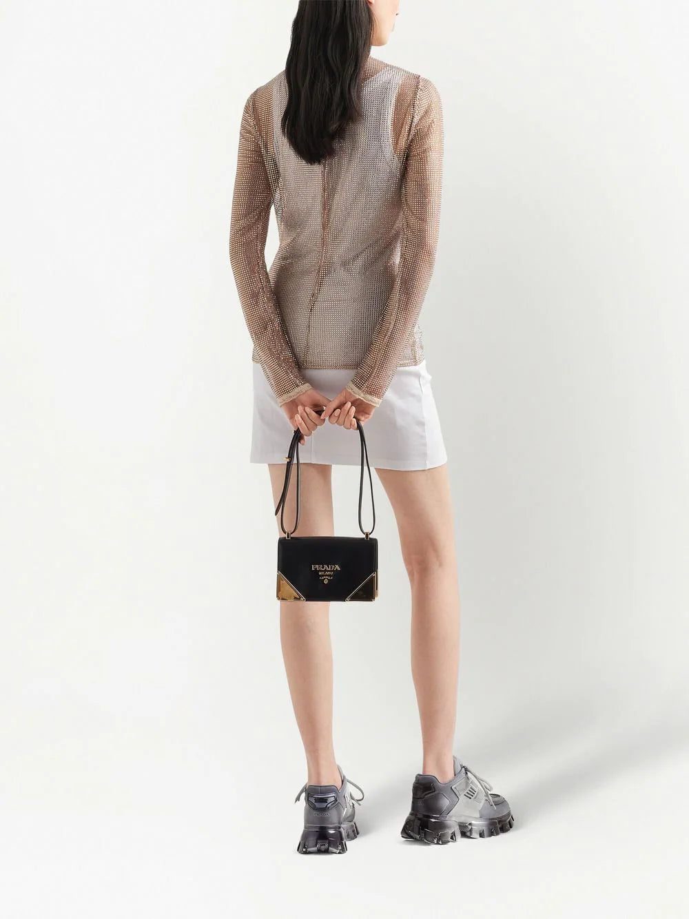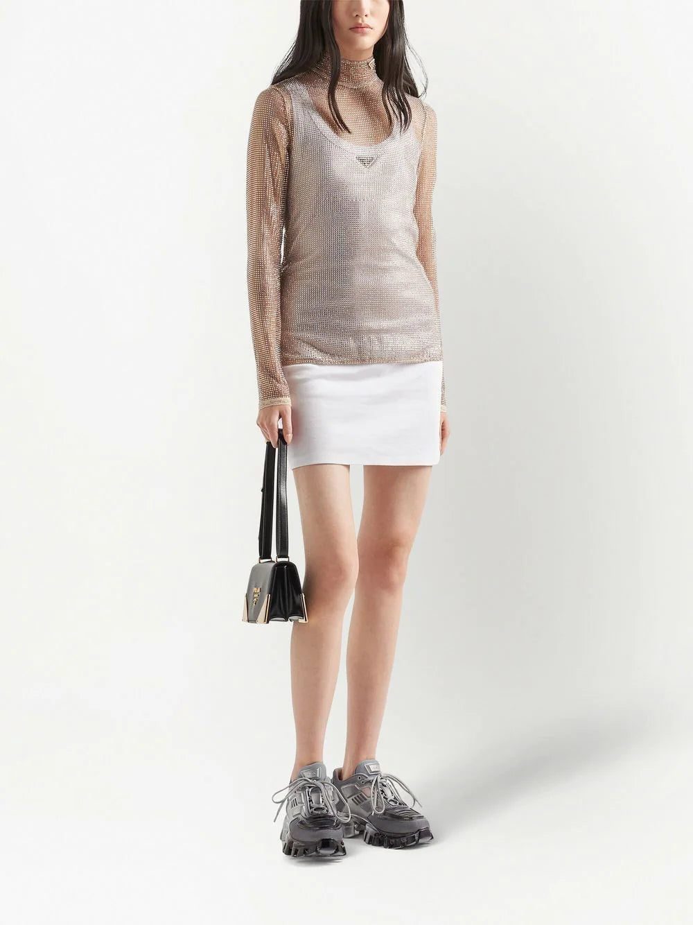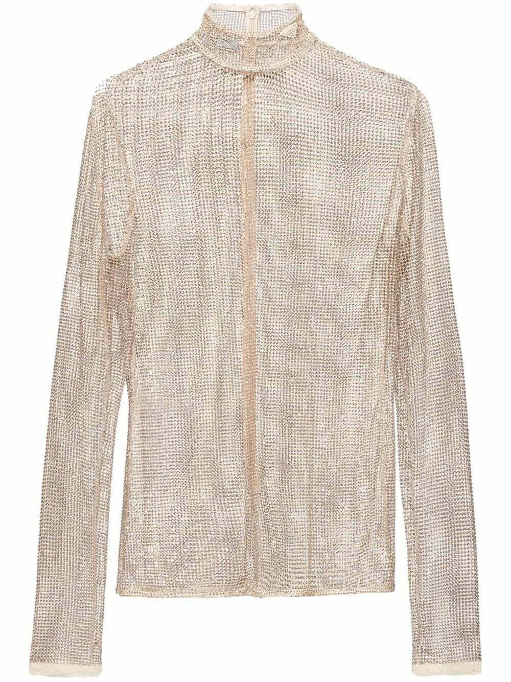 Showing off the brand's sophisticated approach, this mesh top from Prada's AW22 collection is covered in sparkling rhinestones. Its design features a high-neck, enhanced with a triangle logo made of enamelled metal.