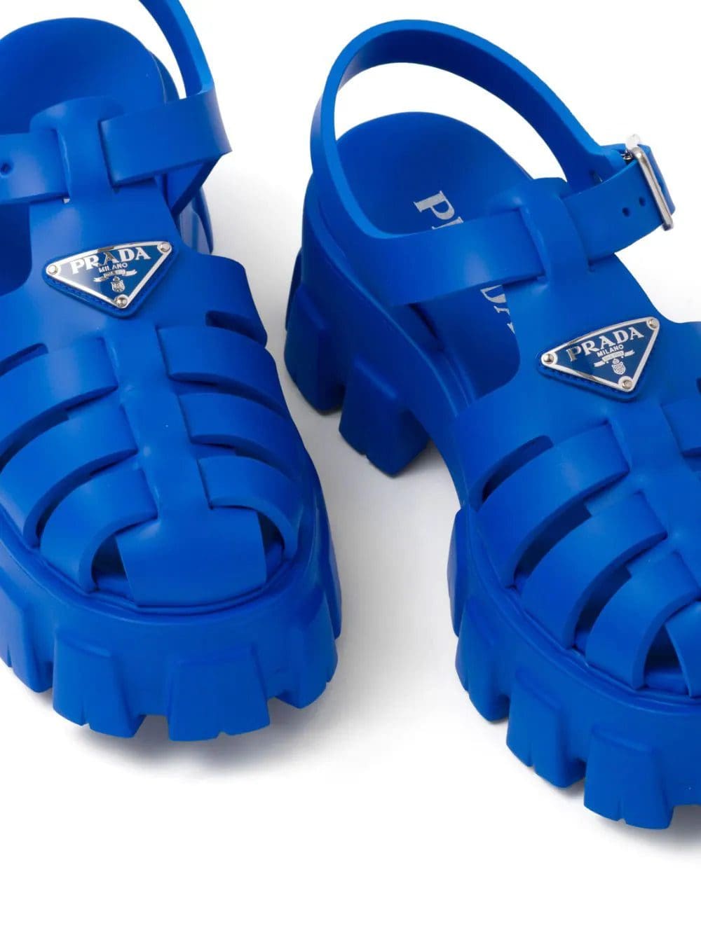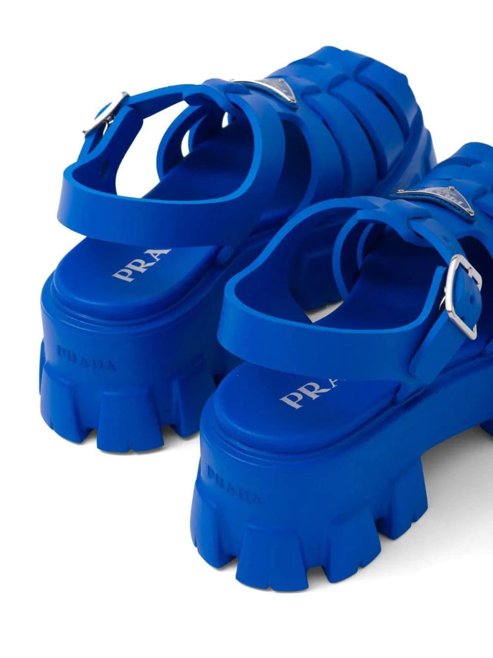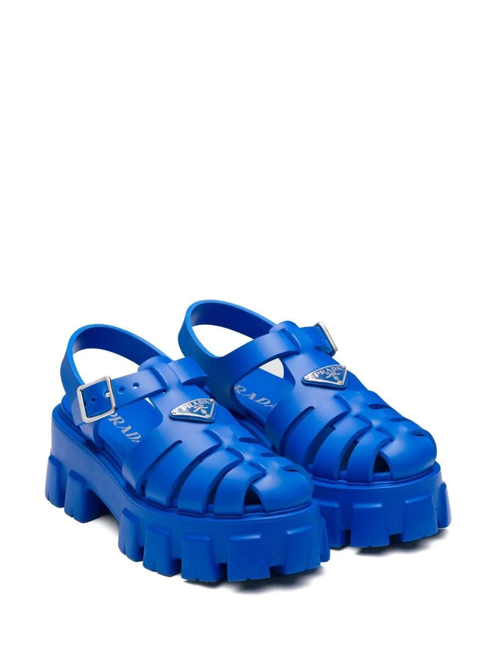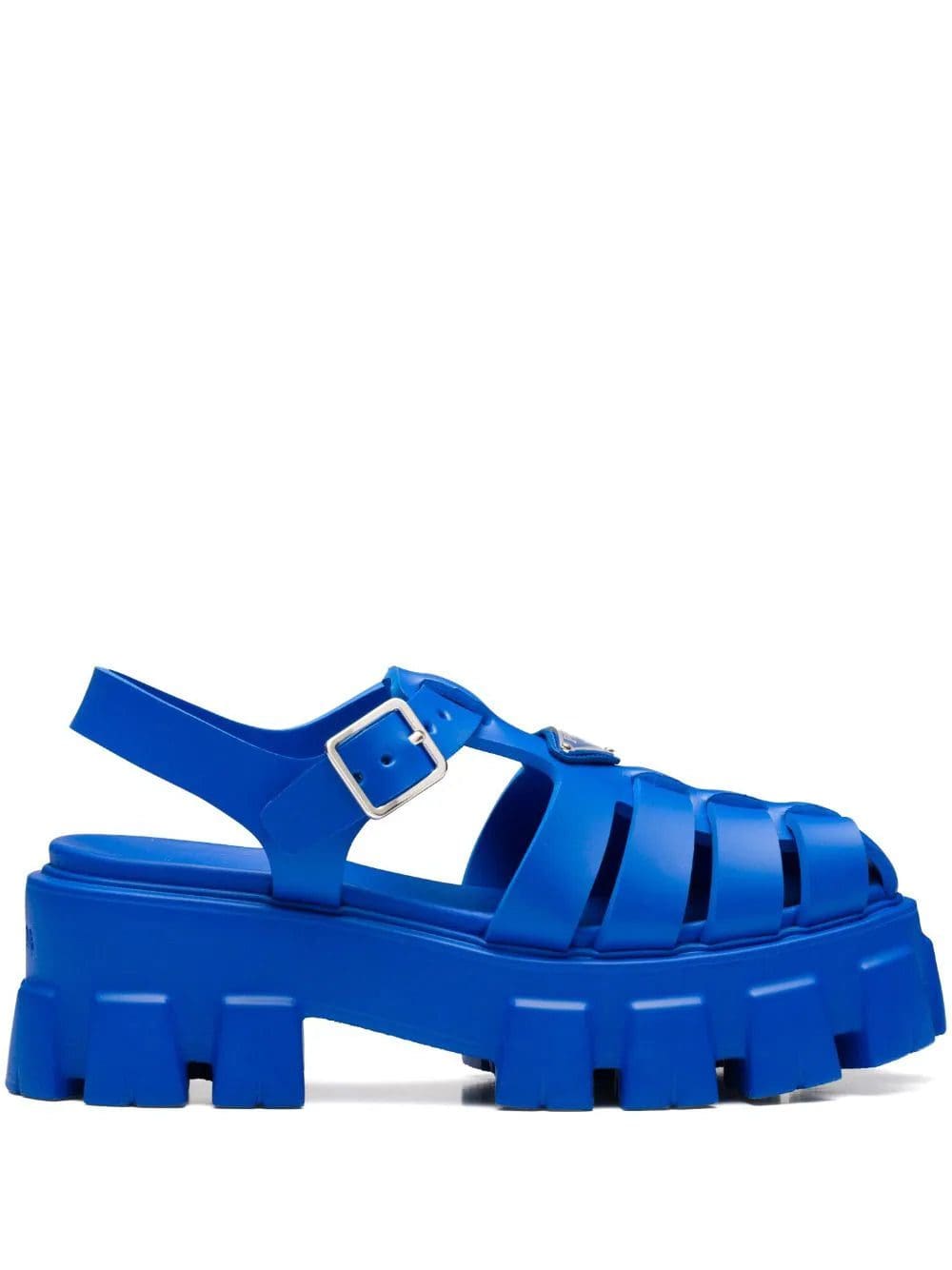 Prada reimagines its dual soul with a modernist twist in the voluminous construction of these blue rubber sandals. They're set on a deeply ridged platform sole that's reminiscent of hiking styles and are finished with an enameled metal triangle logo that nods to archival codes.