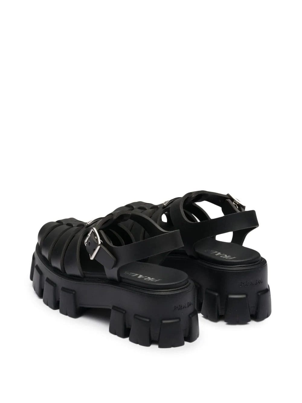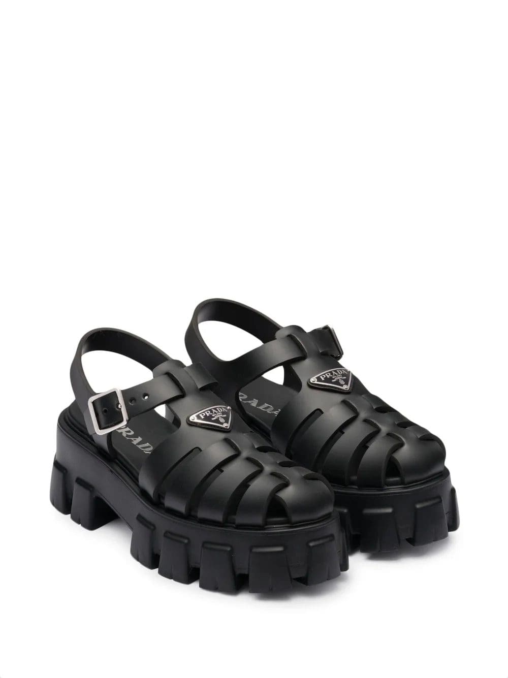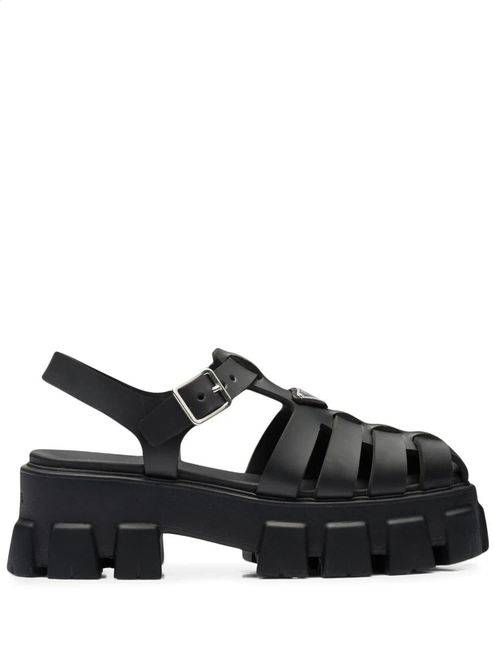 Prada reimagines its dual soul with a modernist twist in the voluminous construction of these black rubber sandals. They're set on a deeply ridged platform sole that's reminiscent of hiking styles and are finished with an enameled metal triangle logo that nods to archival codes.