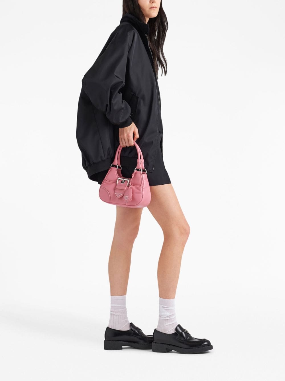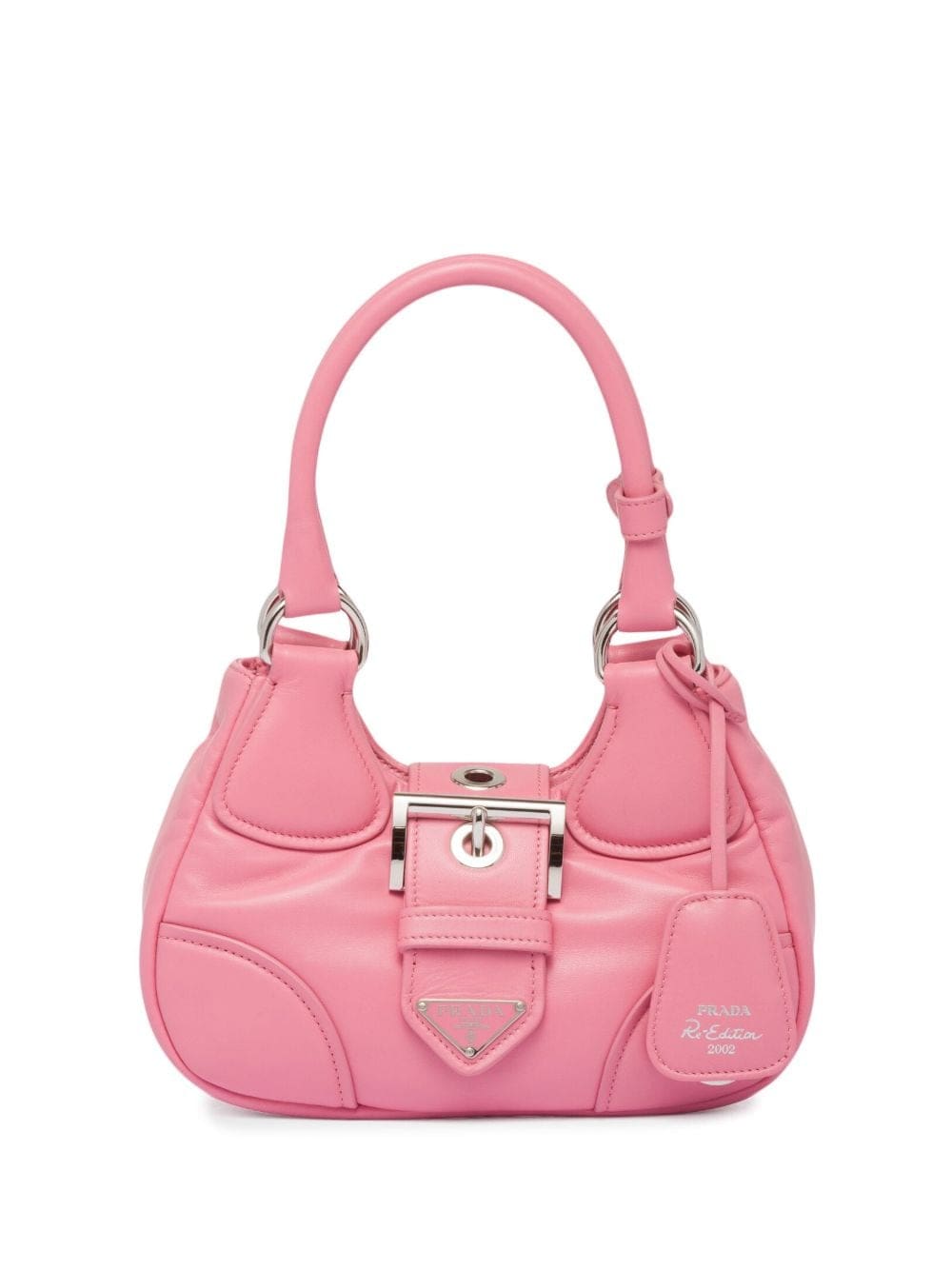 Reworking an iconic model from the 2000's, Prada introduces its Moon bag crafted from soft nappa leather. Rendered in a geranium pink hue, it reimagines traditional elements in a contemporary way through its padded construction and logo-plaque buckle fastening.
