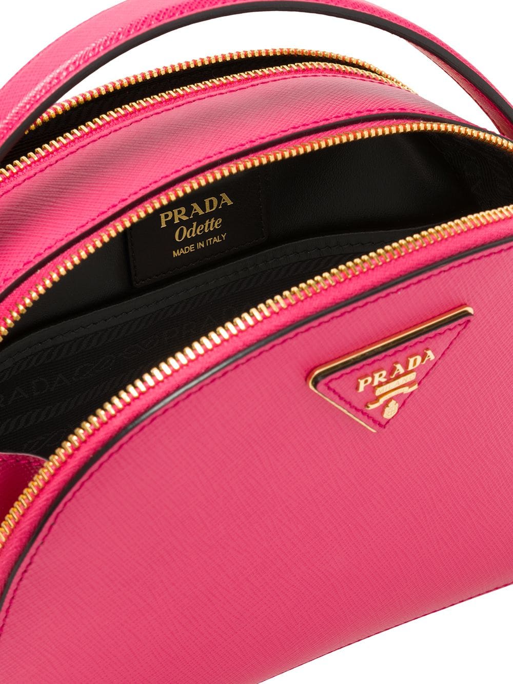 Defining luxury since 1913, Italian fashion house Prada is renowned for their uncompromising quality and timeless design vision. As showcased with this magenta leather Odette shoulder bag from Prada featuring a top handle, a double top zip closure, a front logo plaque, a detachable and adjustable shoulder strap and an internal slip pocket.