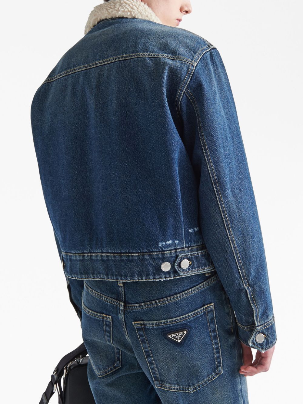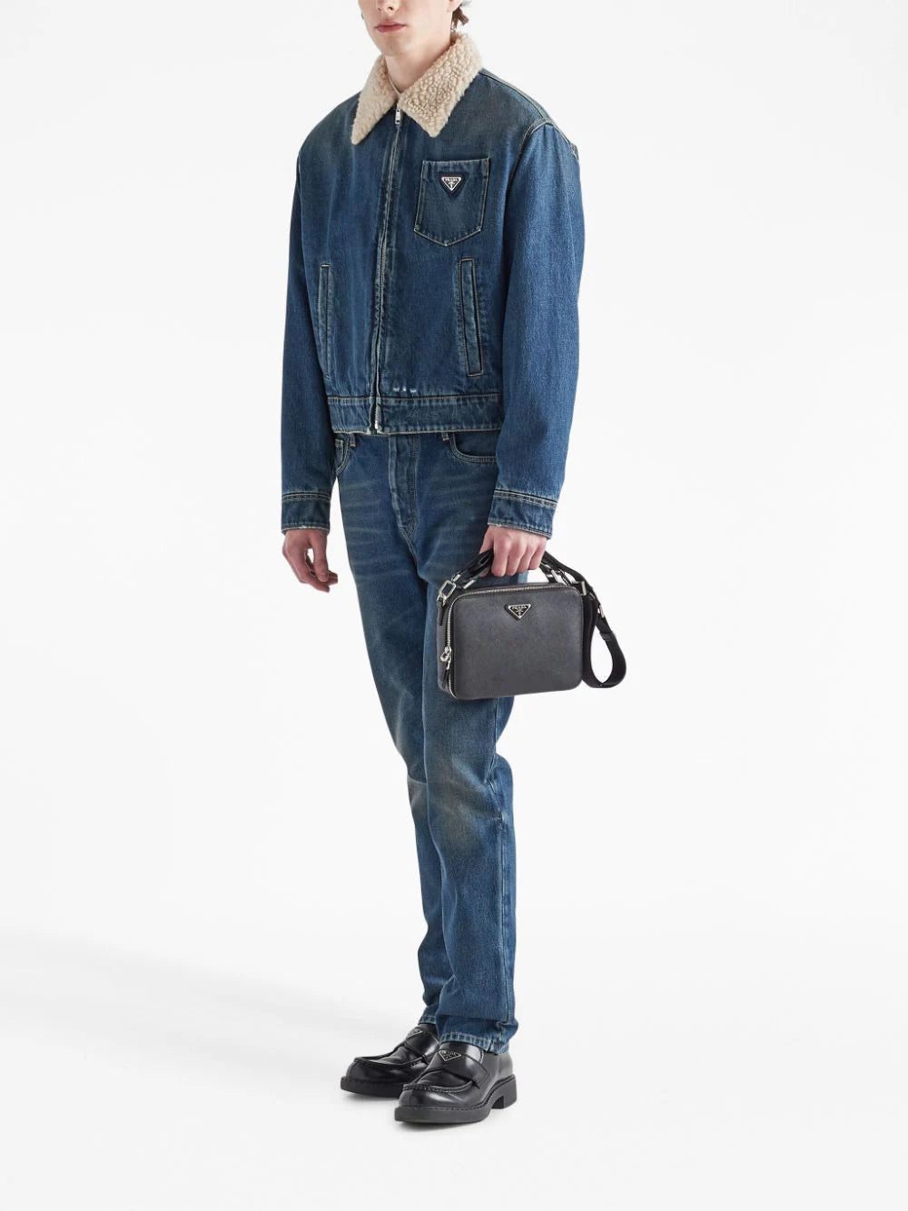 Prada puts a modern spin on the classic denim jacket. Made in Italy from cotton, it's cut to a boxy silhouette and versatile front zip-fastening, while soft shearling to the collar and lining lend the design a warm and cosy feel.