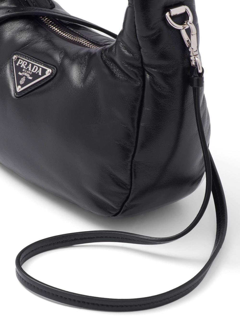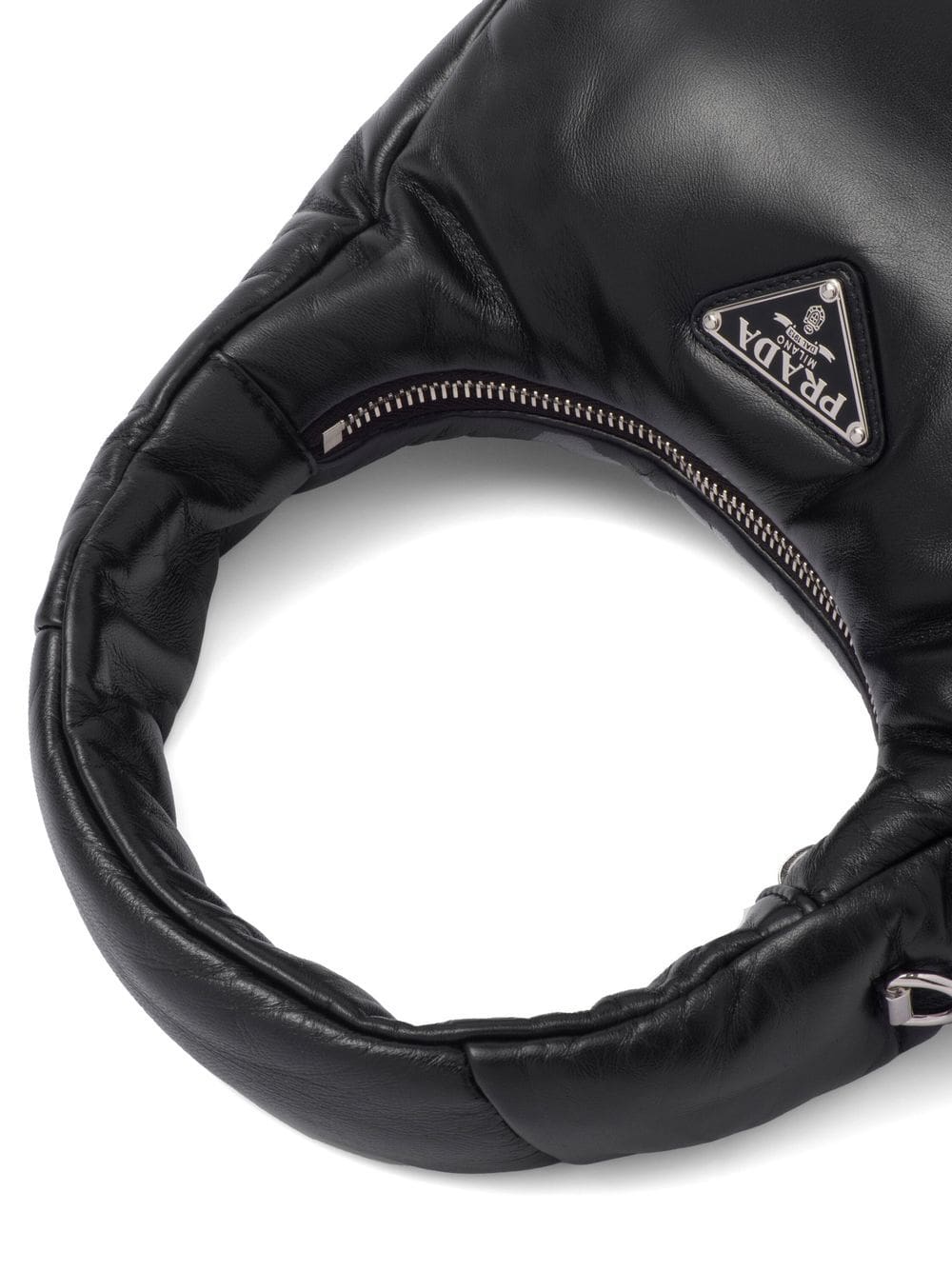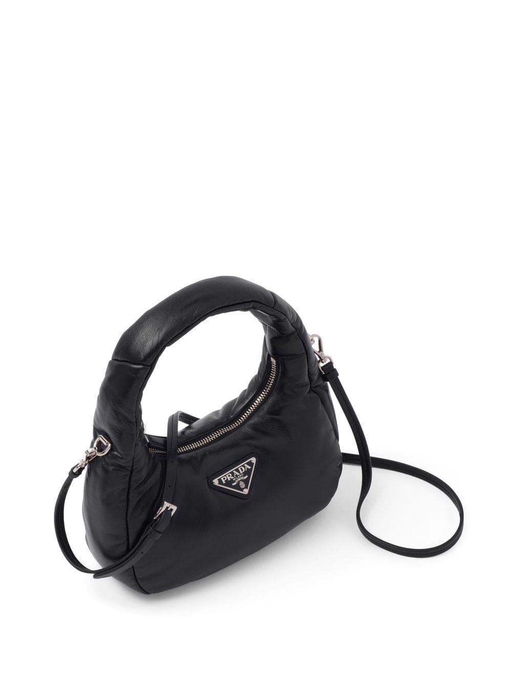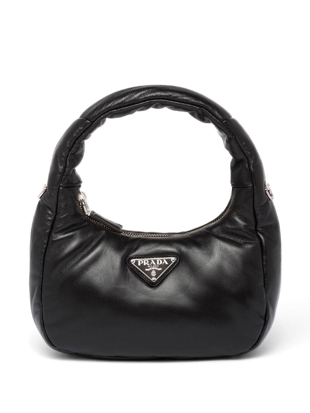 black nappa leather padded design enamel triangle logo silver-tone hardware single top handle adjustable detachable shoulder strap top zip fastening main compartment