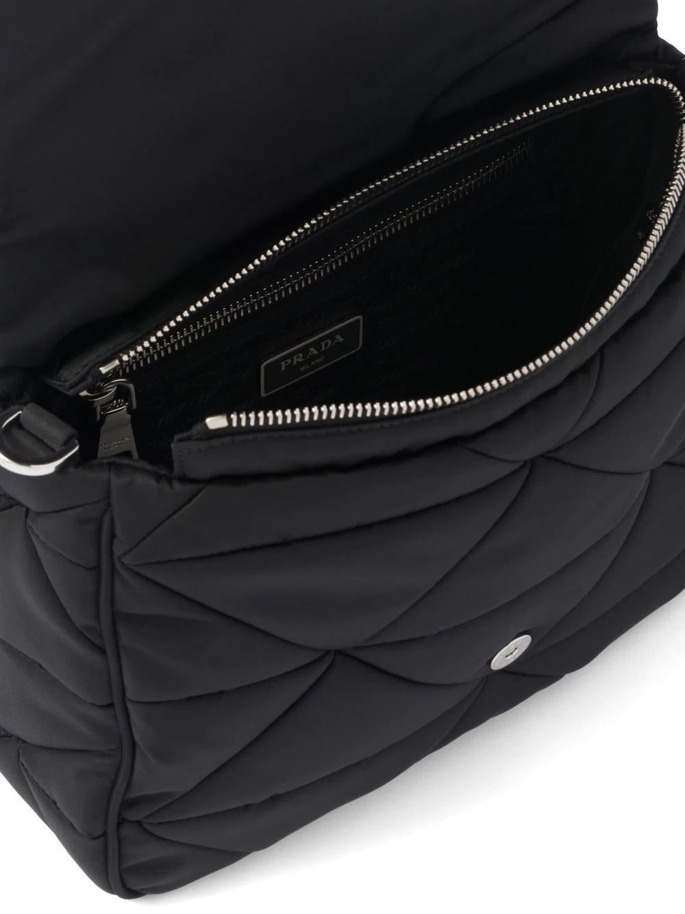 padded Re-Nylon shoulder bag from PRADA featuring black, recycled nylon, quilted finish, enamel triangle logo, small patch pocket, foldover top and concealed top zip fastening. Conscious: This item is made from at least 50% recycled or upcycled materials. For recycled synthetic clothing products we highly recommend using a microfibre-catching washing bag to ensure that no microplastics that can pollute water are released in the process..