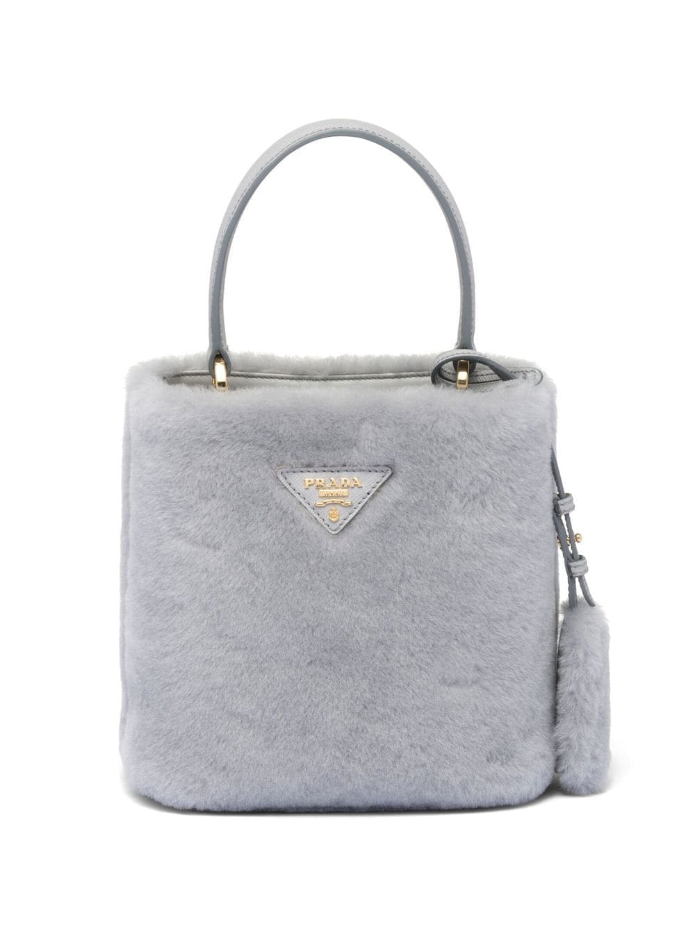 light grey calf leather/shearling triangle logo keyring attachment partitioned compartment single rolled top handle adjustable detachable shoulder strap