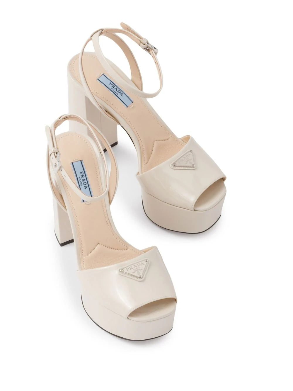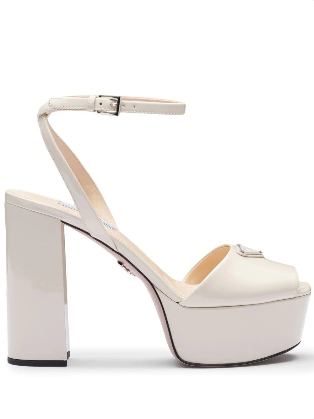 These platform sandals from Prada have the iconic enameled metal triangle logo to the front of this design, a motif which first appeared in 1913 on trunks designed by Mario Prada.