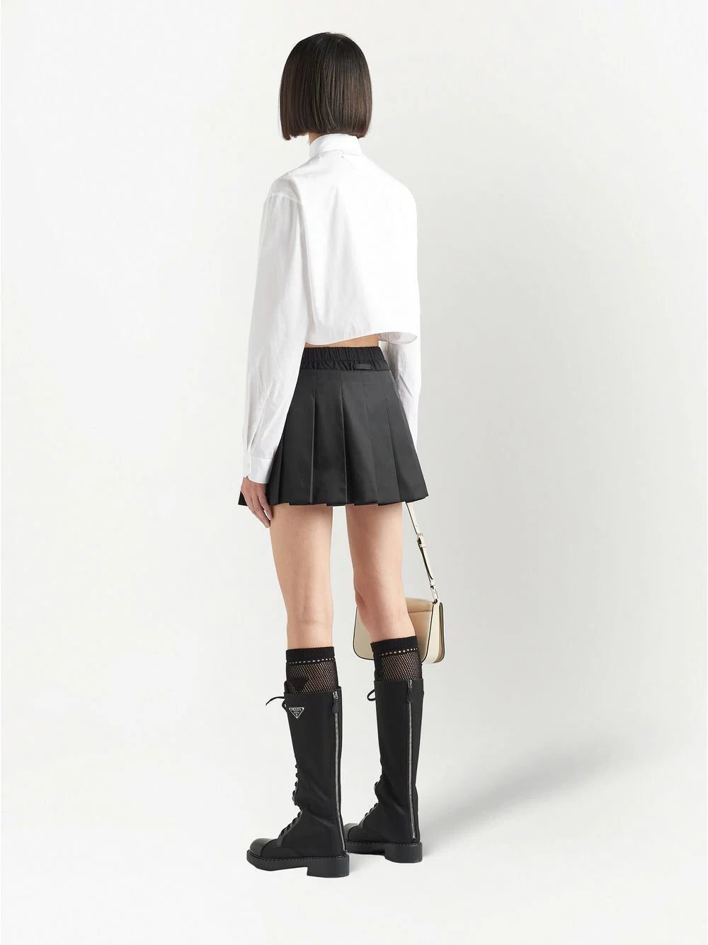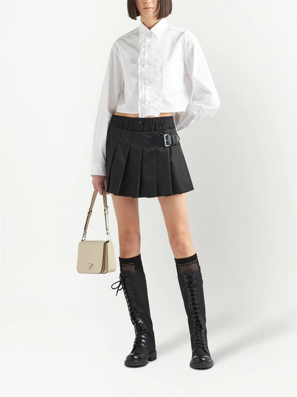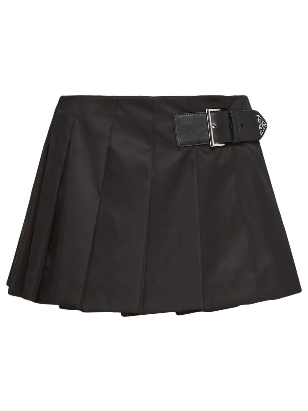 Designed by Prada, this box-pleat miniskirt arrives with a classic black hue. Over the high waist, a silver-tone buckle displays the signature enamel triangle logo for a touch of recognition.