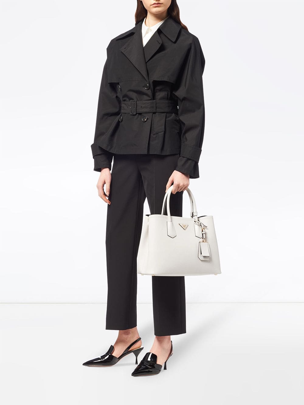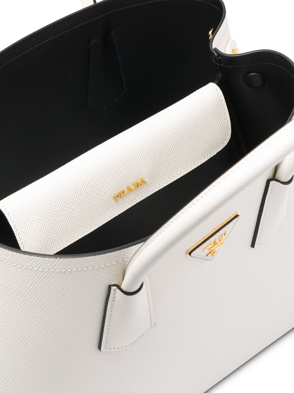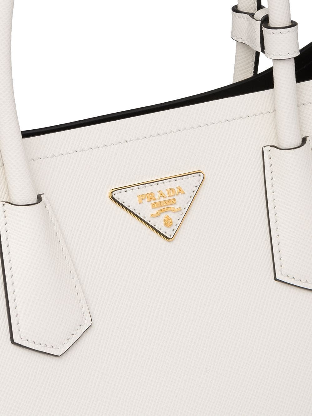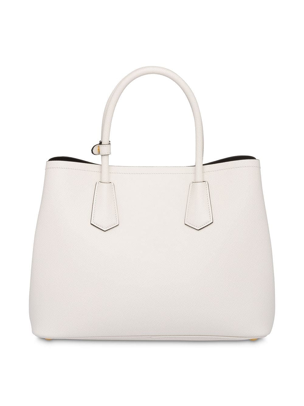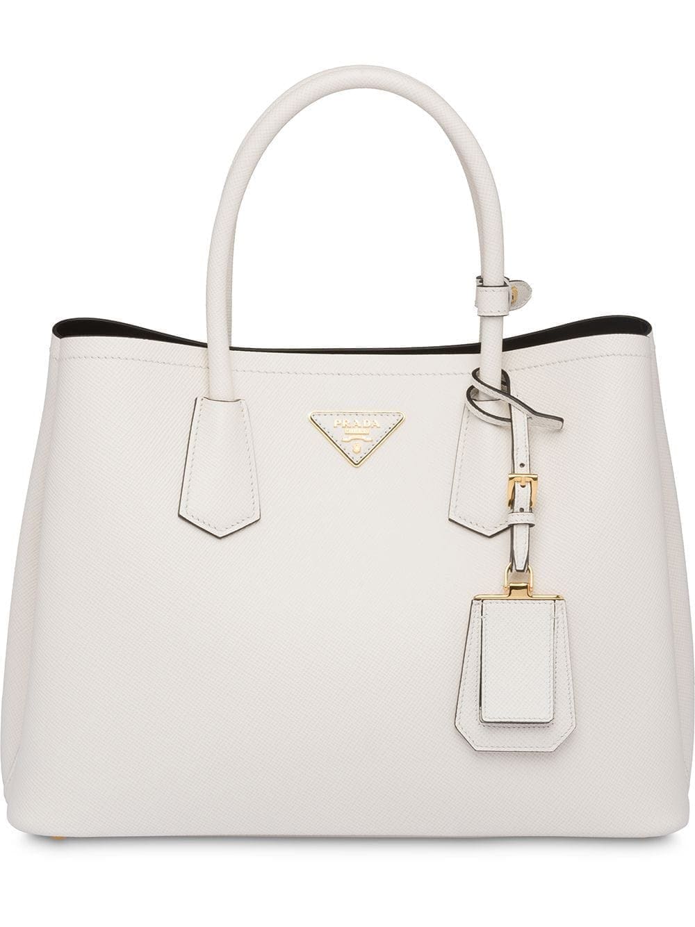 Chiefs in leather craftsmanship, Prada's acclaimed Saffiano leather is consistently found throughout every collection. This white Saffiano leather Prada double medium tote from Prada features round top handles, a hanging leather tag, a gold-tone logo plaque and a detachable and adjustable shoulder strap.