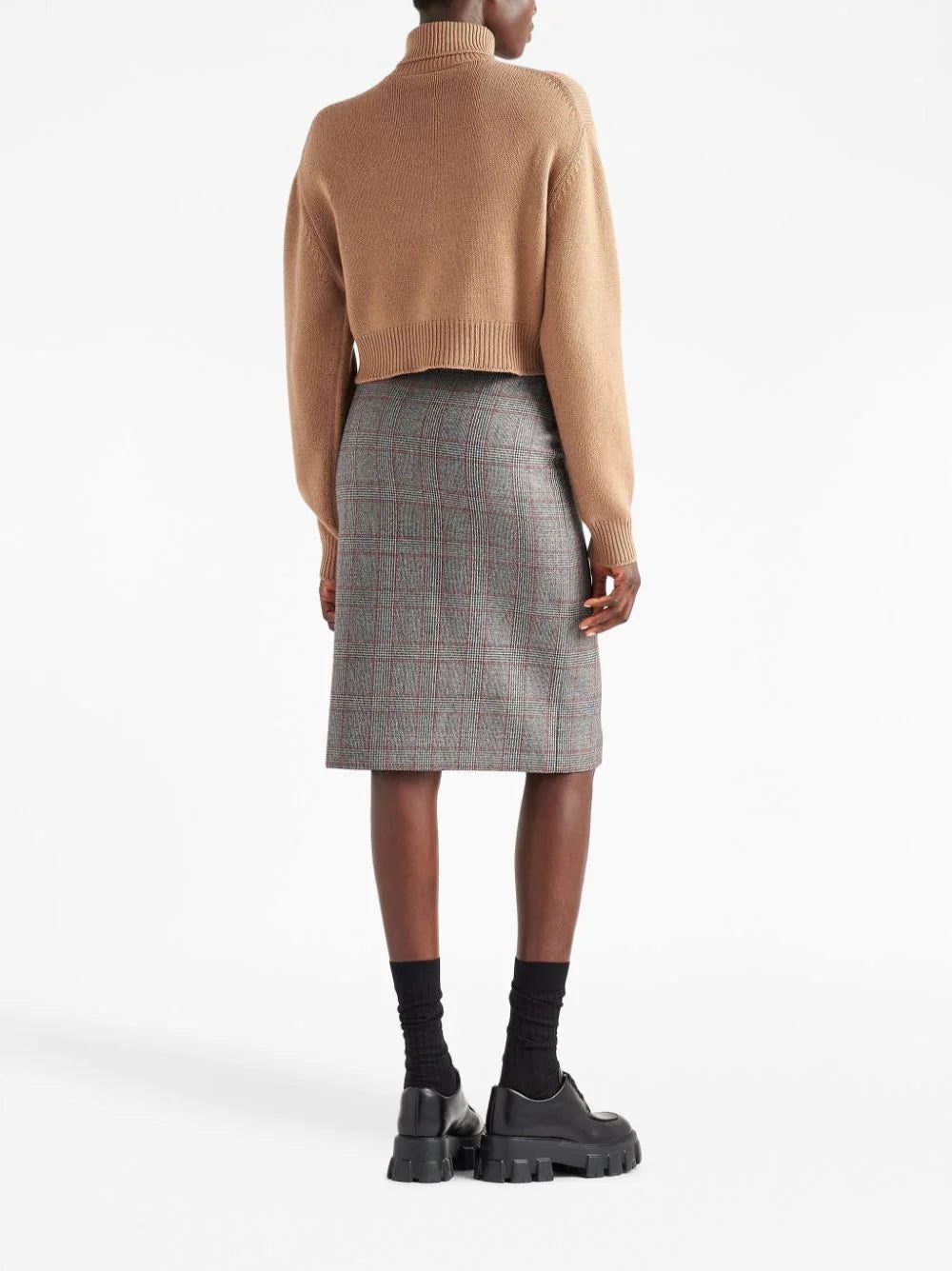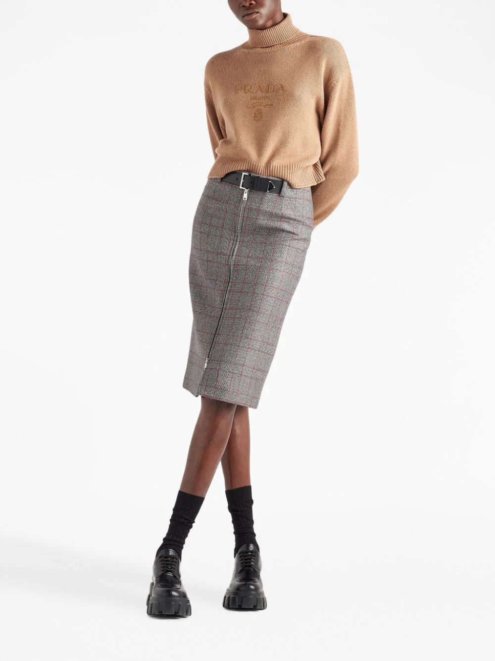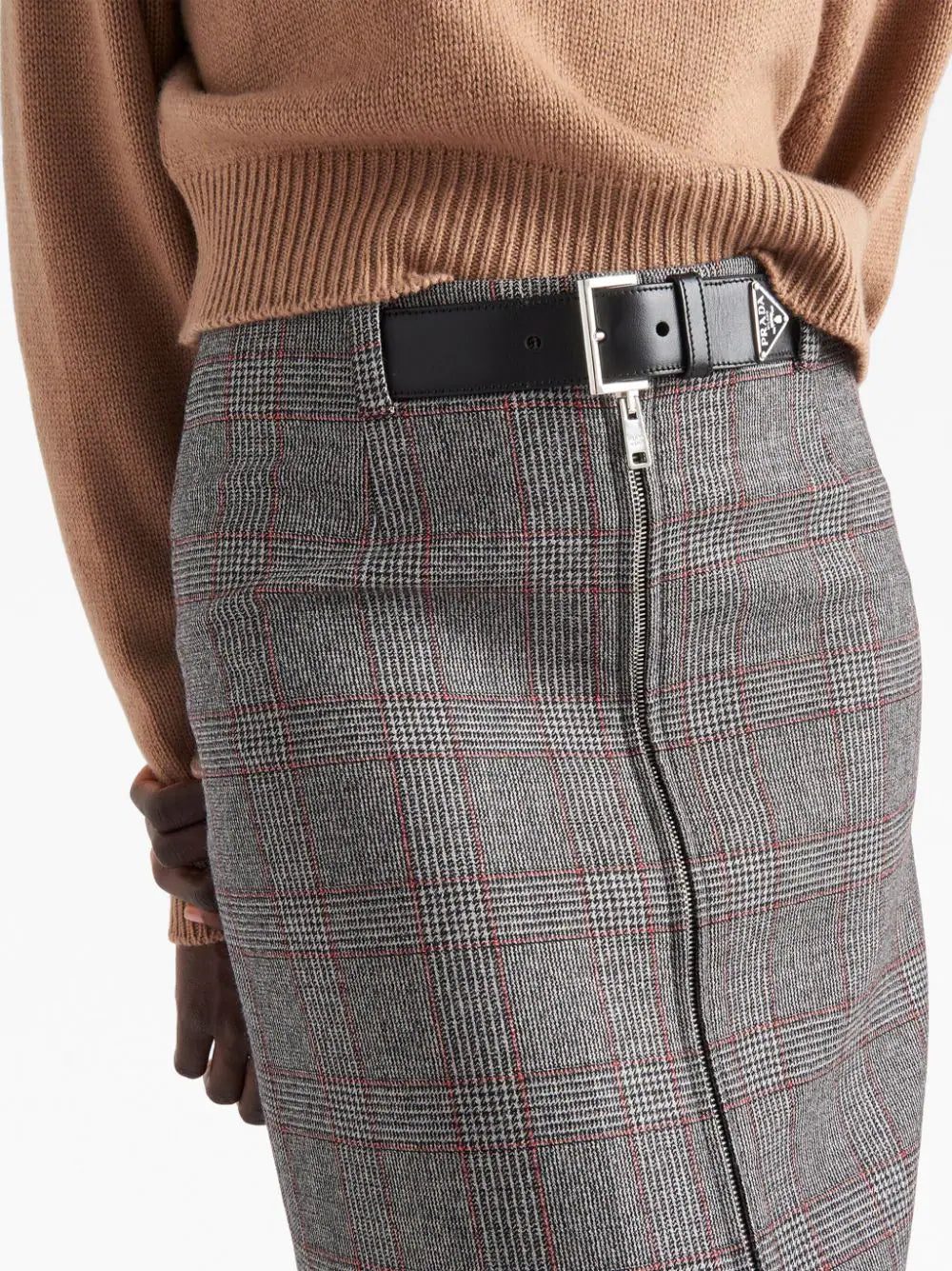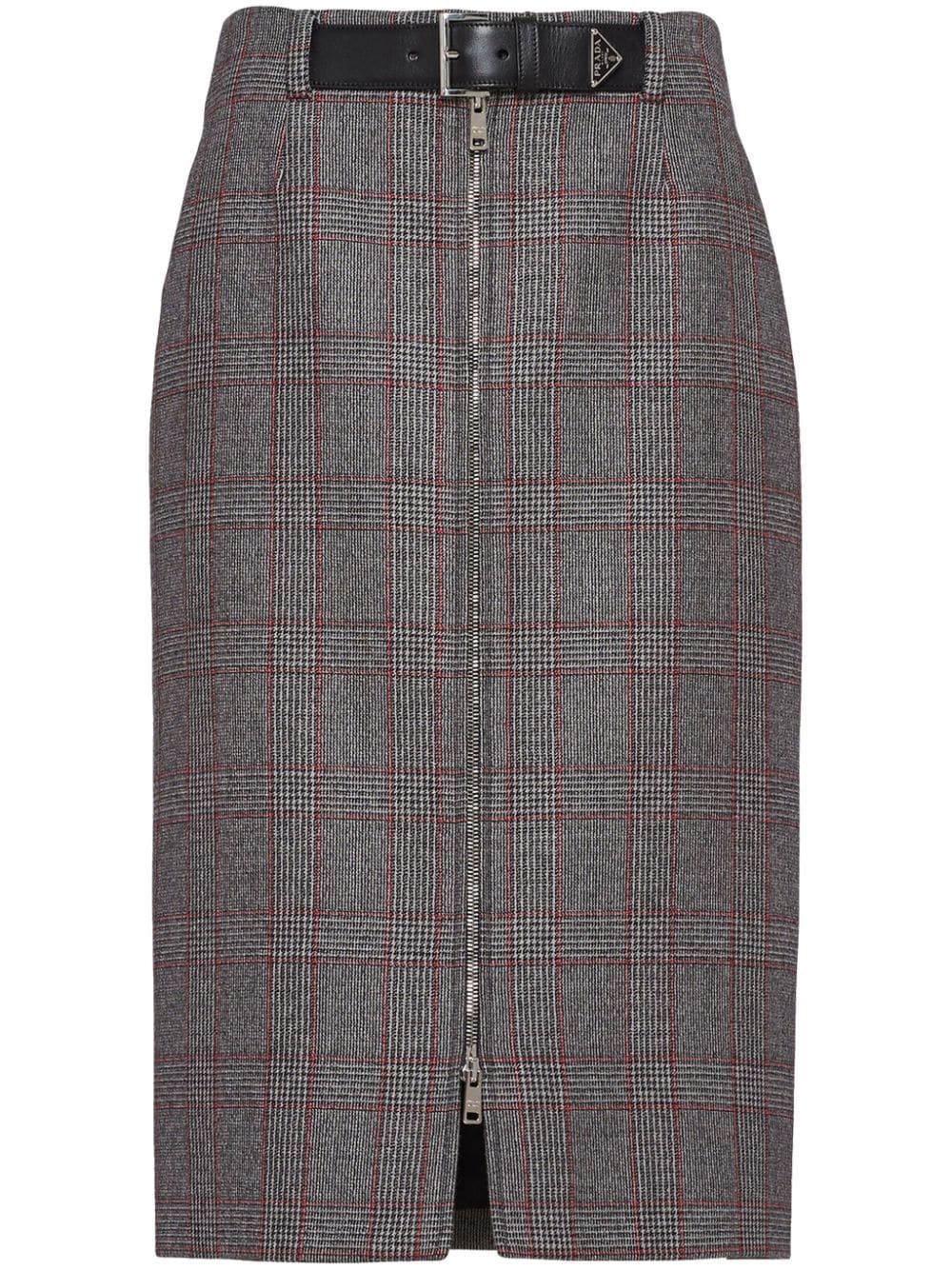 Prada spotlights its focus on exquisite craftsmanship with this zipped midi skirt. Spun from mouliné wool, it's patterned with a classic Prince of Wales check and fastened with a small belt at the waist.