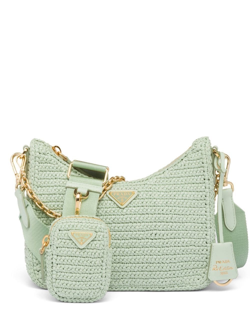 Prada updates its iconic Re-Edition 2005 style with a raffia construction. This pale-green iteration is punctuated with the brand's signature plaque at the front and fitted with a chain-link top handle and shoulder strap.