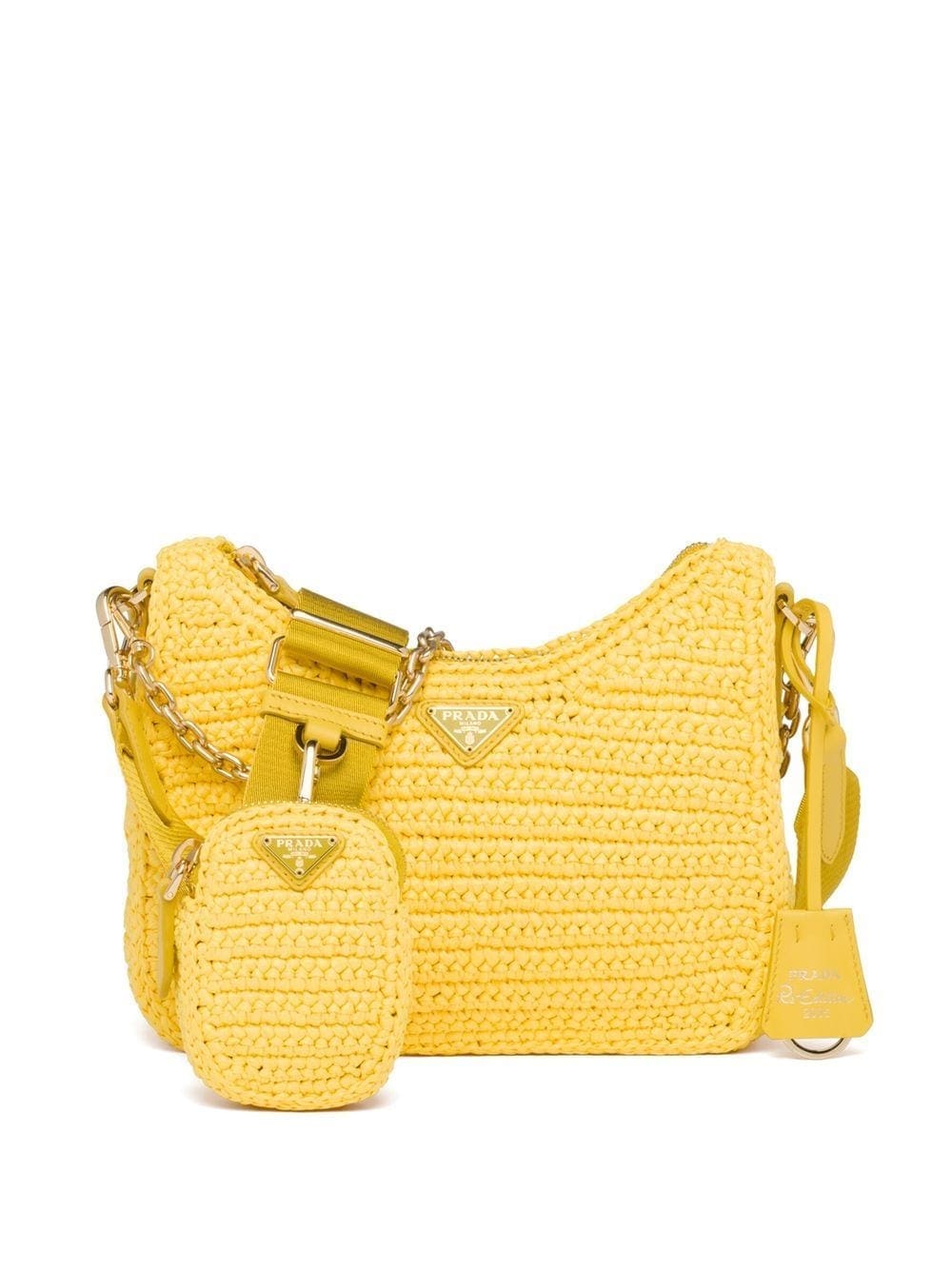 Prada updates its iconic Re-Issue 2005 style in a raffia construction. This yellow iteration is punctuated with the brand's signature at the front.