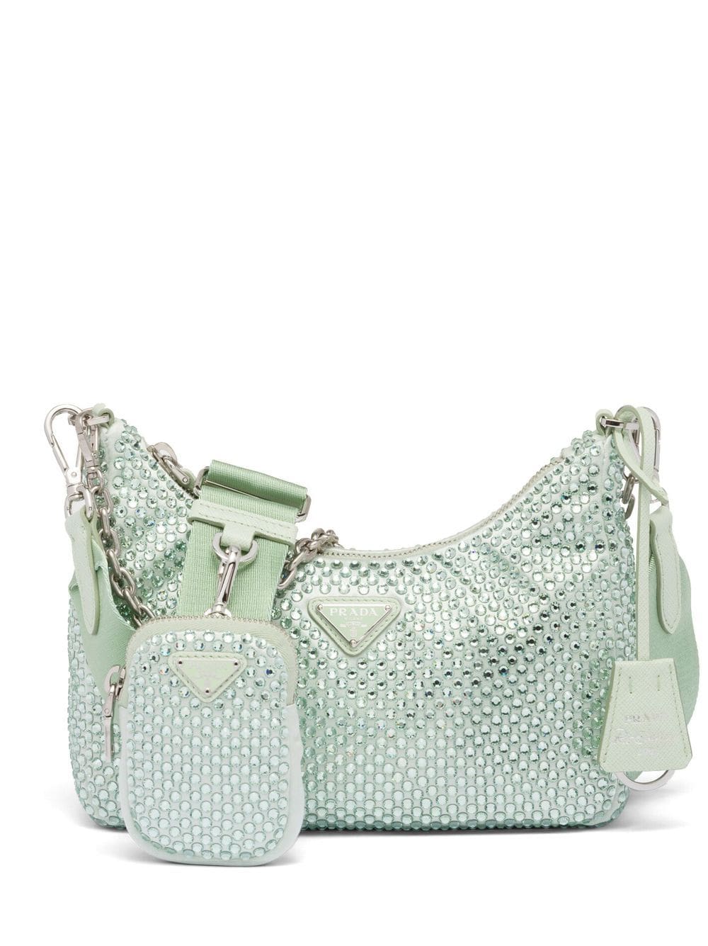 Prada Re-Edition 2005 shoulder bag from PRADA featuring aqua blue, satin finish, crystal embellishment, enamel triangle logo, silver-tone hardware, detachable chain-link shoulder strap and removable pouch.