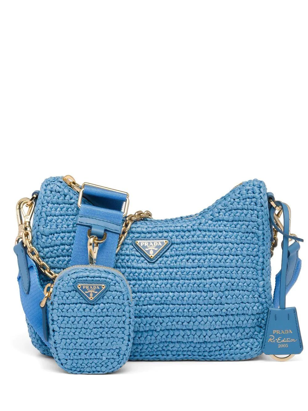 Prada updates its iconic Re-Issue 2005 style in a raffia construction. This striped iteration is punctuated with the brand's signature at the front.