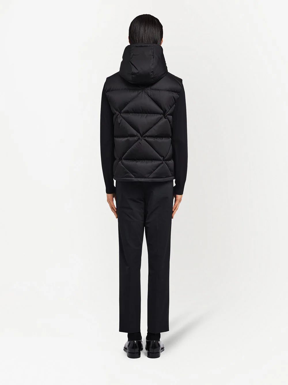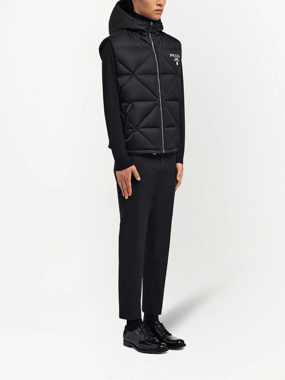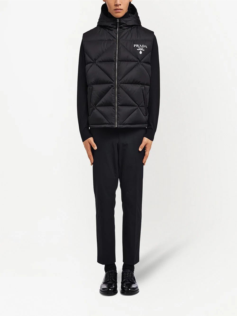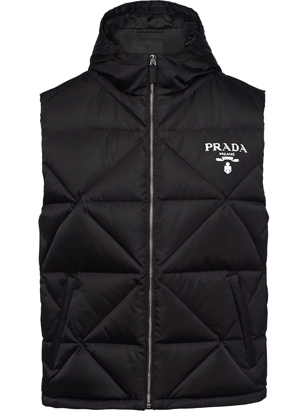 This Prada black vest is an ode to the brand's minimalist aesthetic. It is made with feathers and re-nylon and detailed with a contrasting logo printed on the chest.