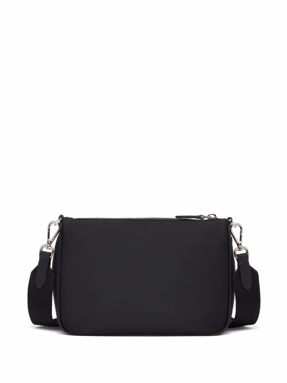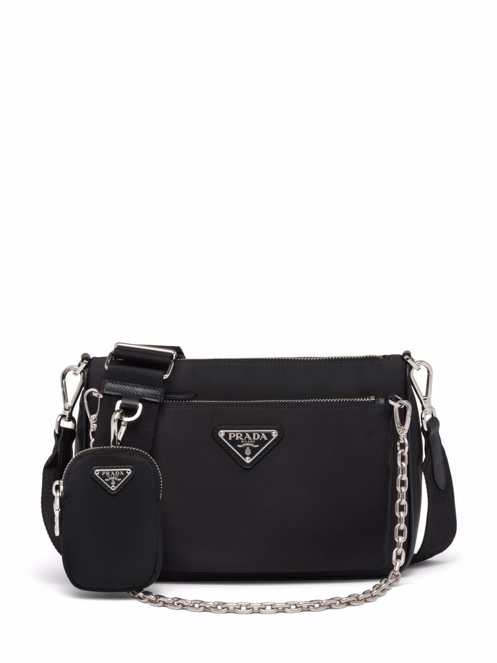 Practicality meets sleek style with the introduction of this black shoulder bag from Prada. The accessory boasts two detachable main pockets and a small zip-fastening pocket. Made from recycled nylon, the design is punctuated with silver-tone hardware and the house's signature triangle logo.