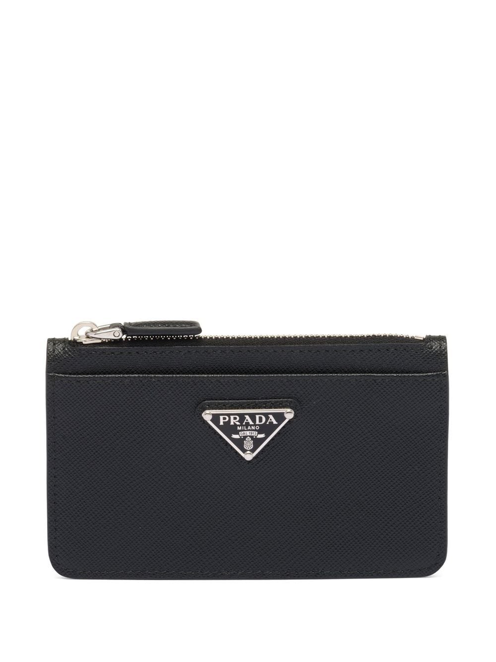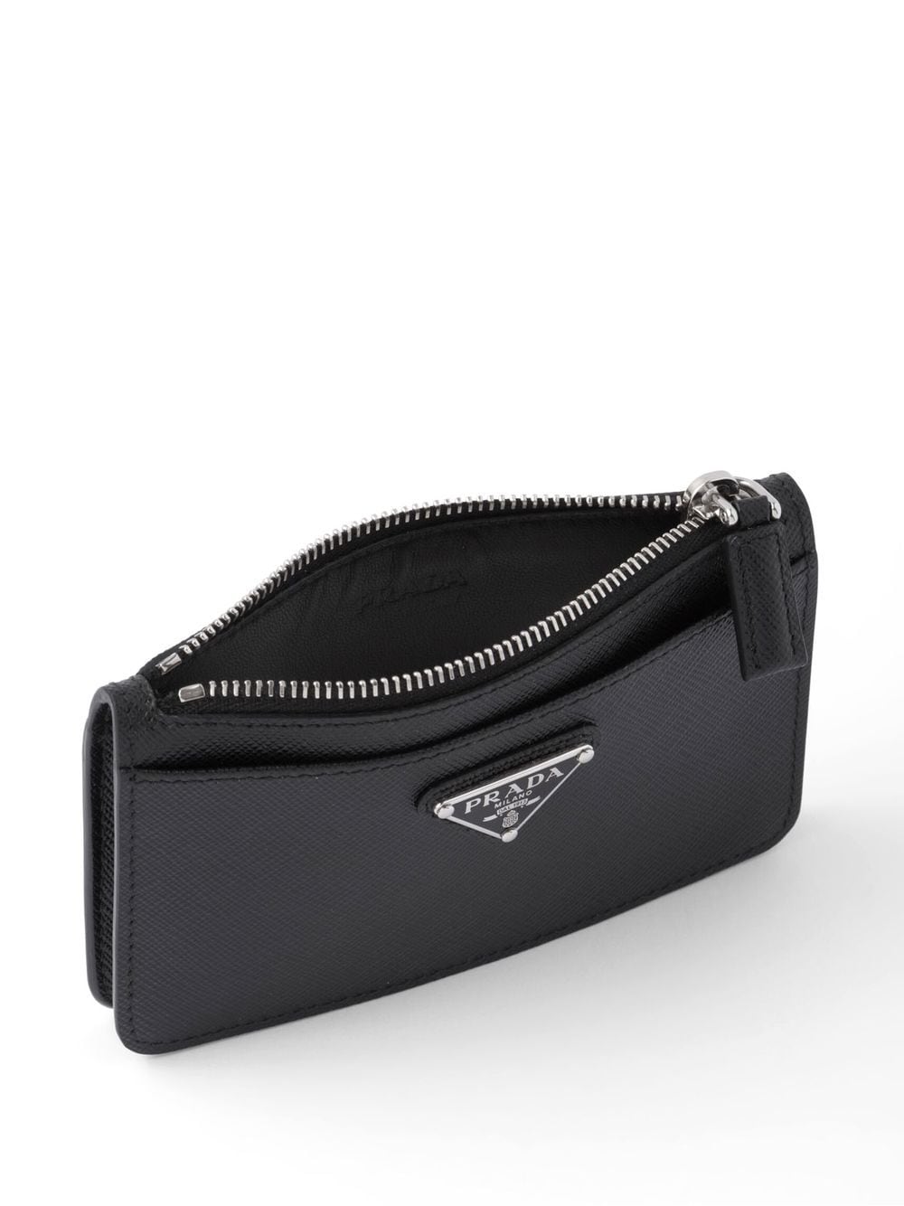 jet black leather grained texture logo plaque top zip fastening card slots