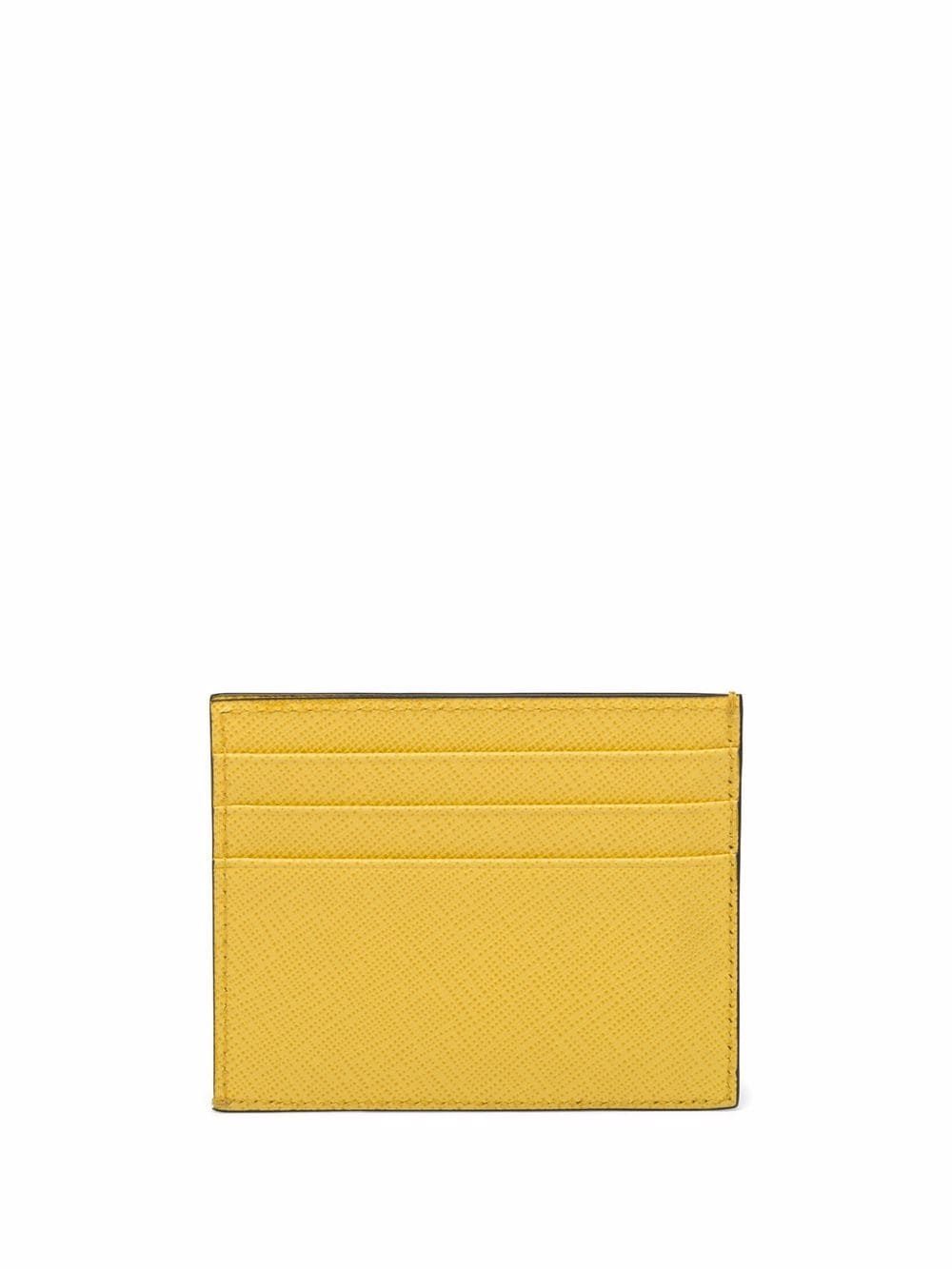 Prada's Saffiano leather card holder stands out for its versatile design, in yellow. The accessory is constructed with six slots and highlighted by the iconic triangle logo embossed in a matching colour.