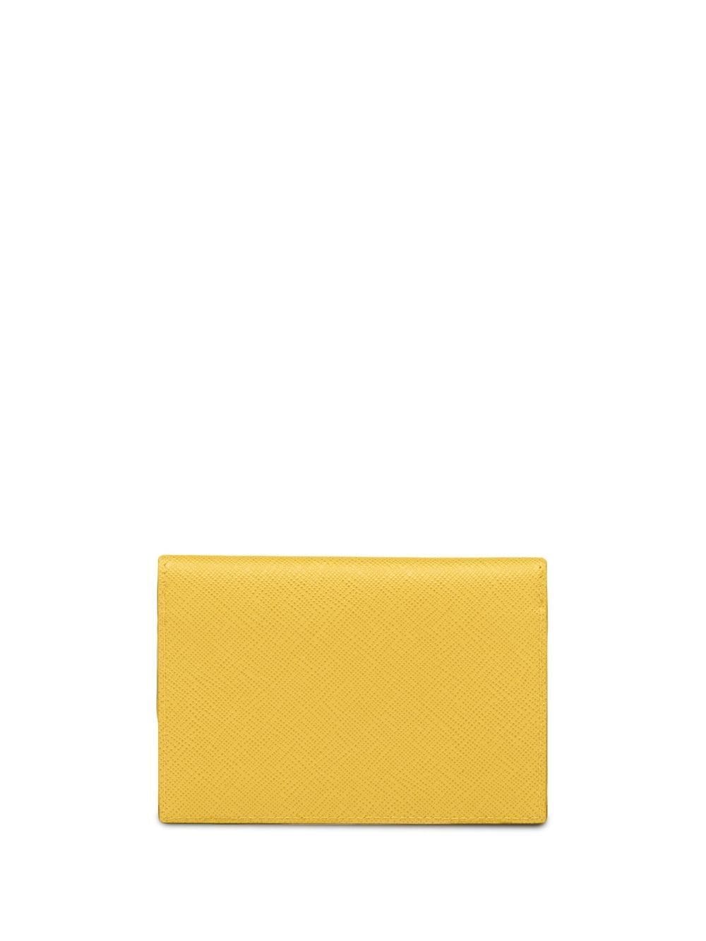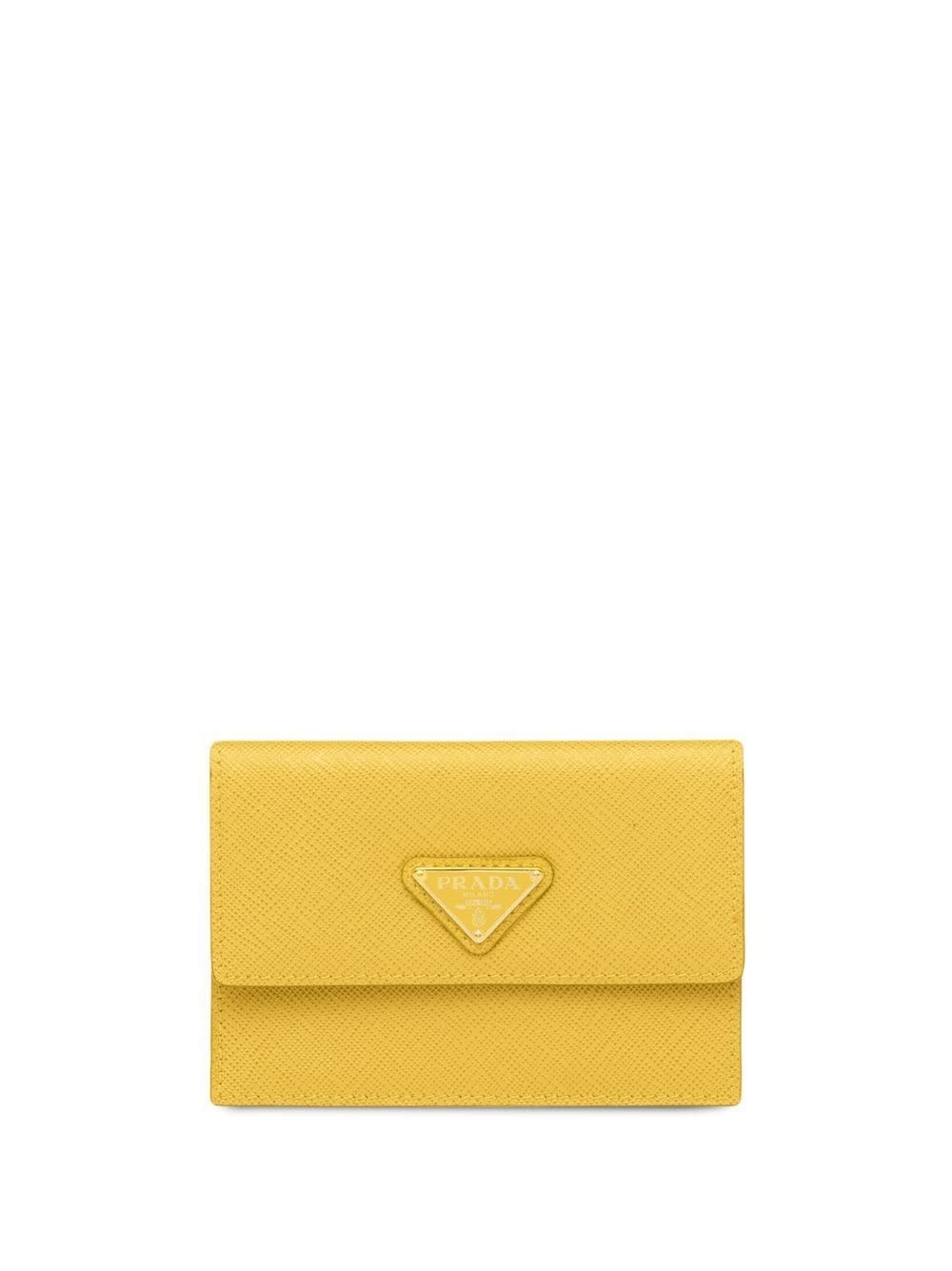 canary yellow Saffiano leather enamel triangle logo foldover top with magnetic fastening main compartment
