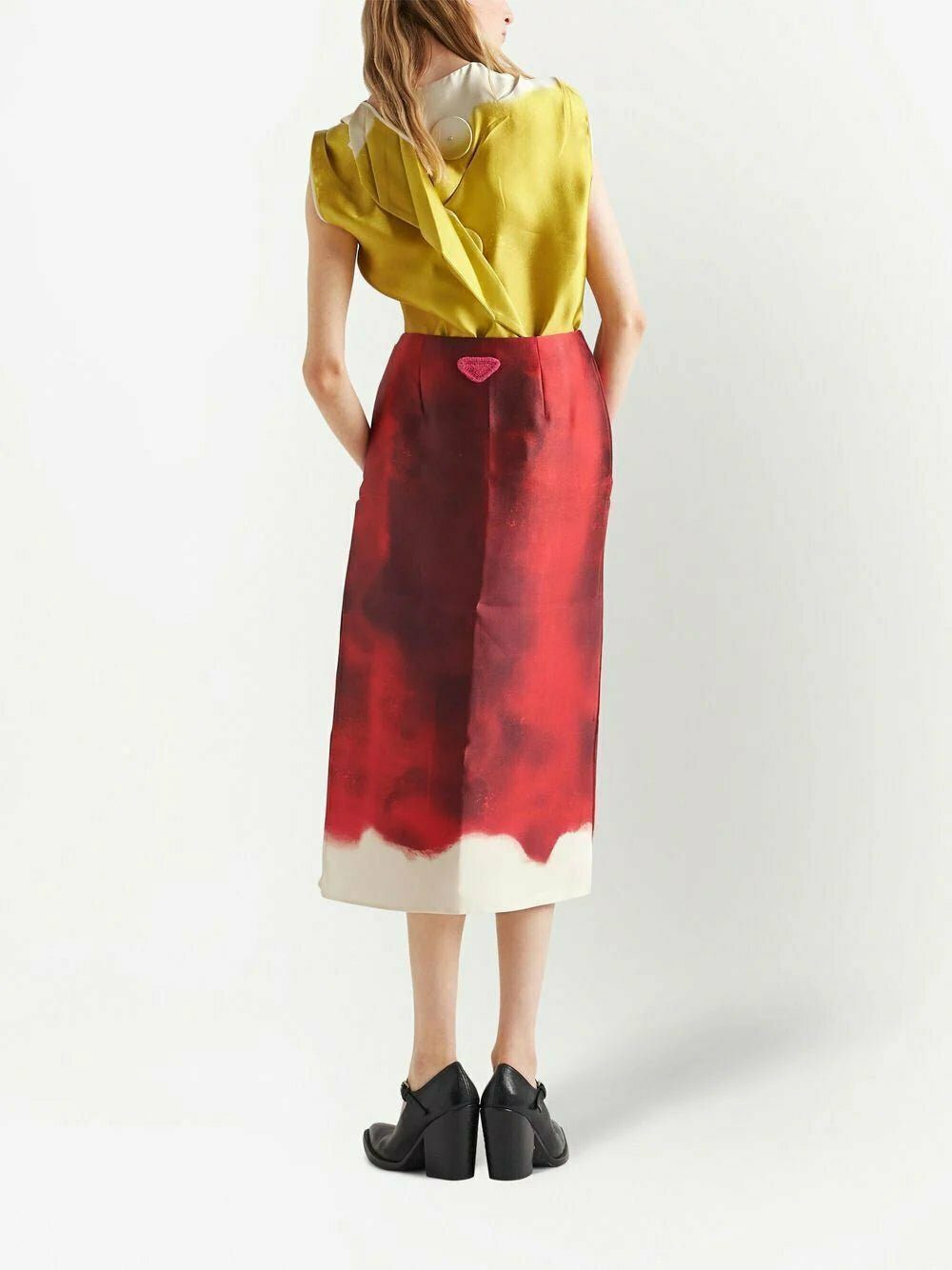 satin sleeveless blouse from PRADA featuring satin finish, decorative button detailing, round neck, sleeveless, straight hem and citron green .