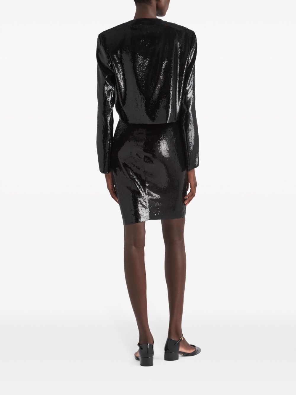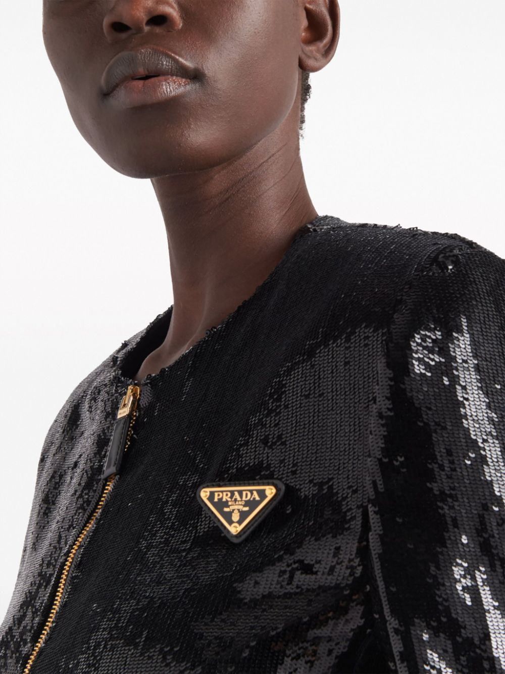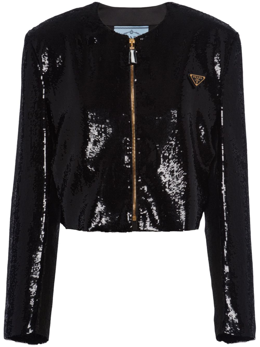 A bold fusion of form and embellishment, this Prada jacket is cut to a cropped, strong-shouldered silhouette and entirely covered in black sequins. The enamelled triangle logo plaque at the chest acts as a signature stamp of identity.