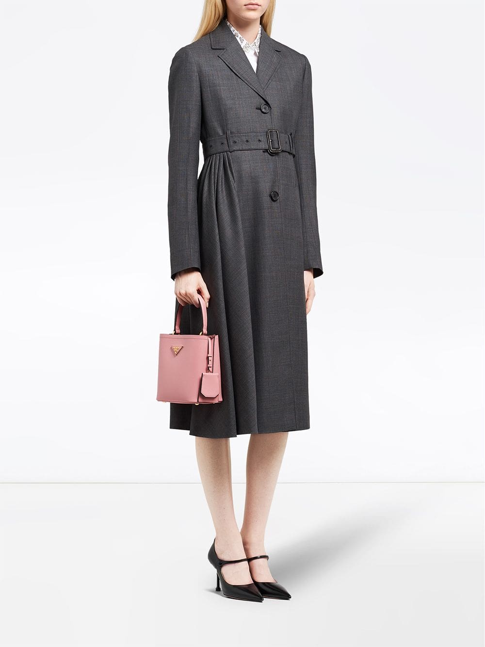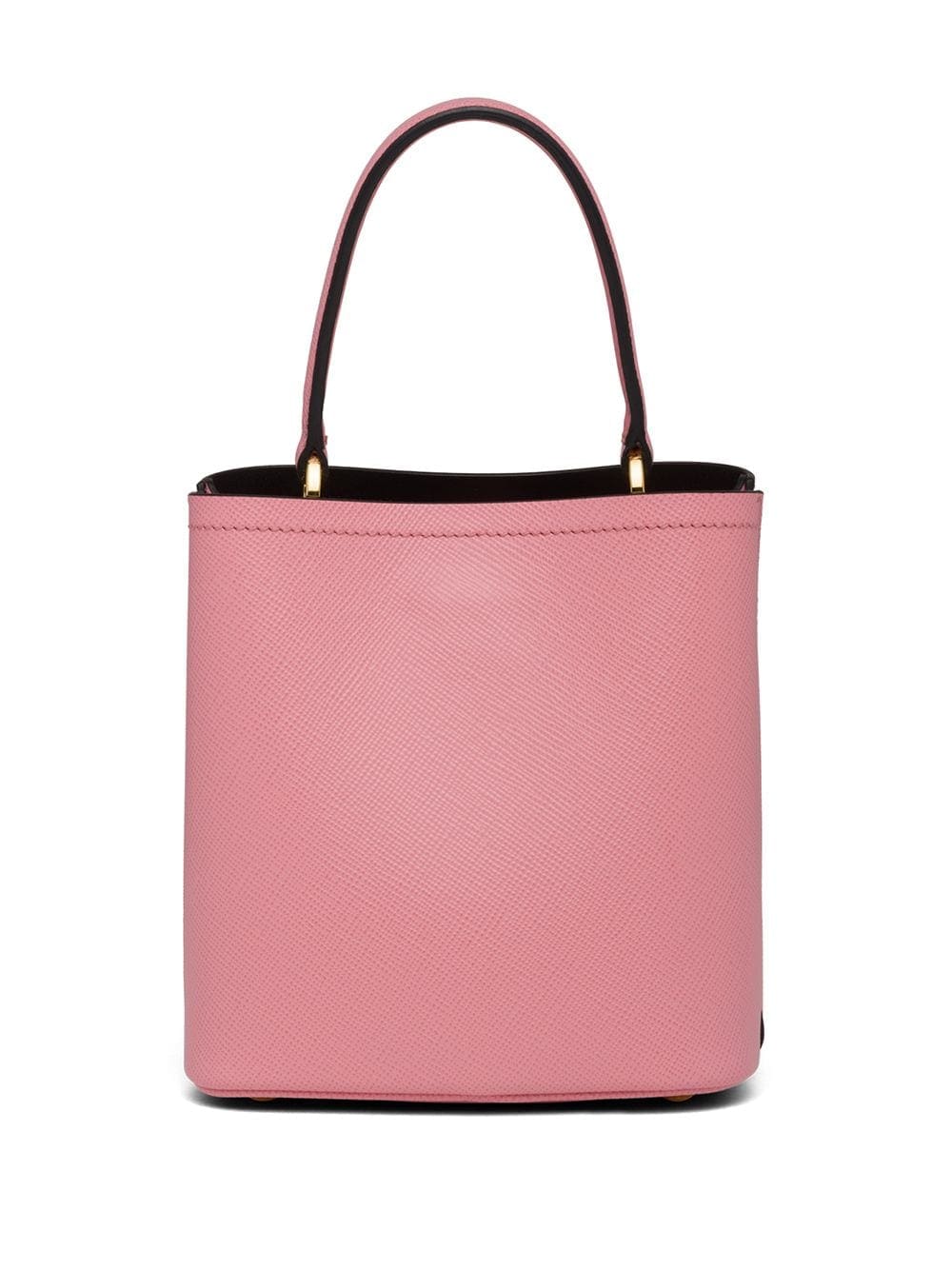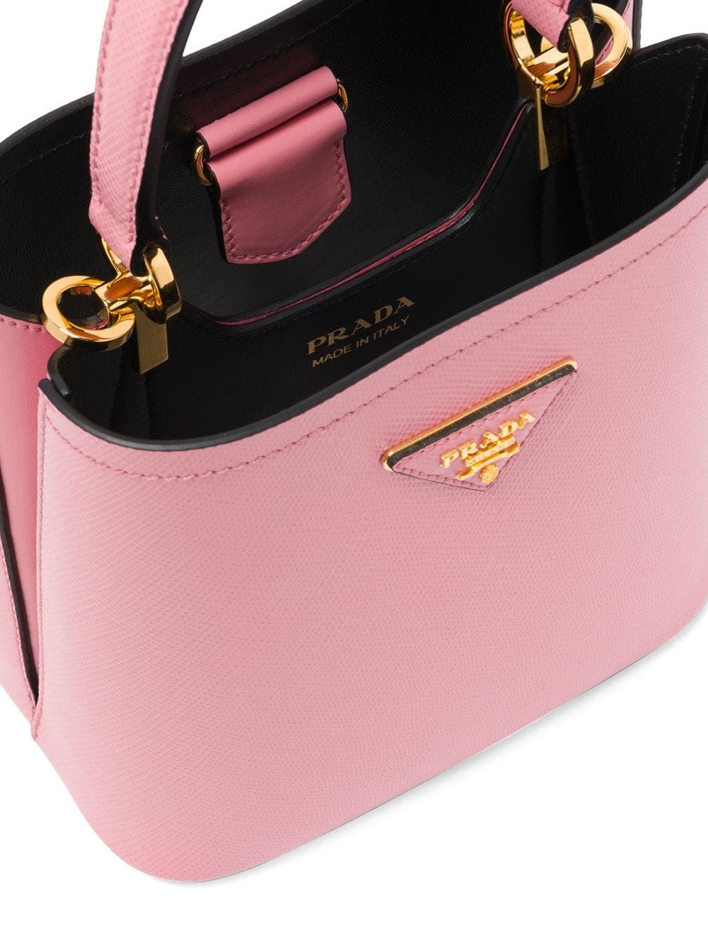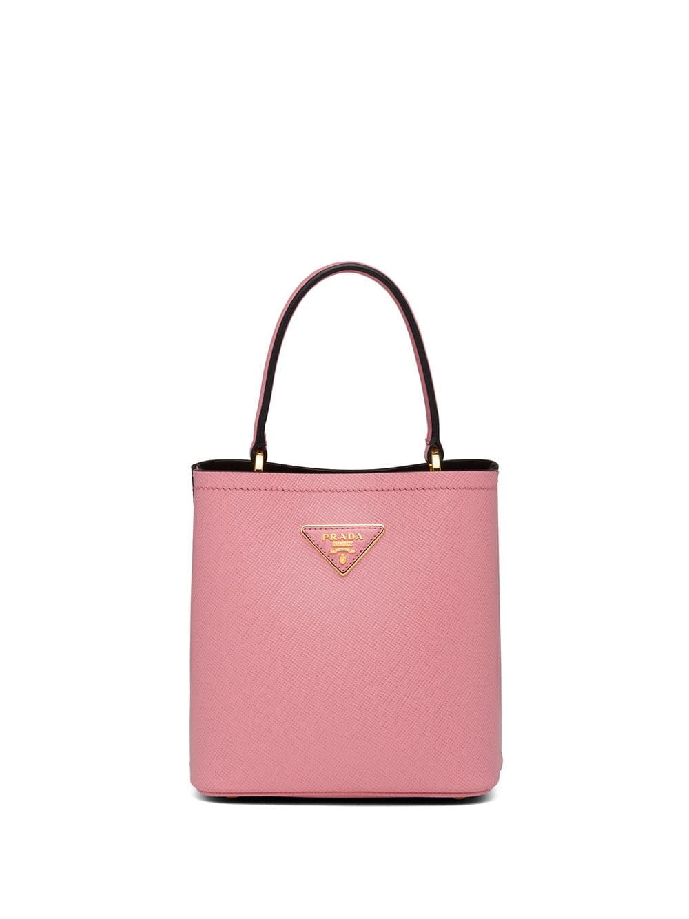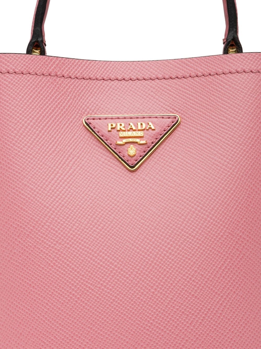 Defining luxury since 1913, Italian fashion house Prada is renowned for their uncompromising quality and timeless design vision. This petal pink calf leather small Panier tote from Prada features gold-tone hardware, a top handle, a detachable and adjustable shoulder strap, a hanging leather tag, a front logo plaque, an open top design and interior compartments divided by a partition.