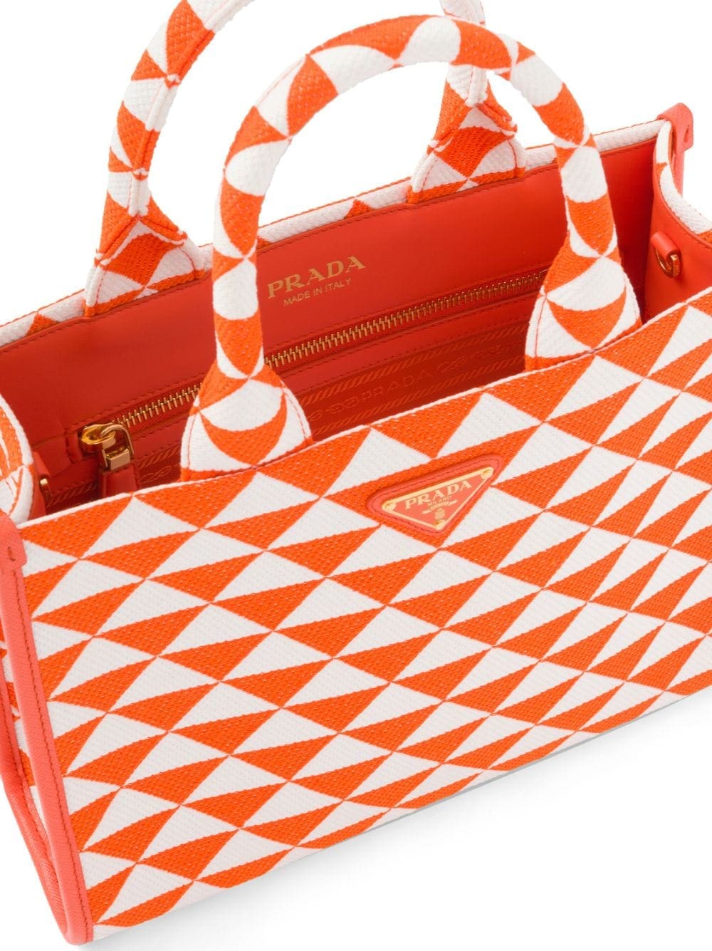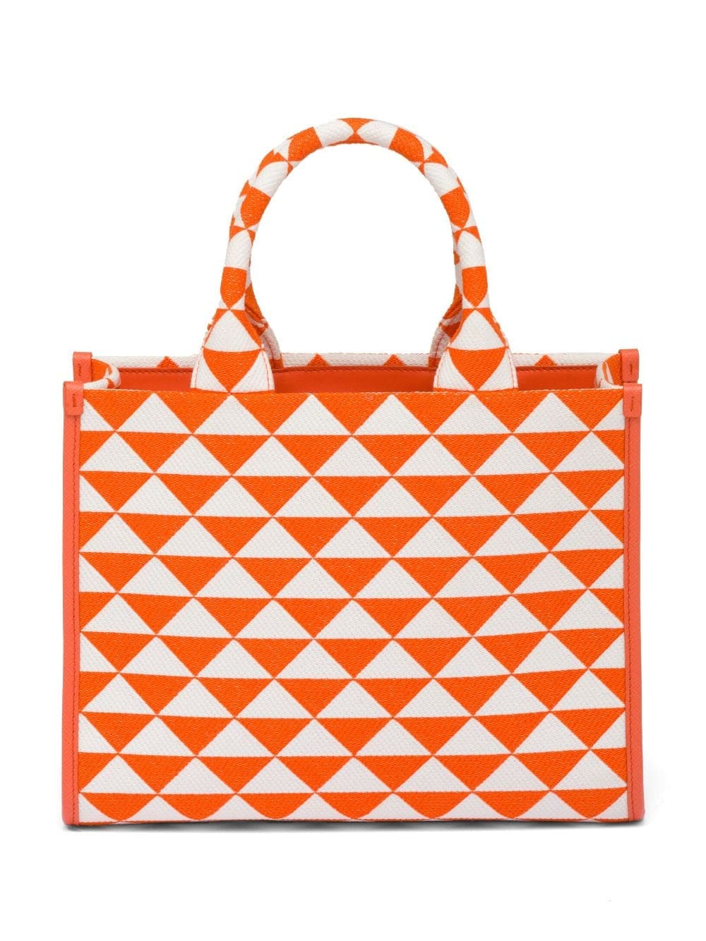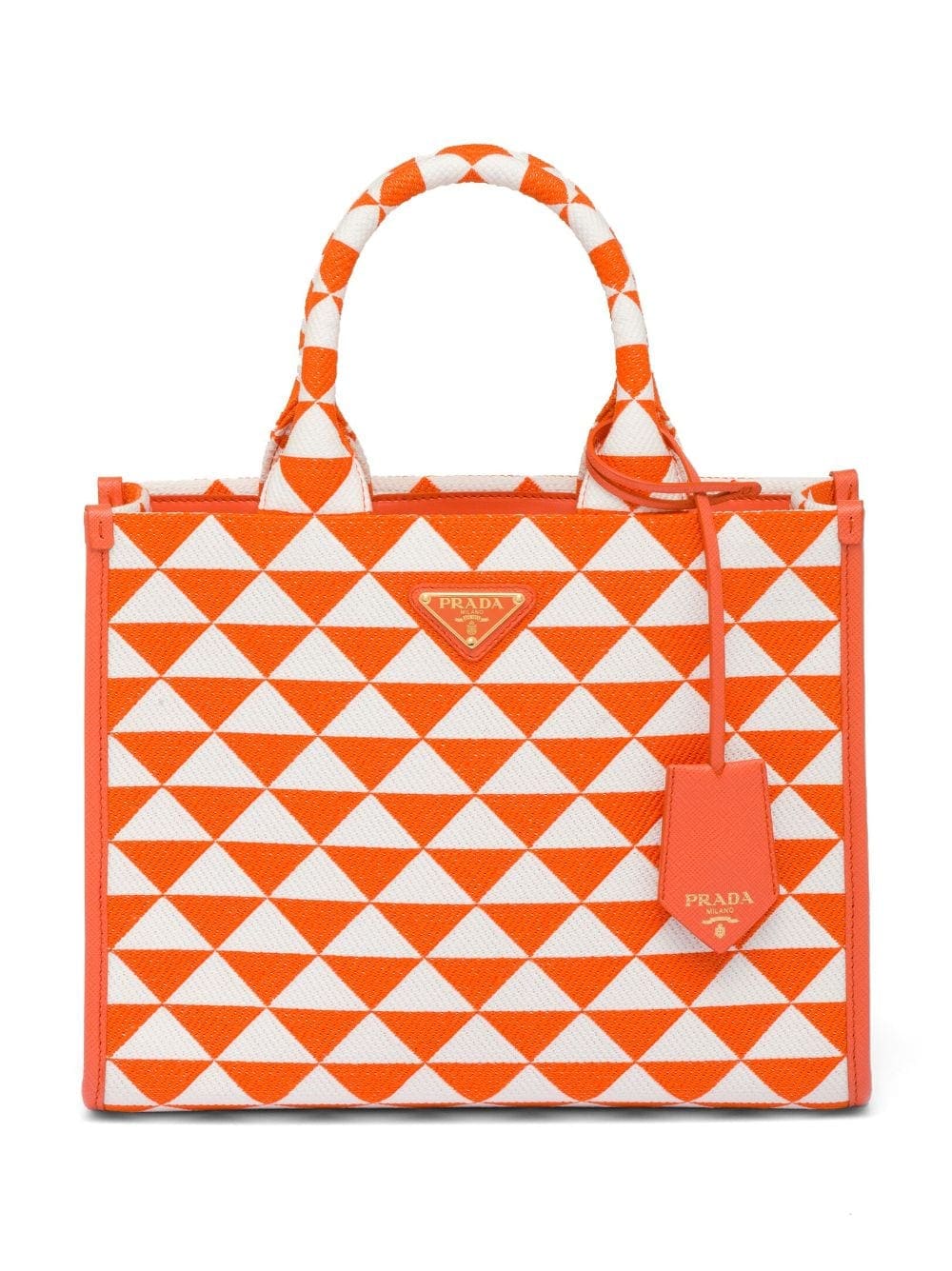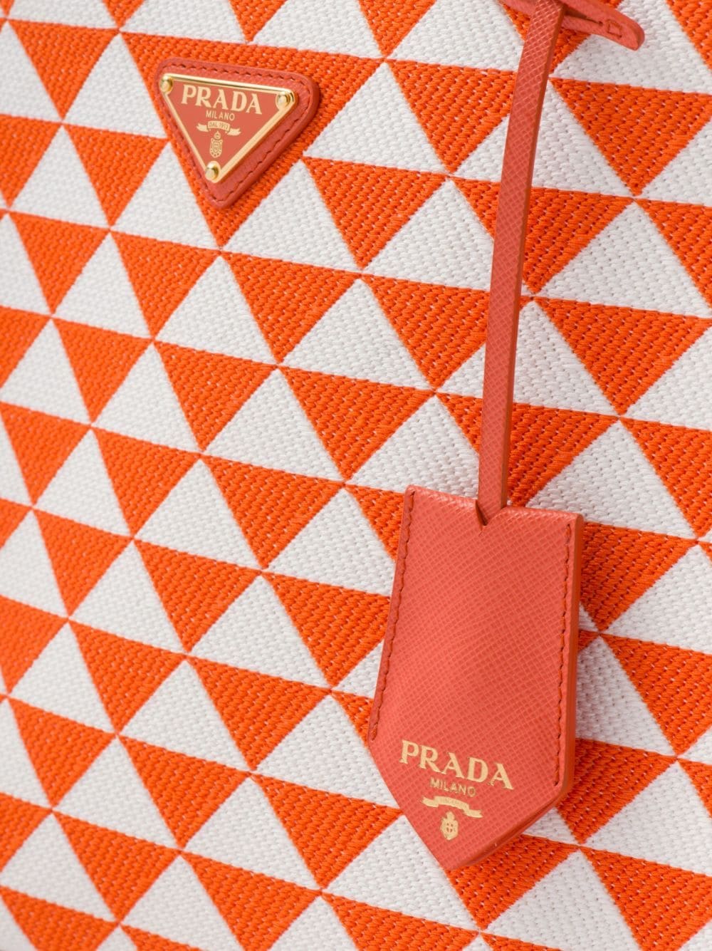 Introduced on trunks designed by Mario Prada, the triangle shape boasts a universal, minimalist form that is reinvented in a different way each season. The geometric motif is transformed into a modernist pattern for this Symbole tote bag.