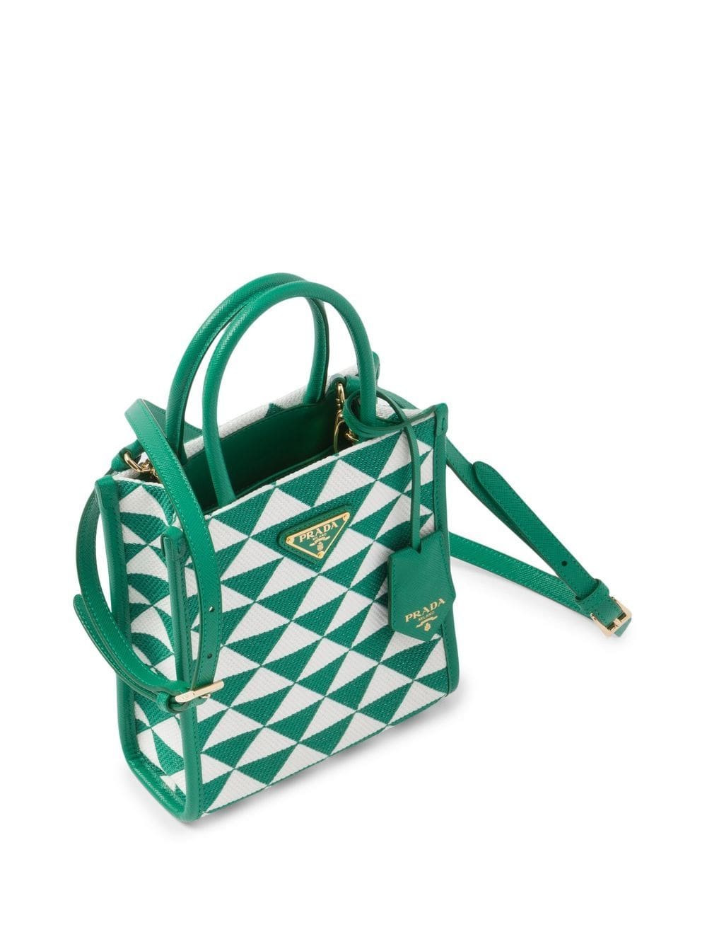 Symole logo-plaque tote bag from PRADA featuring avocado green, white, leather, triangle logo, two top handles, internal patch pocket and adjustable shoulder strap.