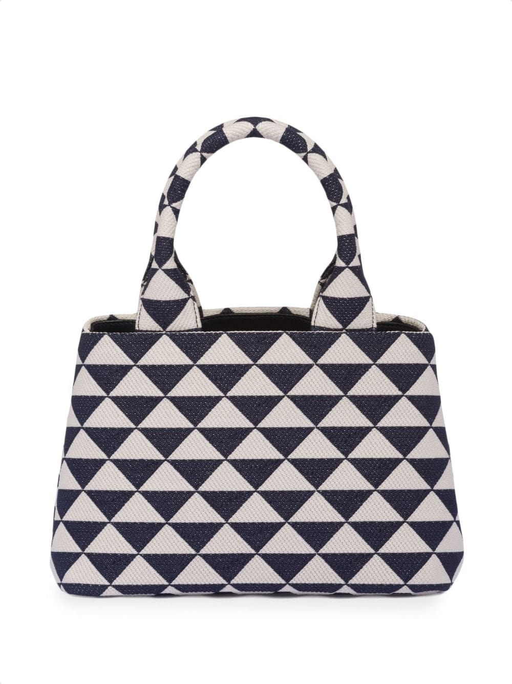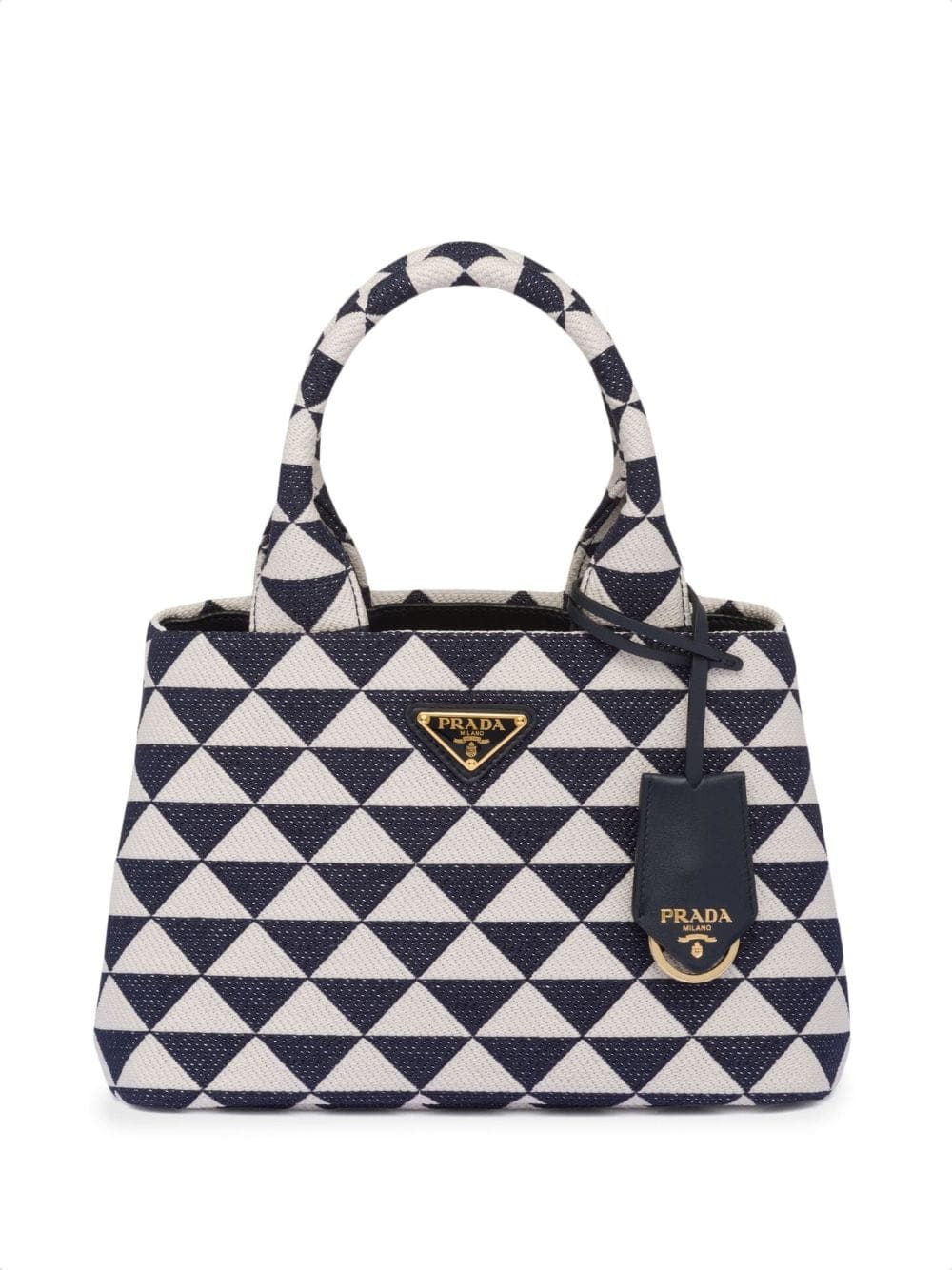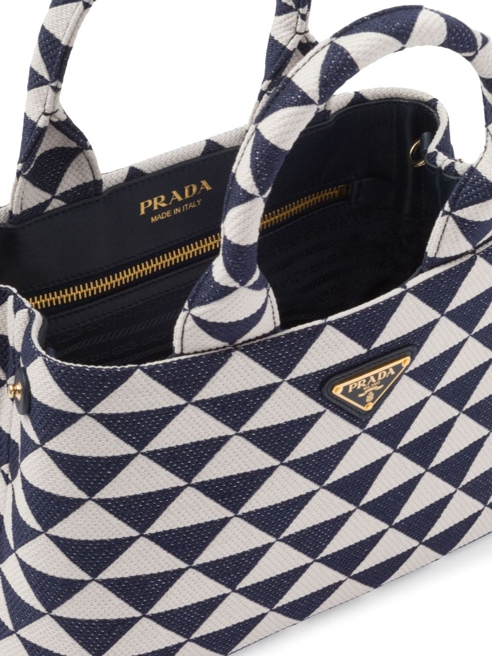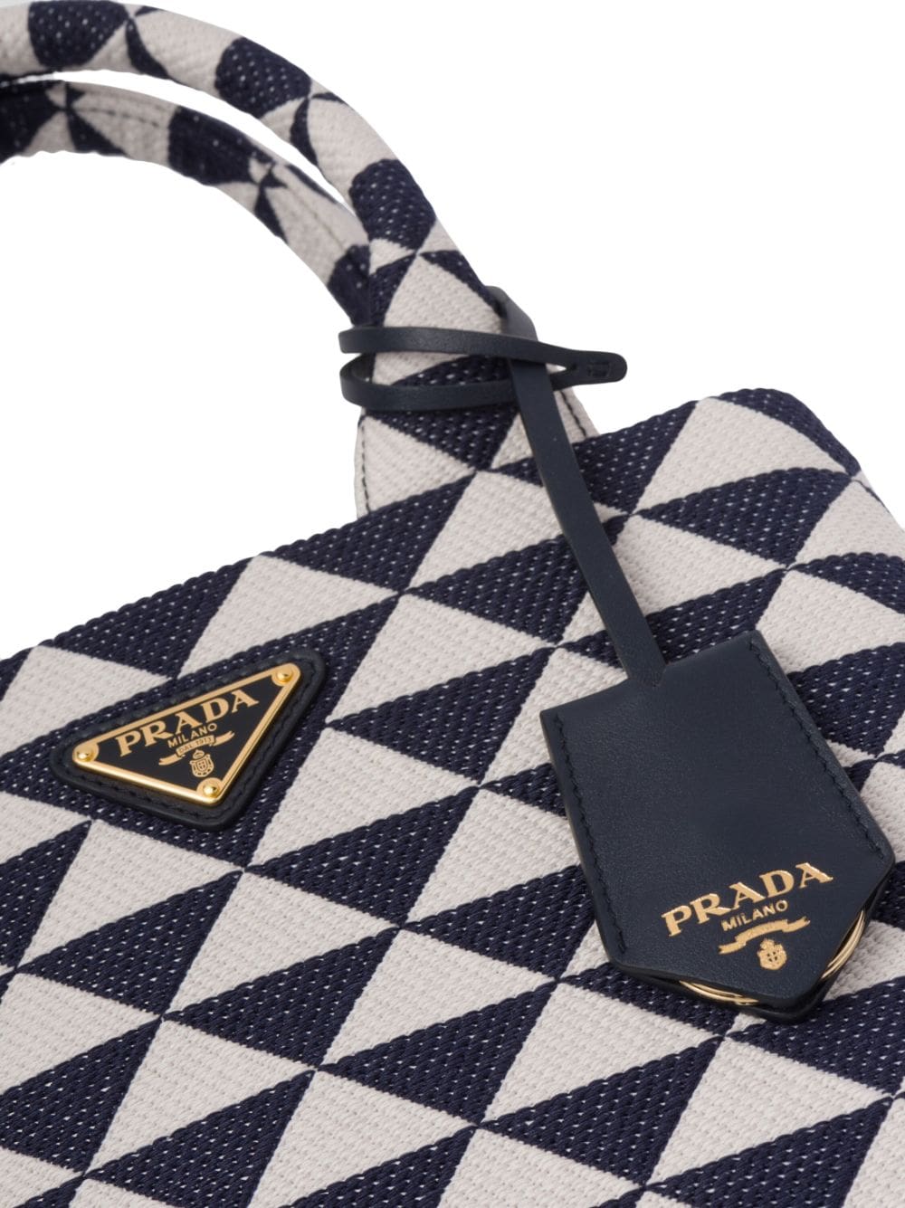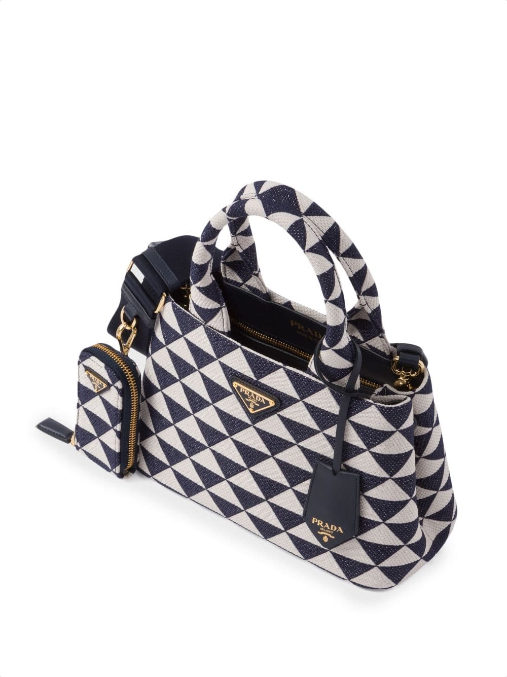 Prada Symbole embroidered tote bag from PRADA featuring chalk white, navy blue, leather, canvas, geometric-pattern print, adjustable detachable shoulder strap, circular top handles, gold-tone hardware, enamel triangle logo, hanging key fob, removable pouch and internal zip-fastening pocket.