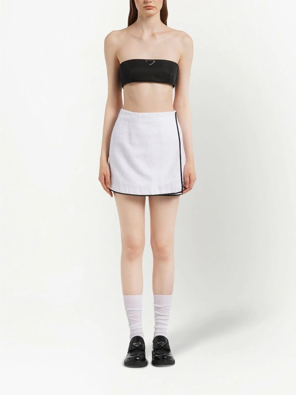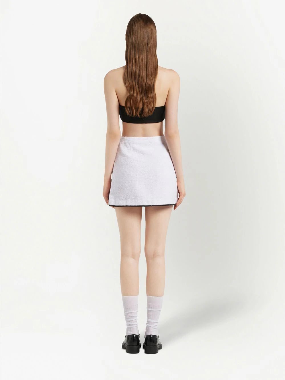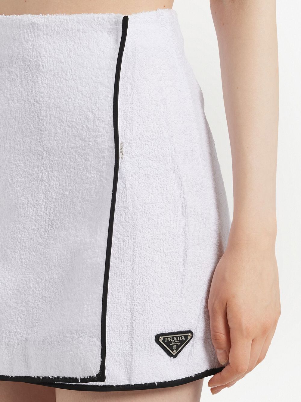 Prada draws inspiration from retro sportswear for this mini skirt. Crafted from cotton with a terry-cloth effect, it is accented with a contrasting piped trim, and the house's iconic enamel logo is discreetly sewn on the seam.
