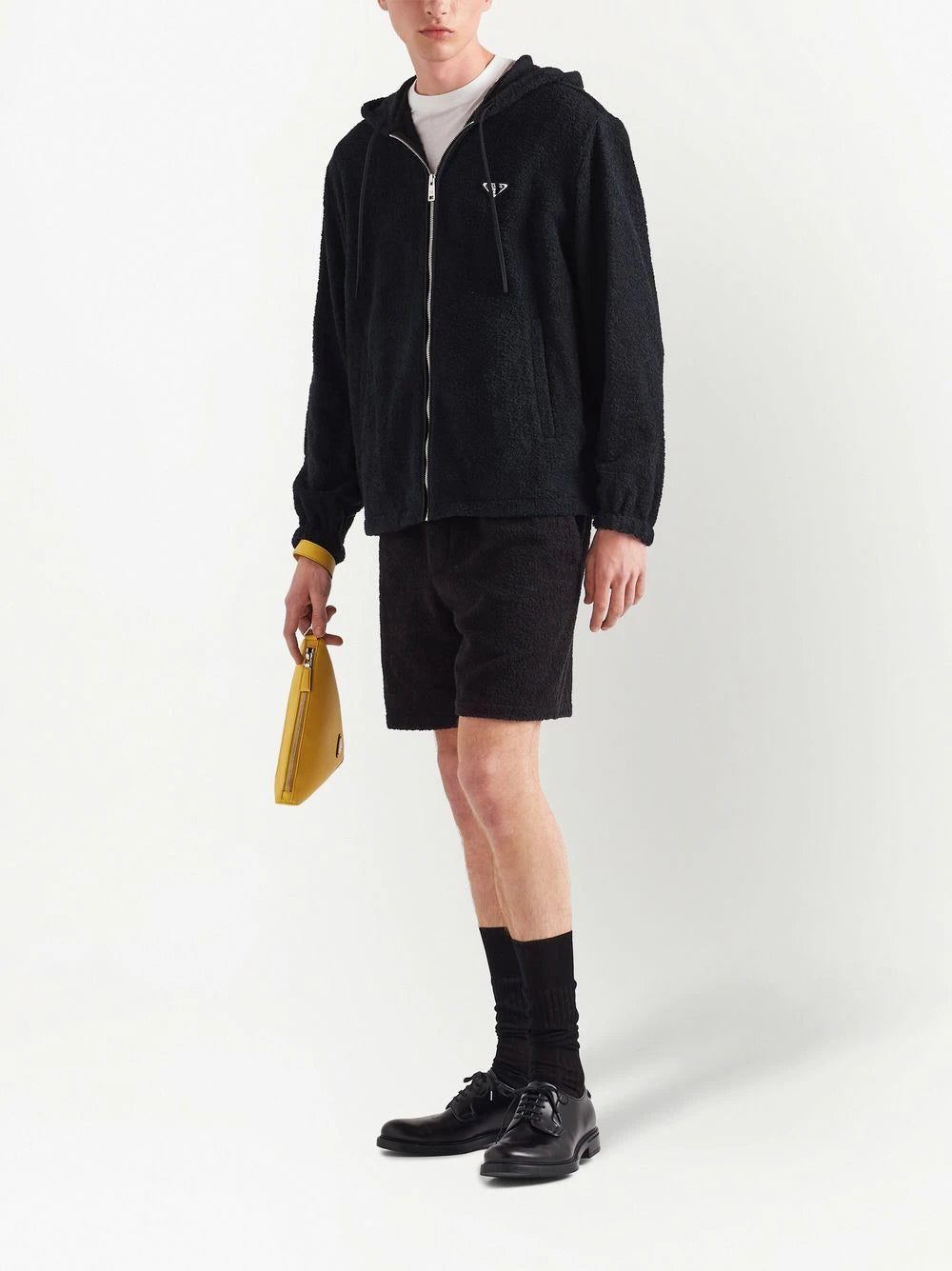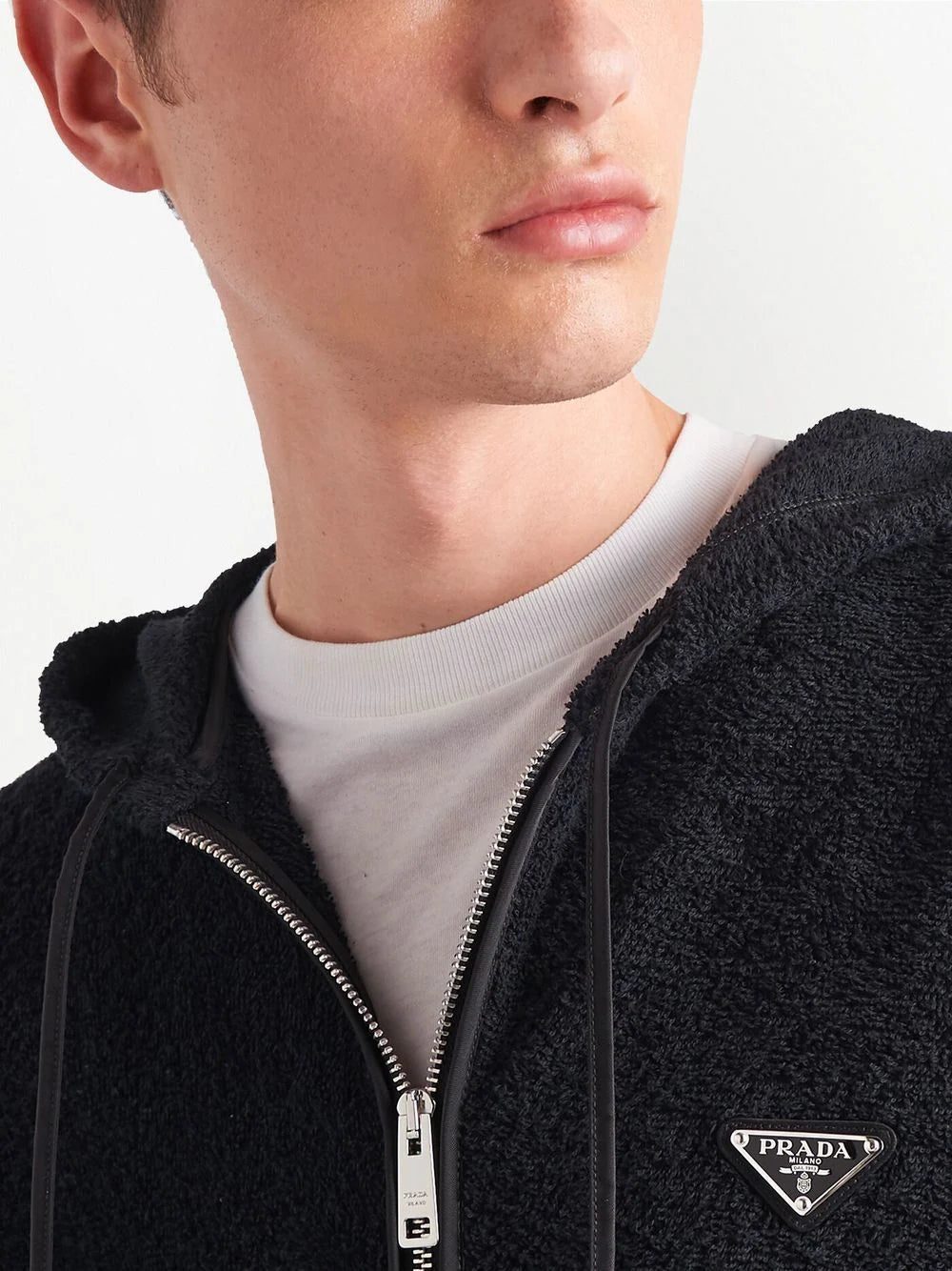 Prada plays with texture this season as showcased on this blouson jacket that features a soft terrycloth construction.