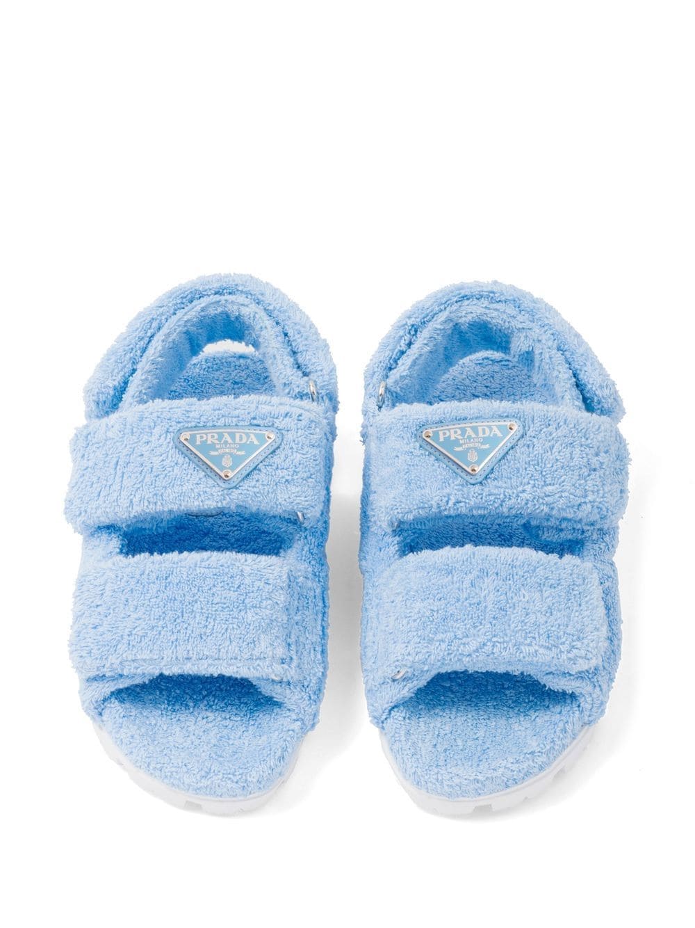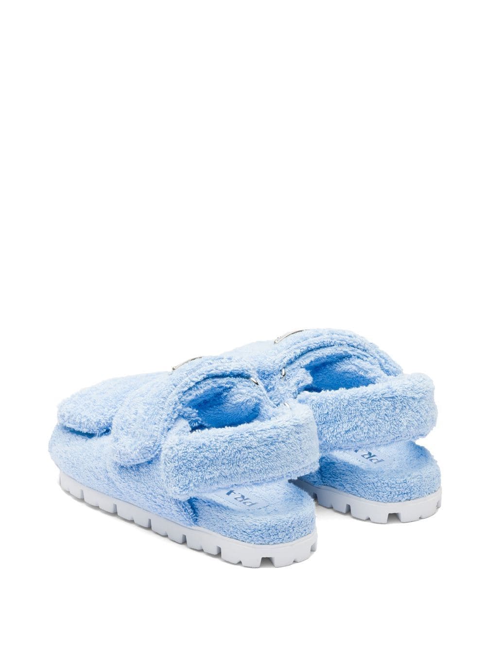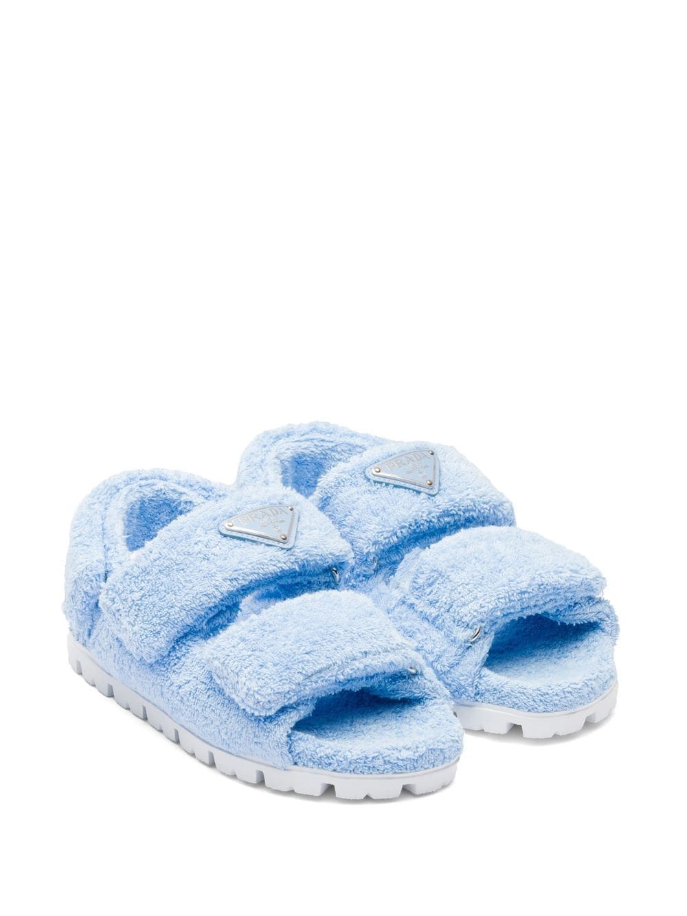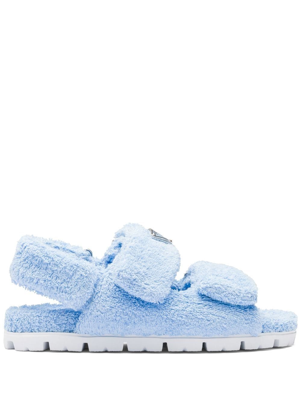 Prada's terry slides boast a modern design based on comfort. This fluffy pair comes equipped with a touch-strap fastening slingback strap, enhancing their wearability. Whilst they're finished with the brand's iconic triangle logo to the front - for a final stamp of recognition.