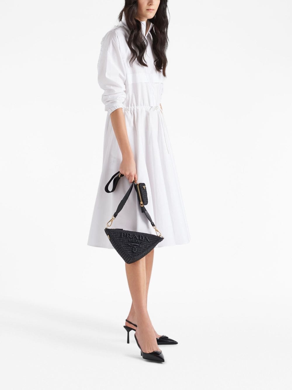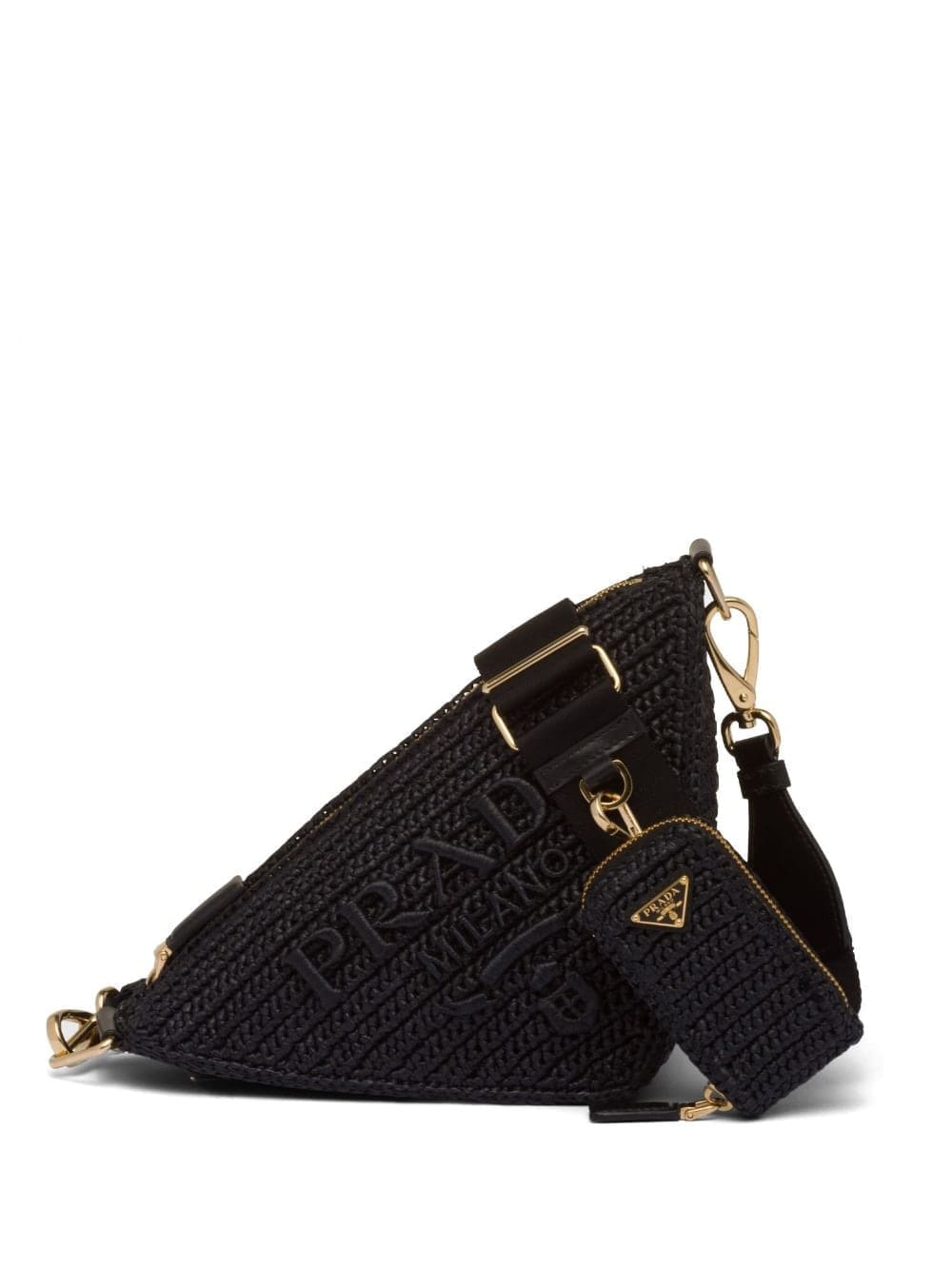 Prada's exploration of the triangle inspires new geometric shapes and original interpretations of the House's historic code that was first introduced on trunks designed by Mario Prada. An expression of uniqueness and modernity, its iconic line inspires the shape of this raffia-effect yarn shoulder bag that is accented with a modular shoulder strap. The logo also appears as a precious embroidered detail on the front.