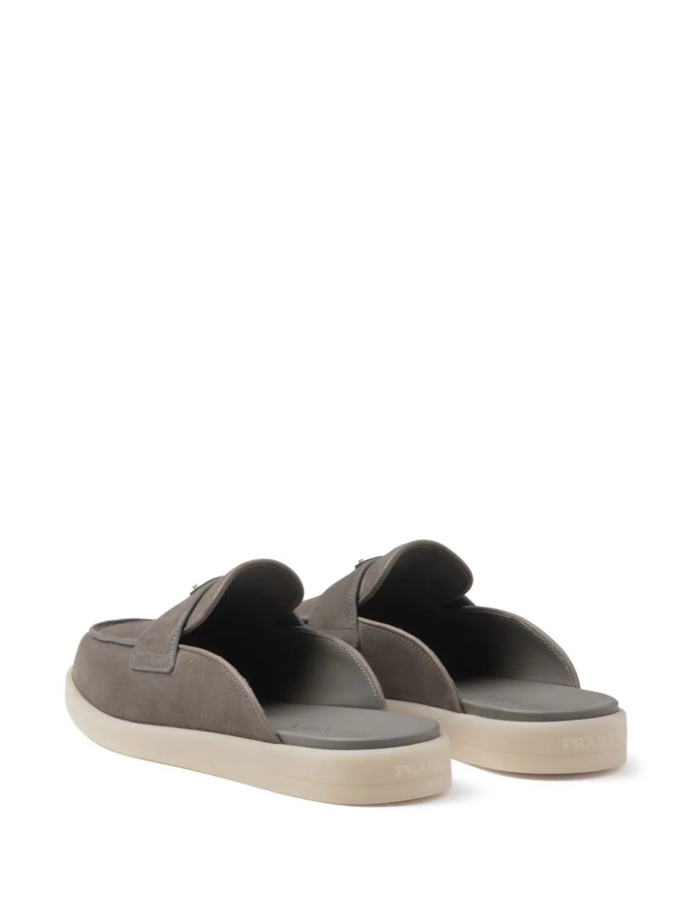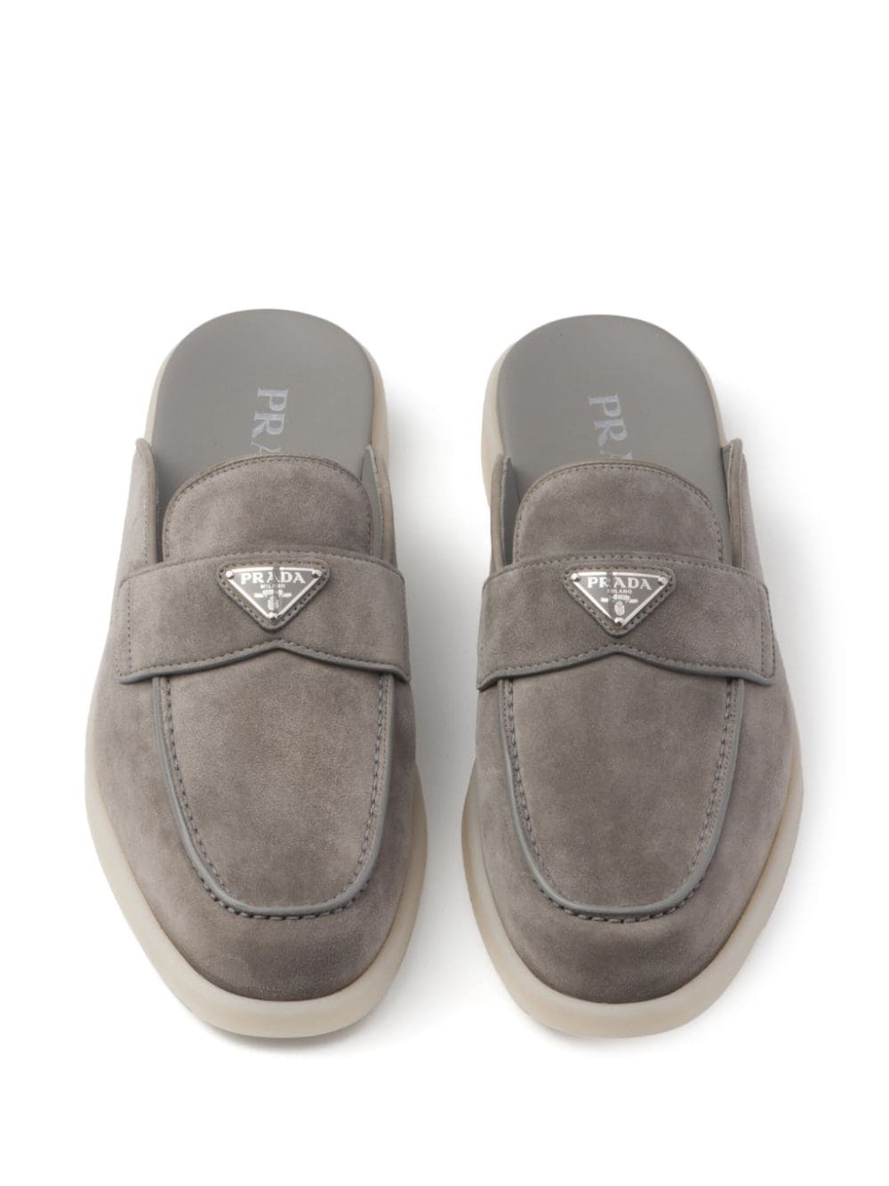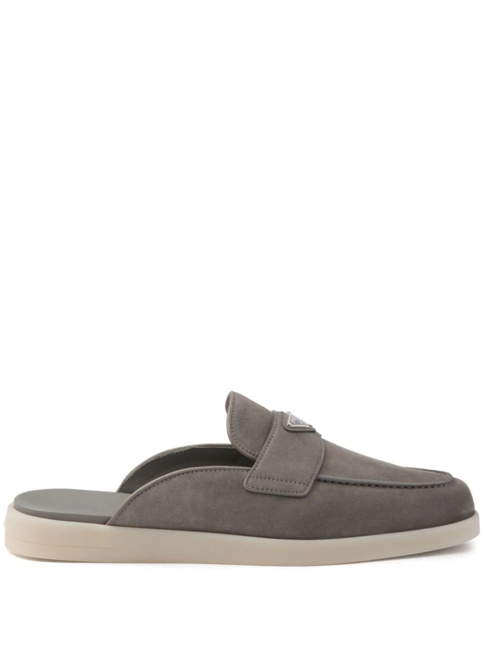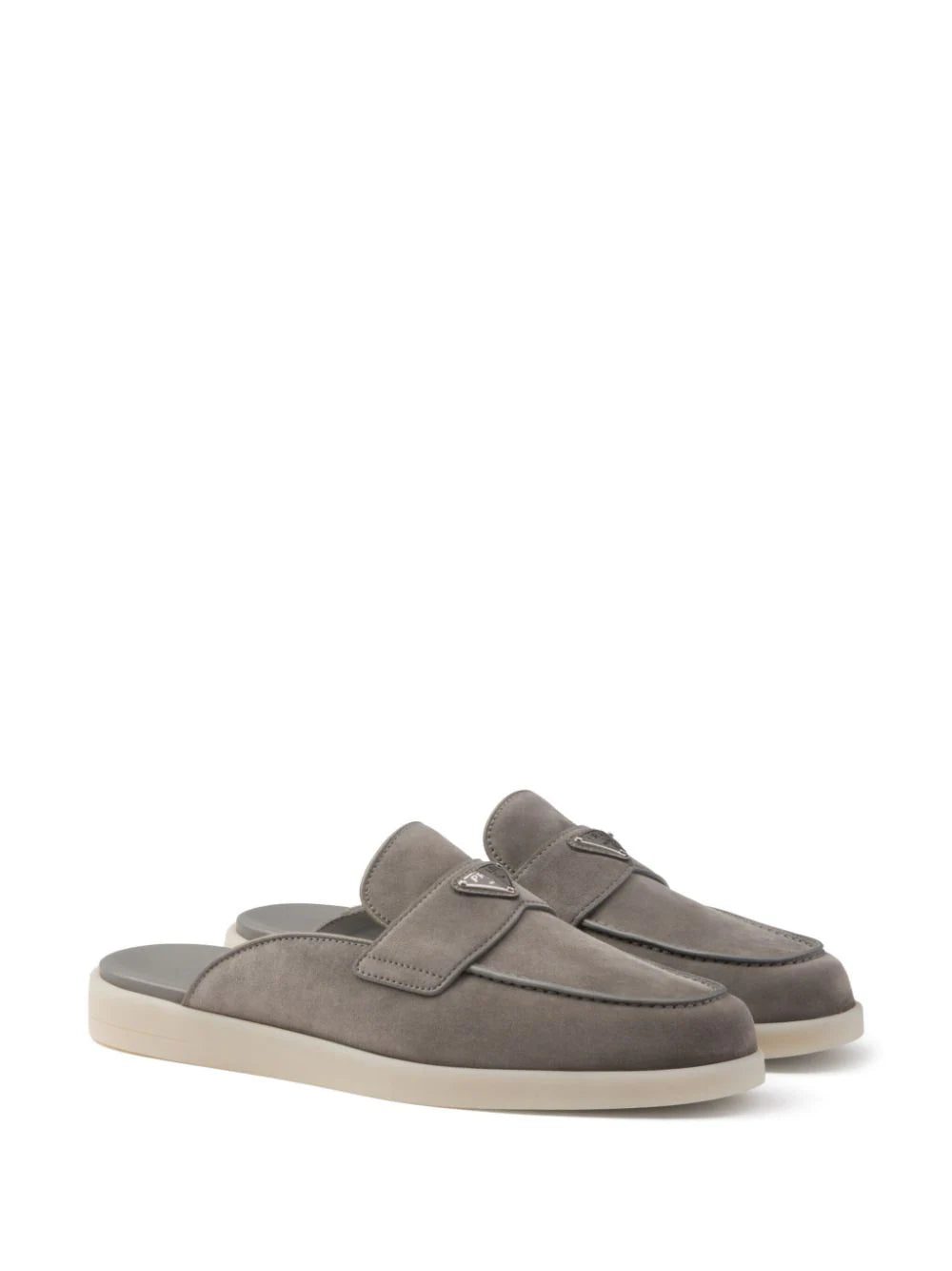 Prada's loafers are an ode to minimalism. They’re crafted from grey suede to an easy and comfortable backless silhouette, adorned with the brand's iconic enamel triangle logo at the upper penny straps.