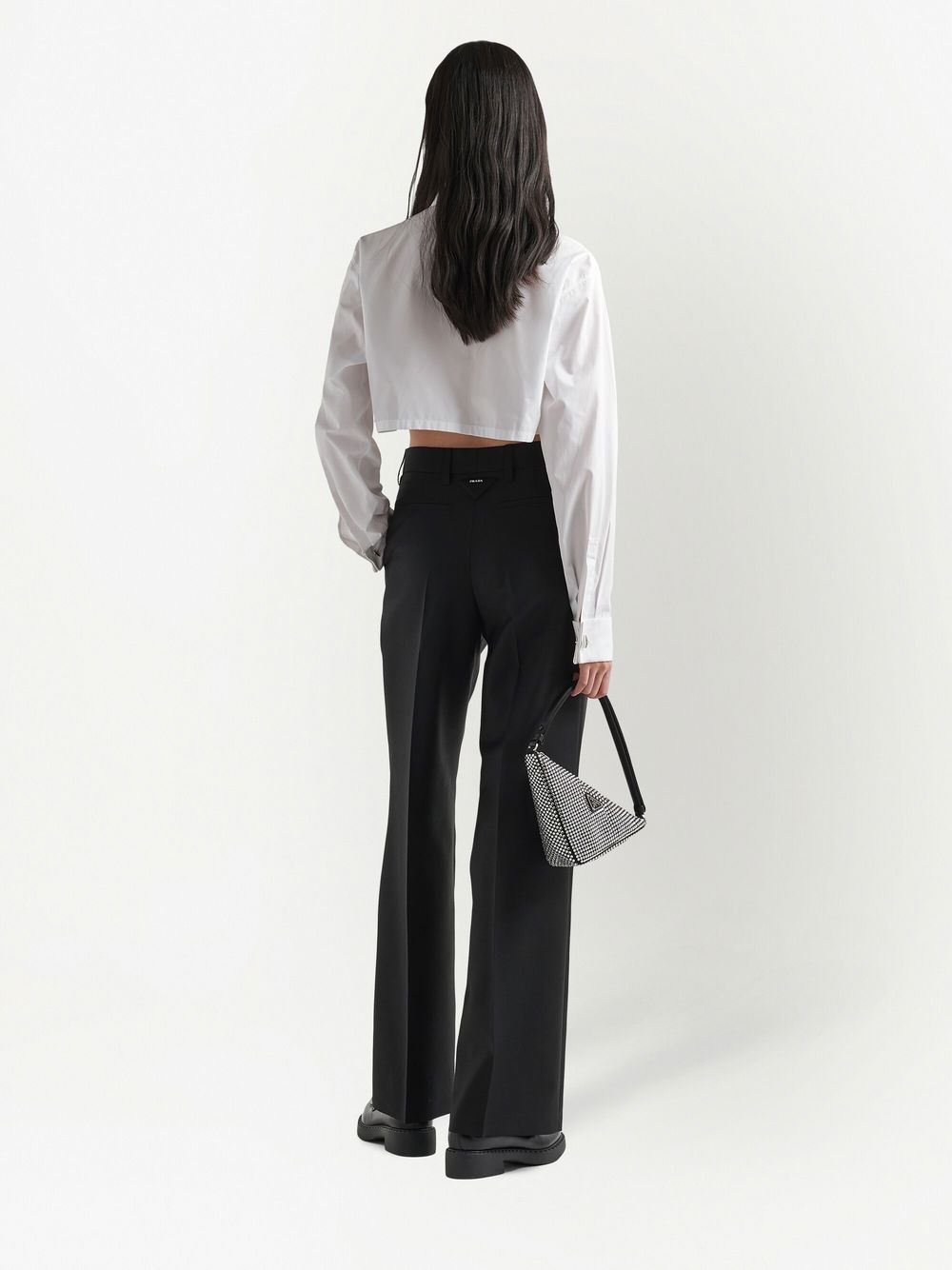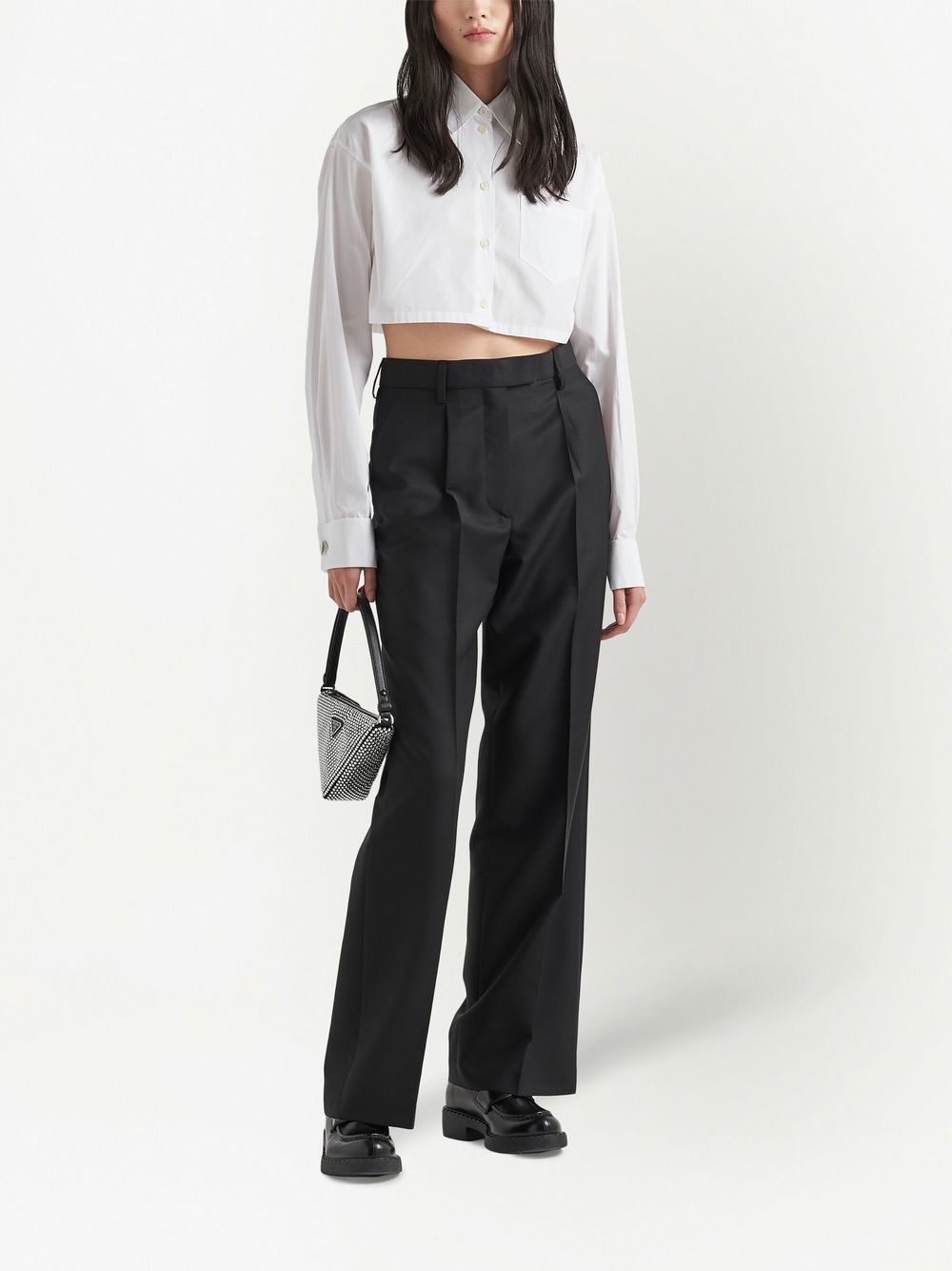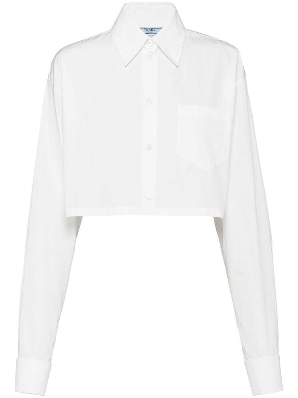 cropped long-sleeved shirt from PRADA featuring logo-embossed buttons, cloud white, cotton, cropped, classic collar, front button fastening, long sleeves and chest patch pocket.