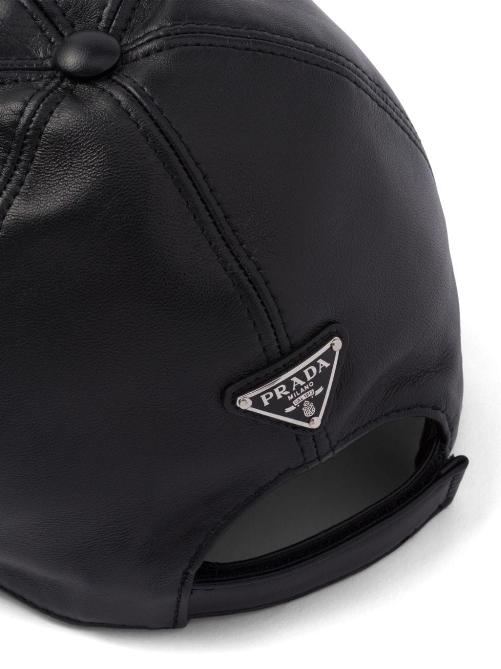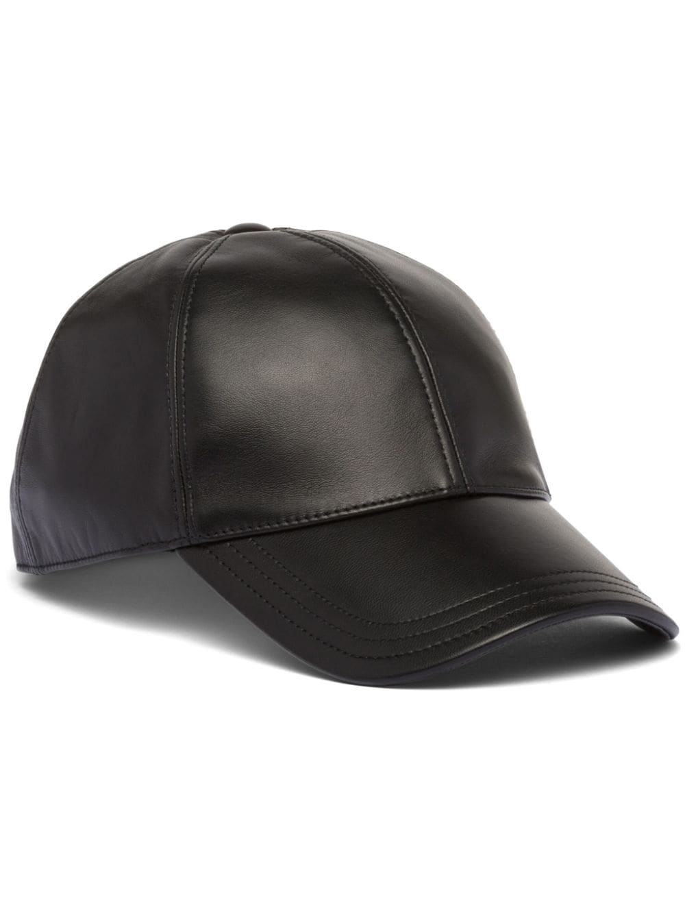 Prada uses its refined Italian eye for style to elevate the sporty nature of this black baseball cap. A smooth leather construction combines with a tonal enamelled triangle logo plaque at the back.