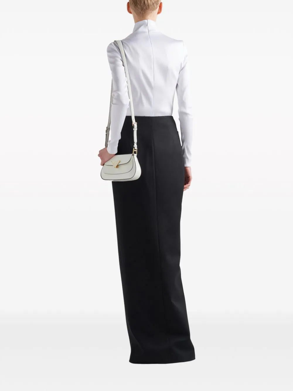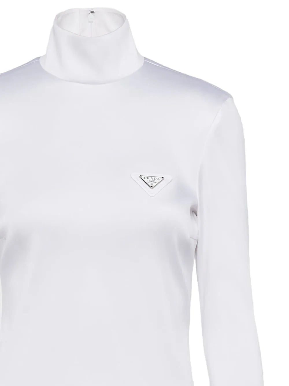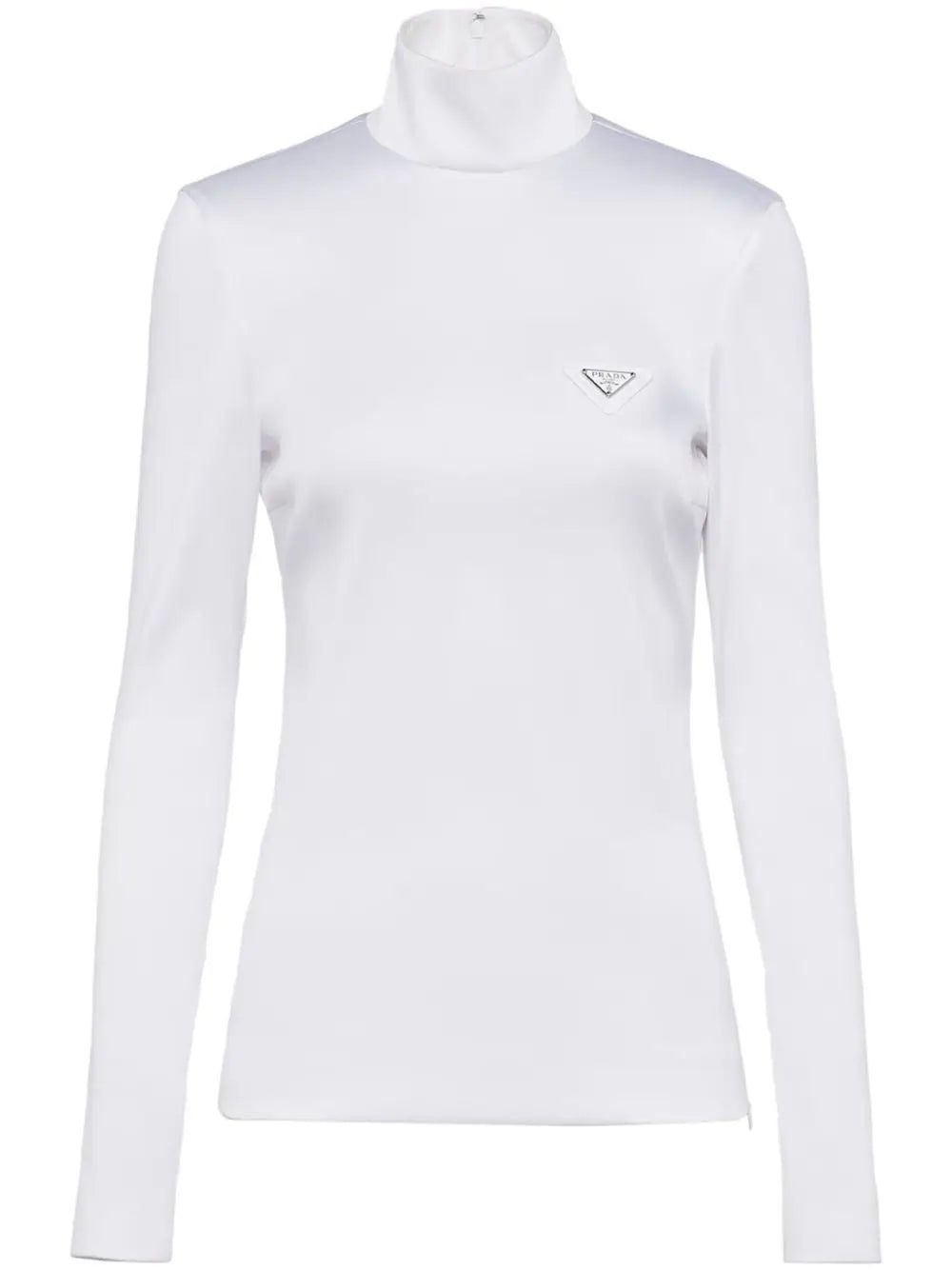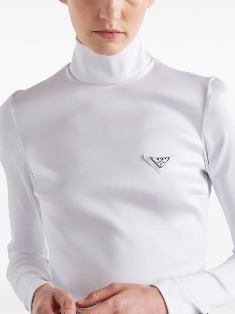 Prada adopts a sports-inspired aesthetic in this white long-sleeved top. It's cut from stretch satin to a sleek silhouette minimally accented with a mock neck and the iconic enamelled metal triangle logo.