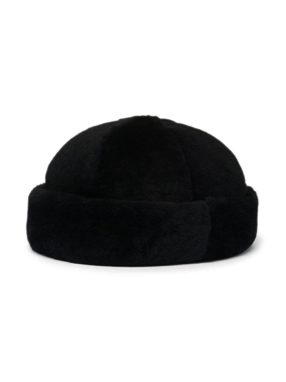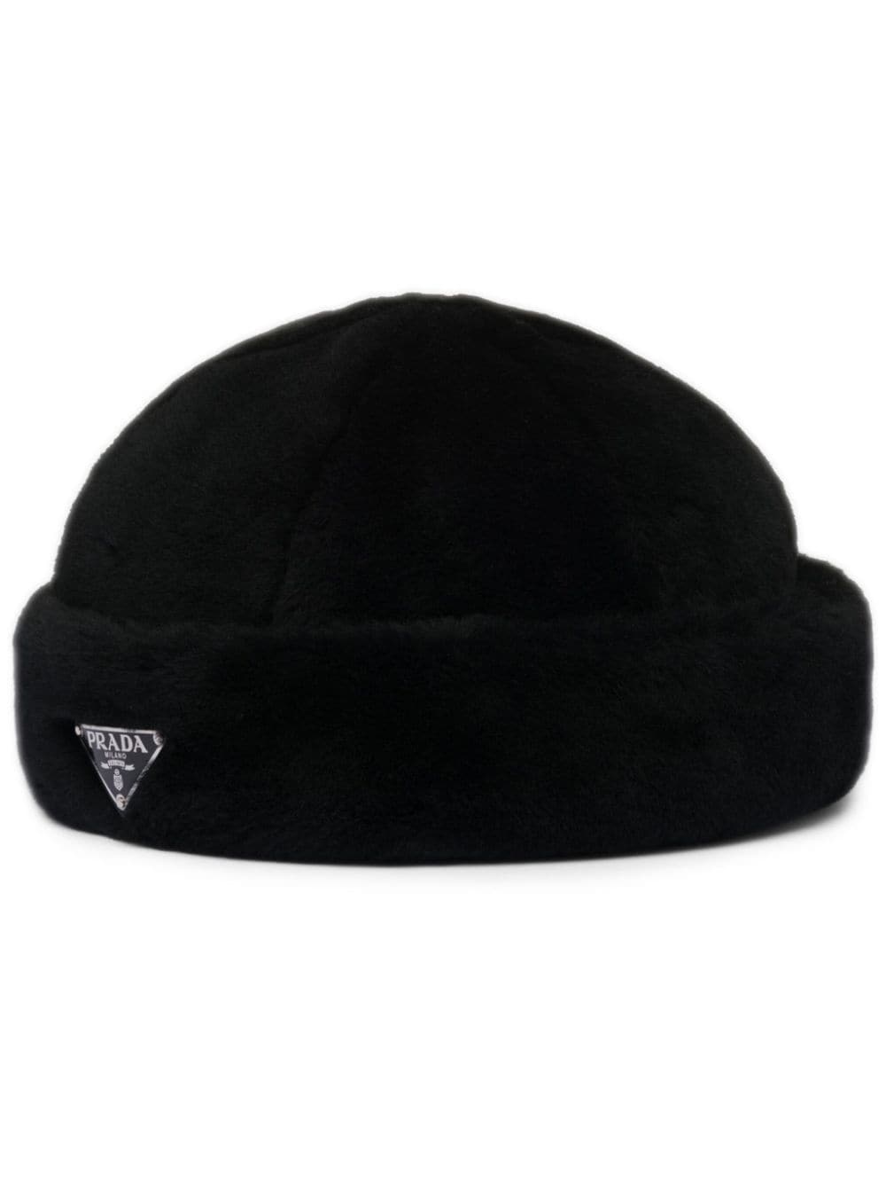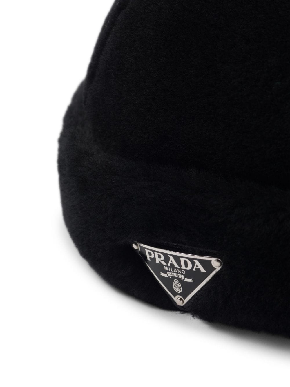 Prada says its iconic triangle logo is ‘a shape that resonates without words.’ An enamelled version of the emblem is appliquéd at the brim of this black shearling beanie.